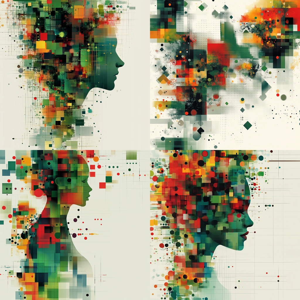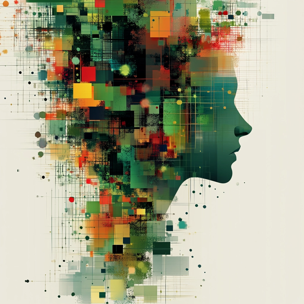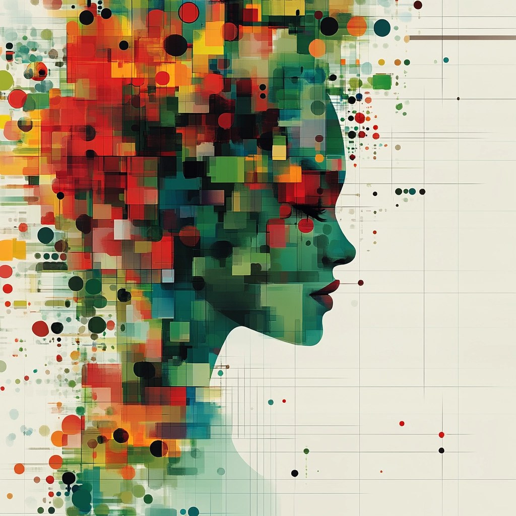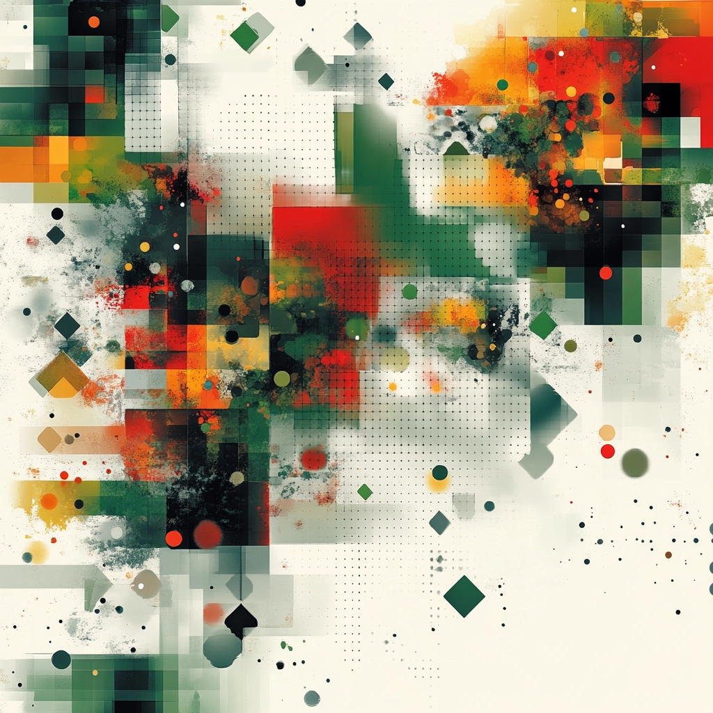 The artwork employs scattered geometric shapes with vivid hues. Variations in size create a sense of depth, and fragmented textures add complexity to the spatial composition.
