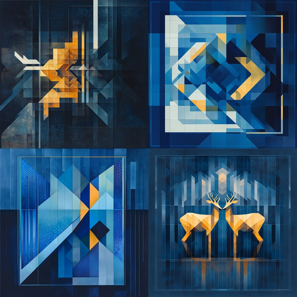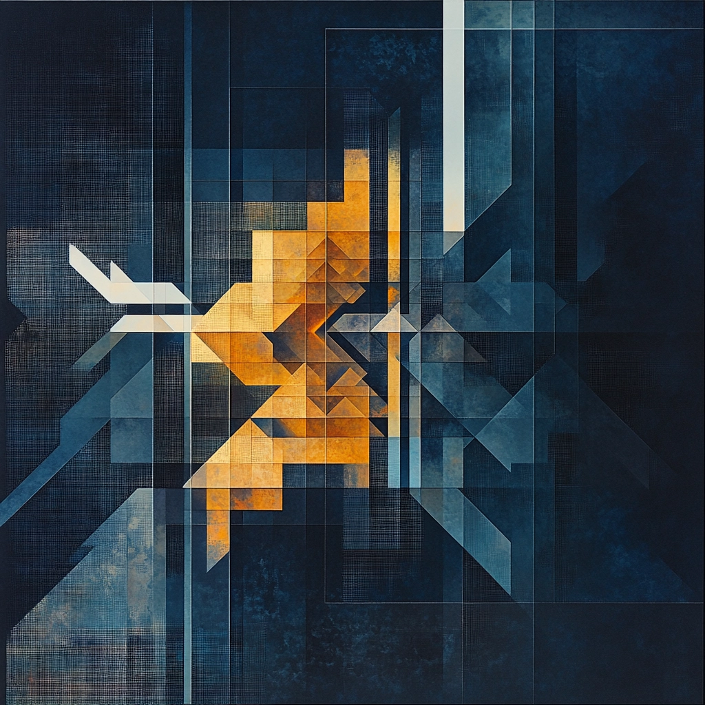 The design employs sharp angular shapes rendered in rich dark blue against vibrant gold hues. A strategic lighting effect emphasizes depth and dimension, while textures vary from smooth gradients to crisp edges, creating a dynamic spatial interaction.
