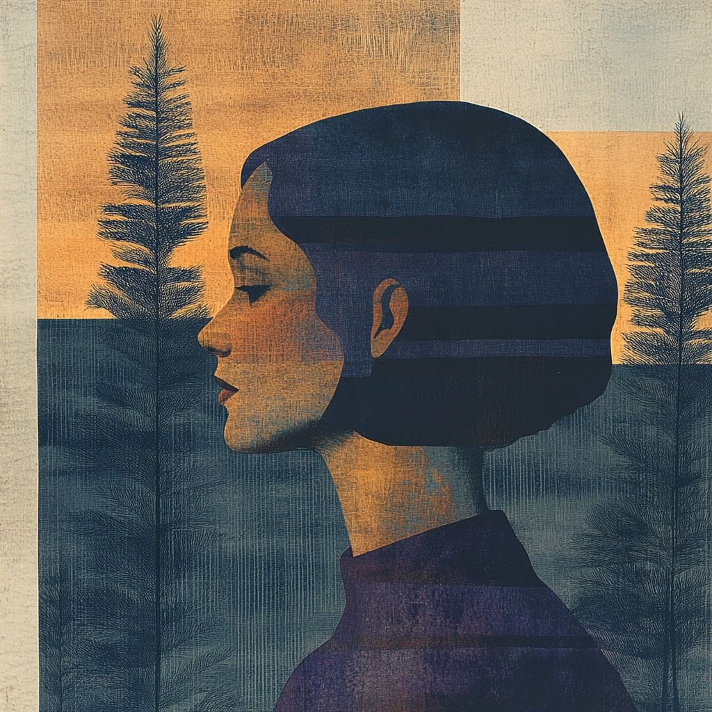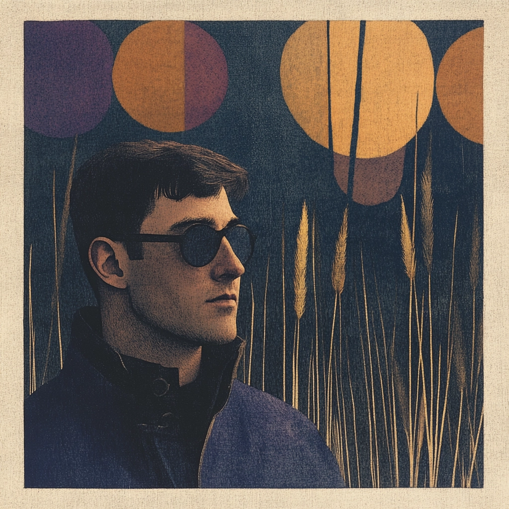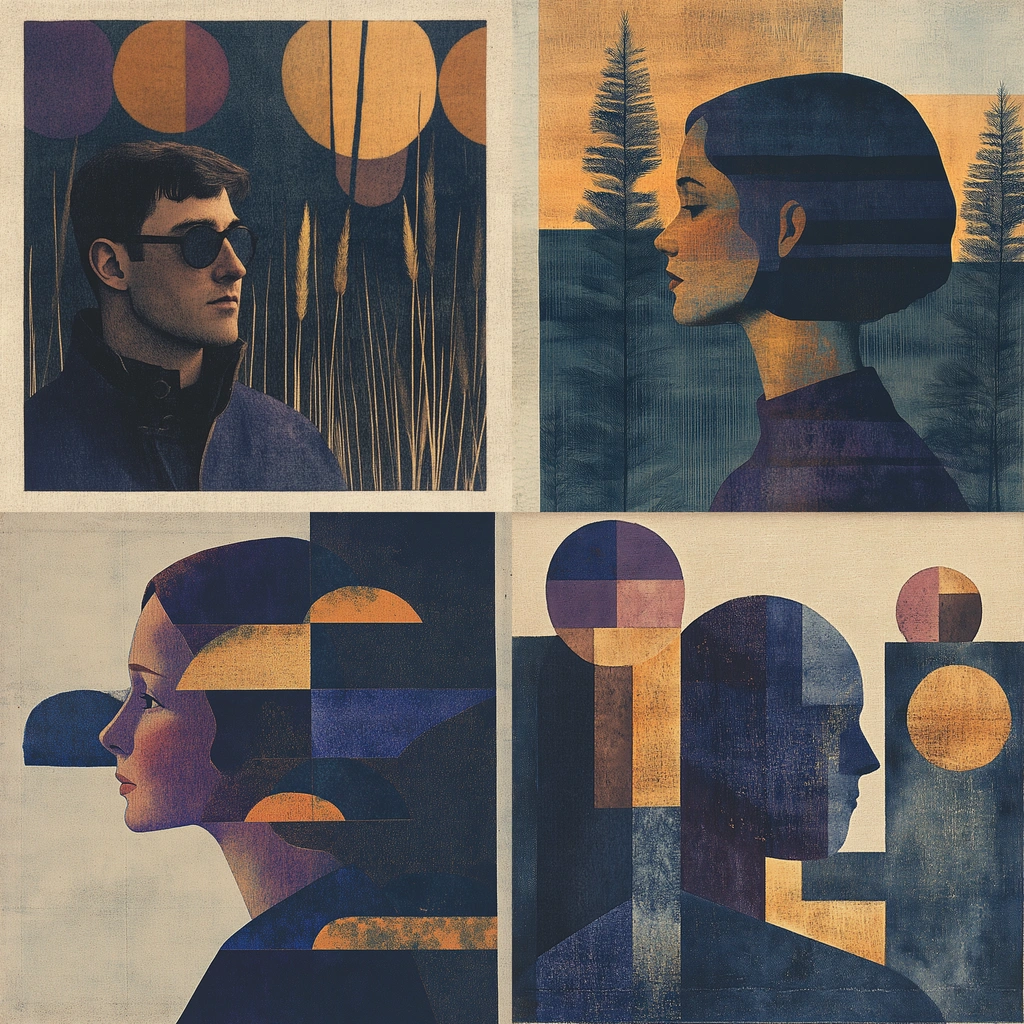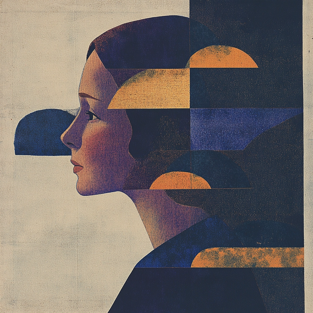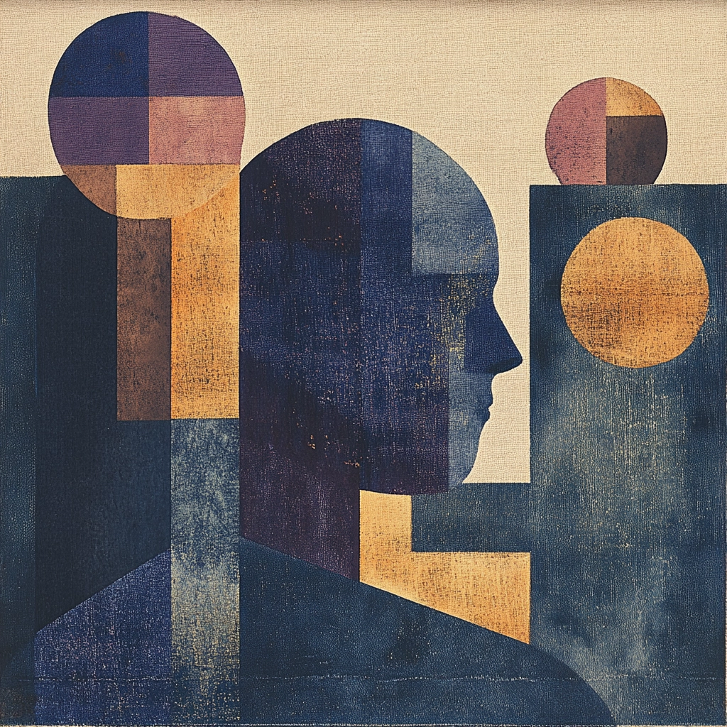 The use of geometric shapes with dark tones creates a structured yet dynamic composition.