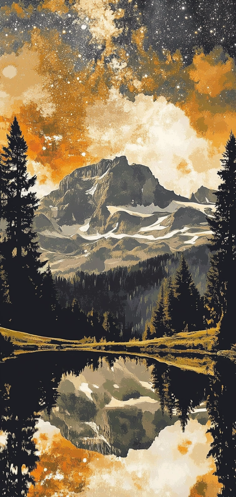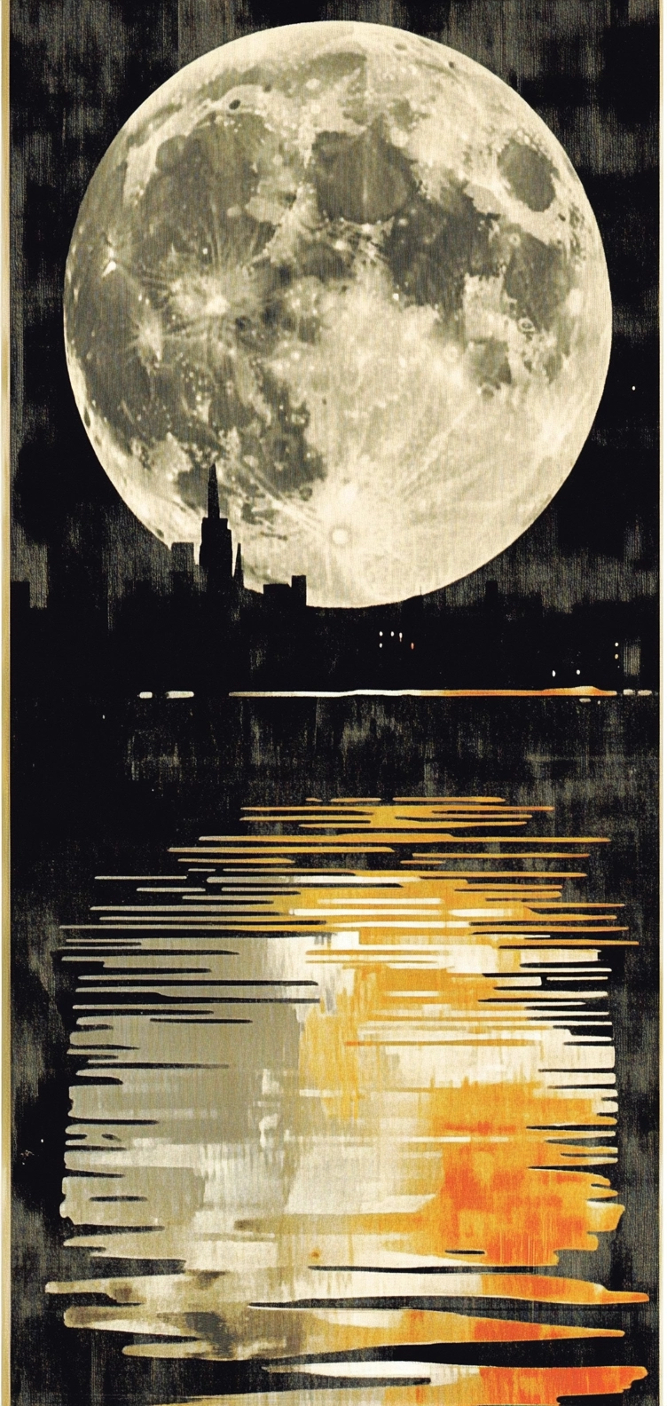 The use of light creates stark contrasts, enhancing the depth in geometric forms and organic elements. Orange and beige interact dynamically against black, while textures range from smooth to stippled, creating visual interest.
