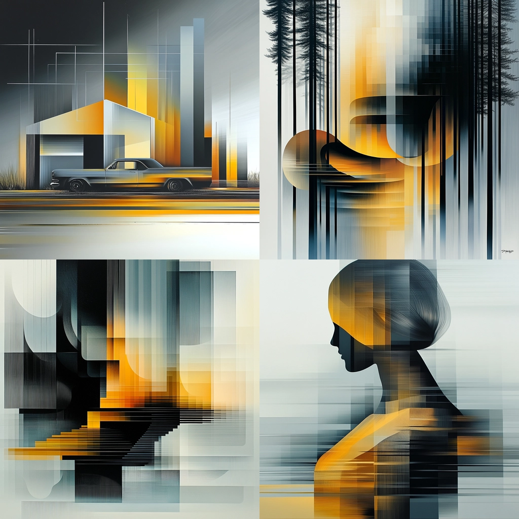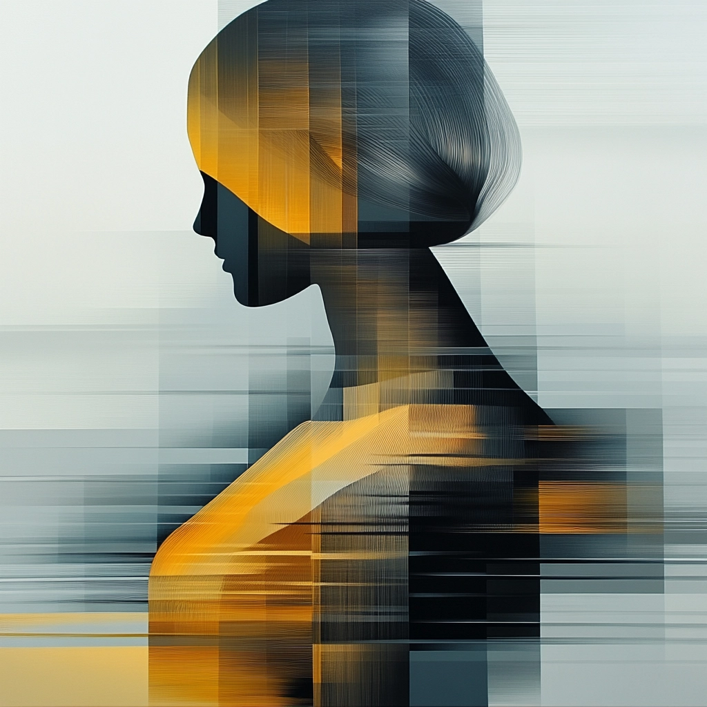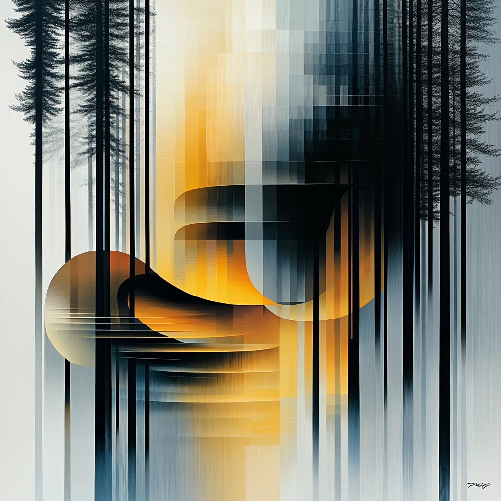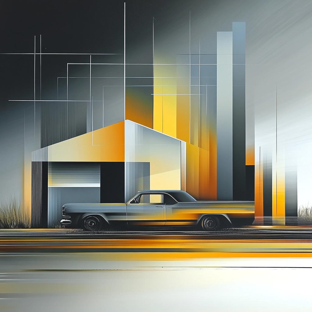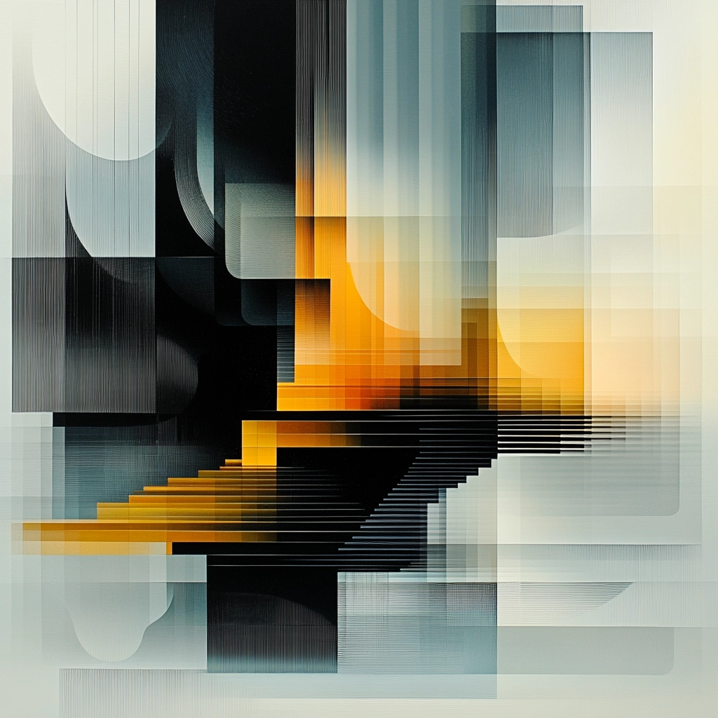 Utilizing bold geometric shapes and gradients, the composition creates stark juxtapositions with a smooth blending of vivid color against muted tones.