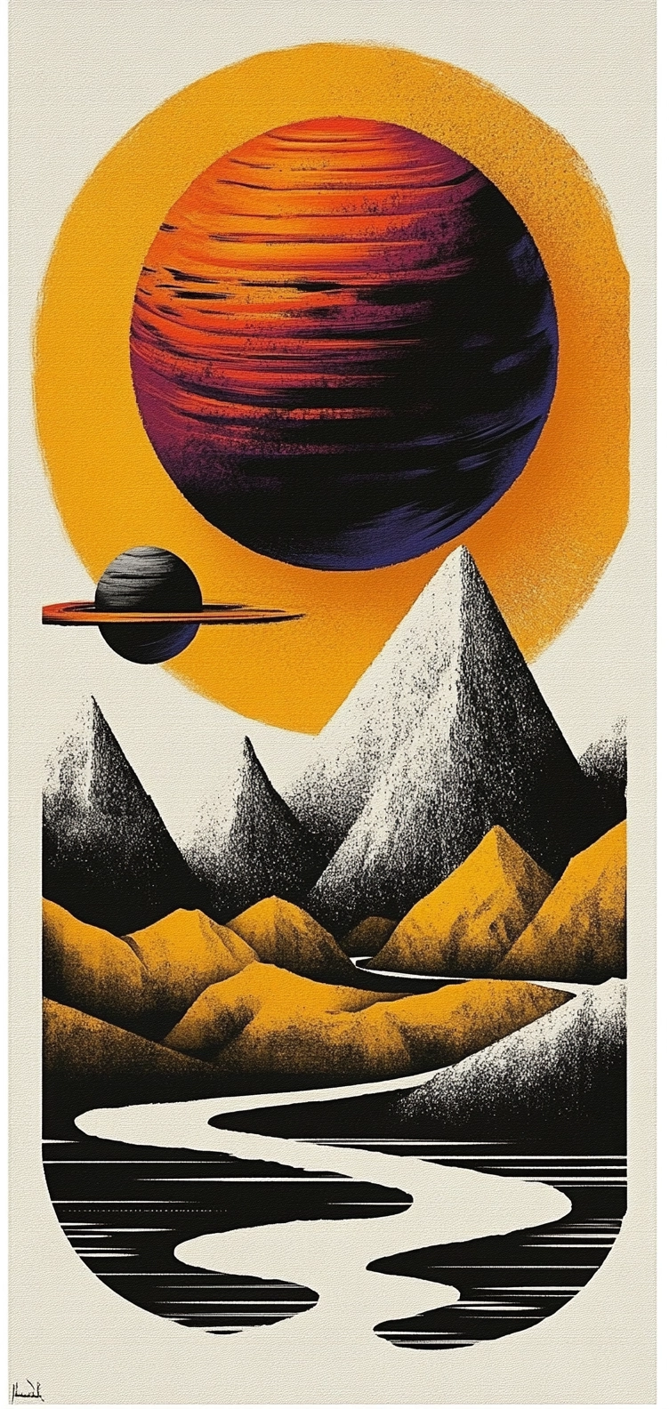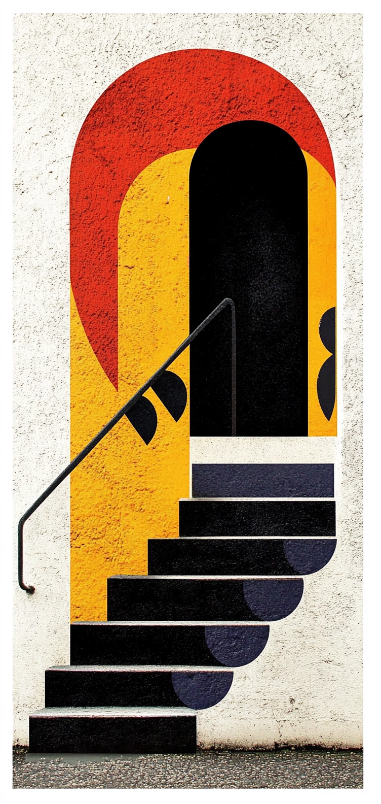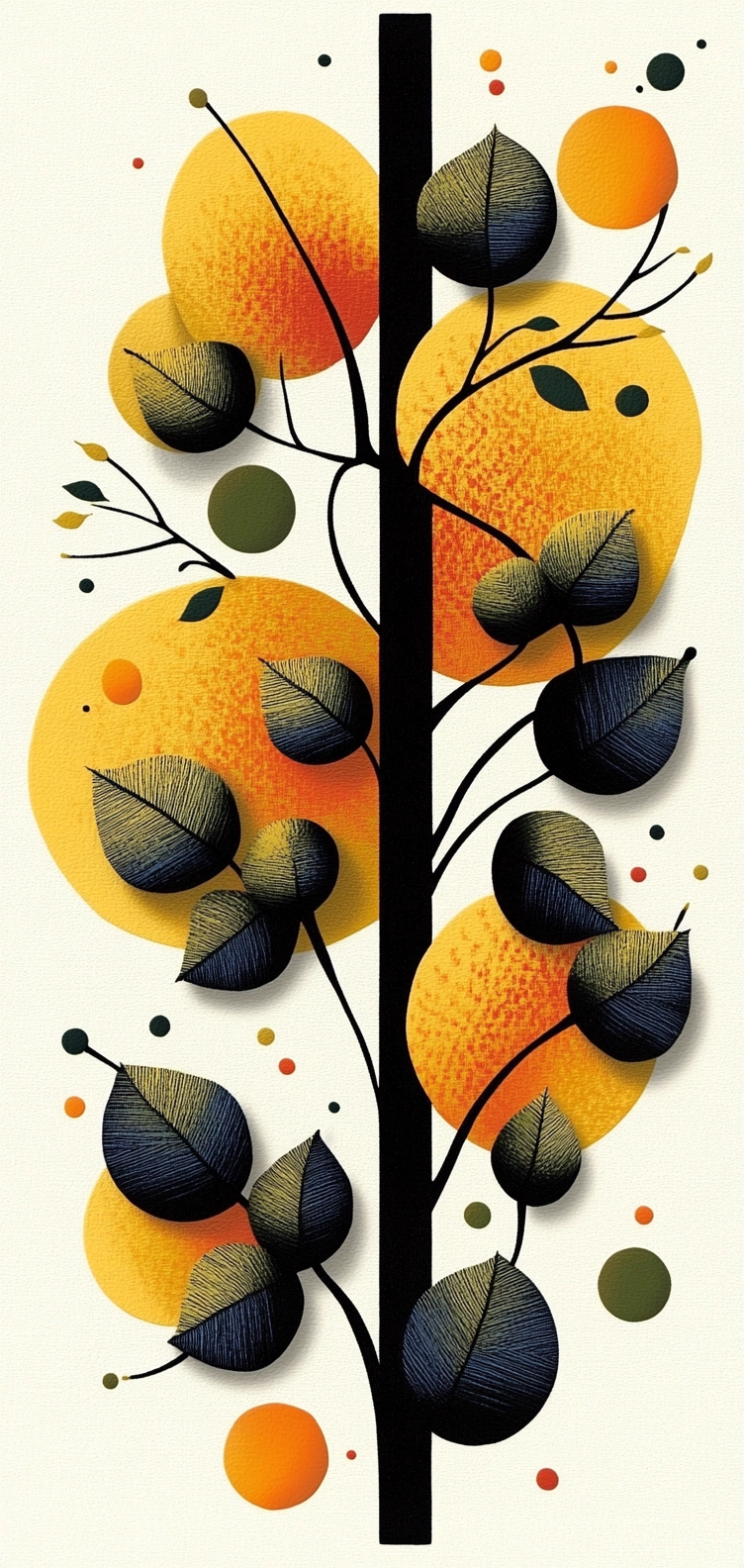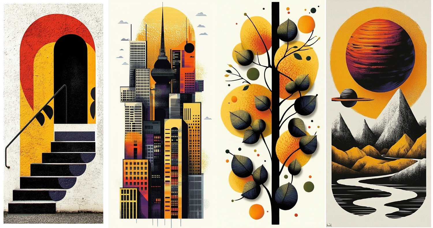 Strong lighting emphasizes contrast between vibrant yellows and oranges with deep blacks. Gradients create a sense of depth and movement. Textures vary from smooth, flat surfaces to intricate patterns, enhancing spatial dynamics.