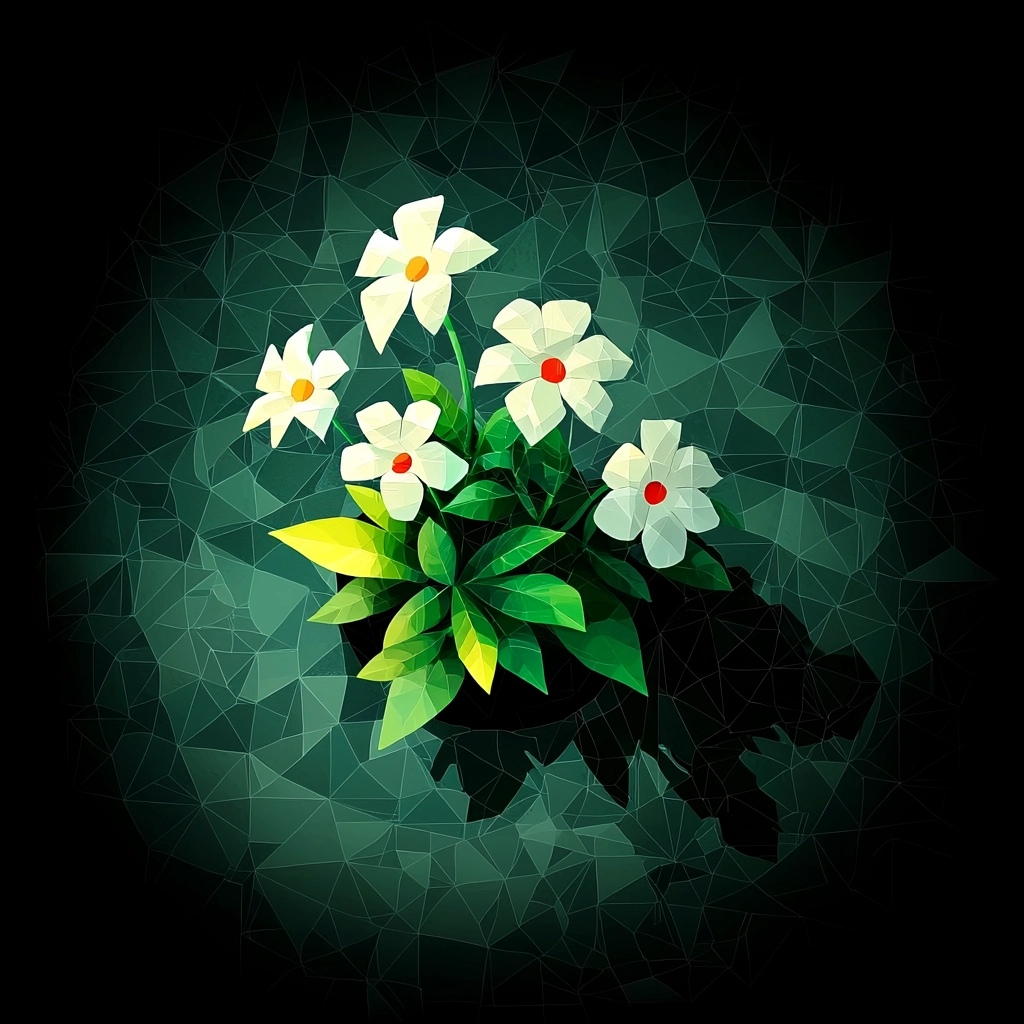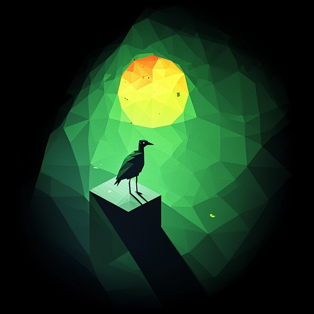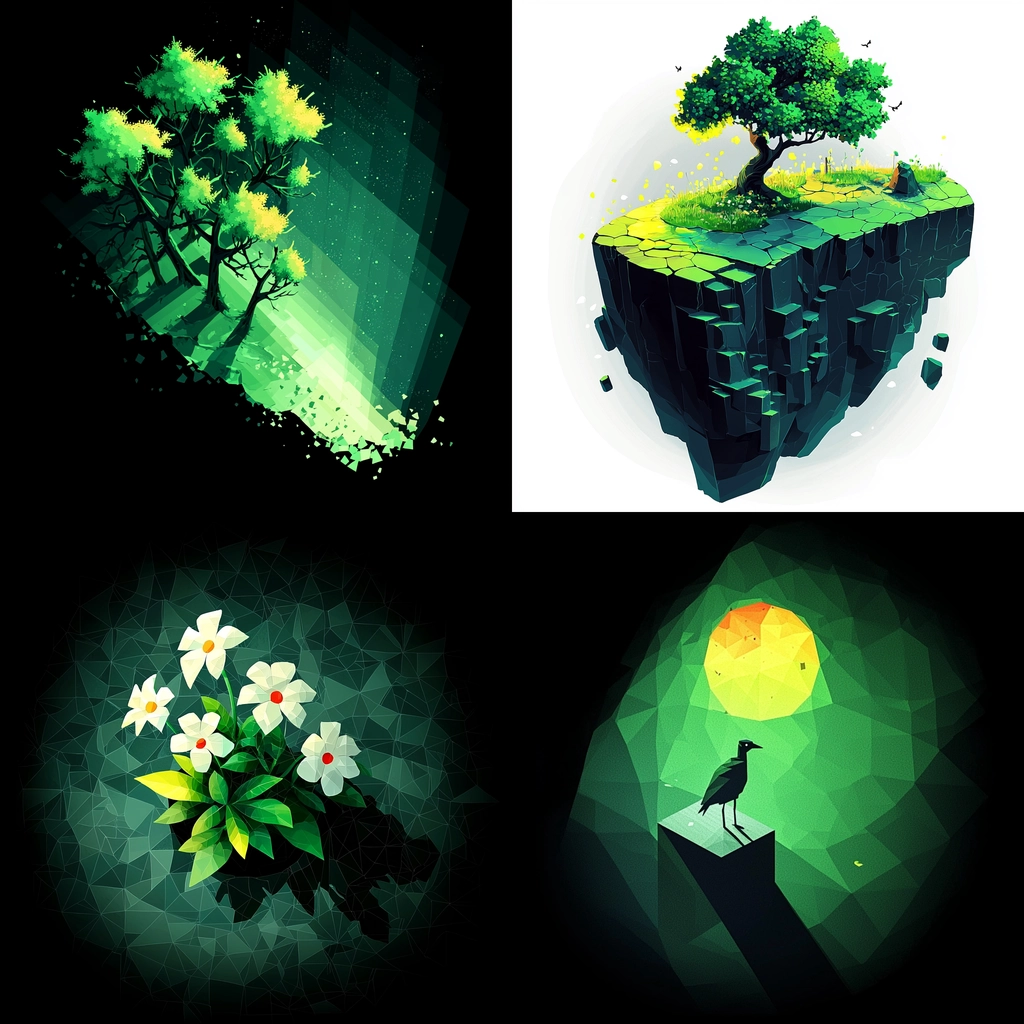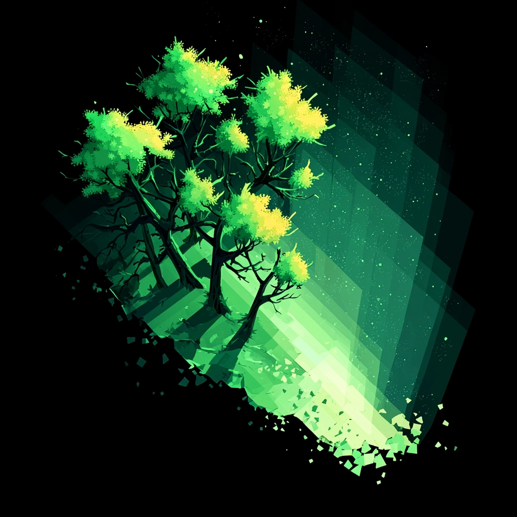 The use of lighting effects creates an internal glow, highlighting the structured composition. Green dominates, enhanced by yellow highlights, creating a sense of depth and separating elements clearly within geometric boundaries. Surfaces appear both smooth and multifaceted, adding visual interest.