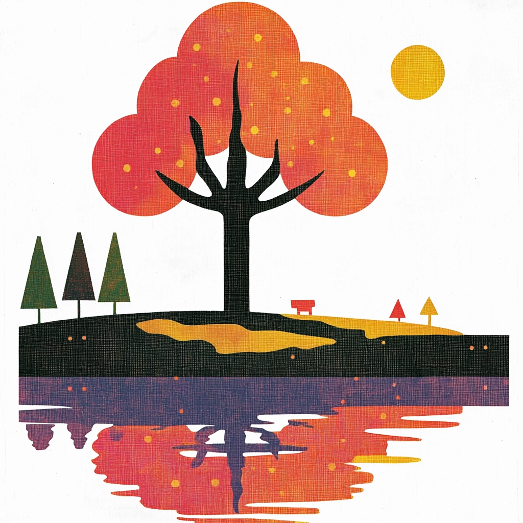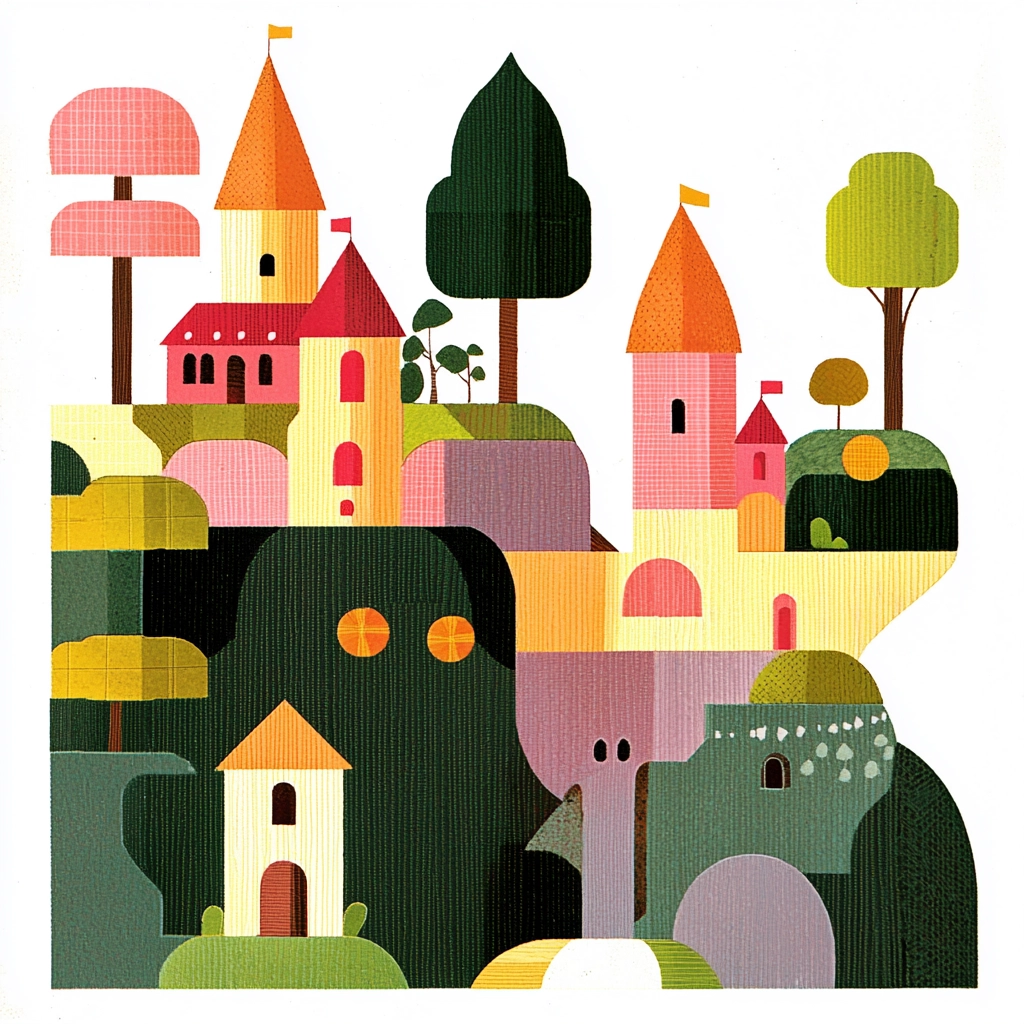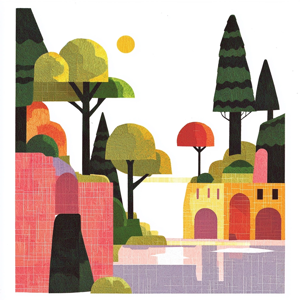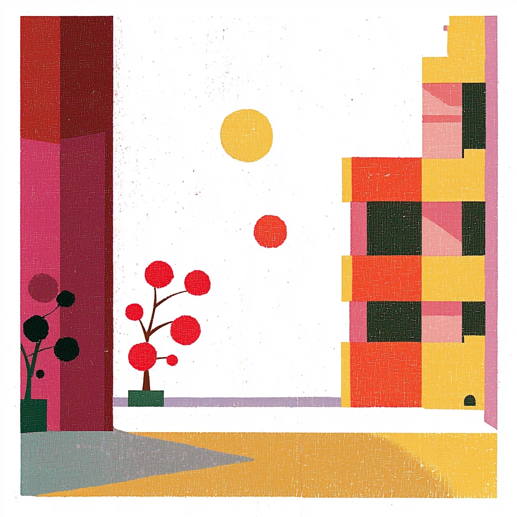 Sharp, clean lines and geometric shapes define the style, with a focus on clear delineation and repetition of forms. The vibrant use of oranges and greens against a white backdrop enhances the impression of depth through contrast.