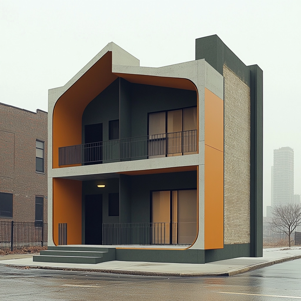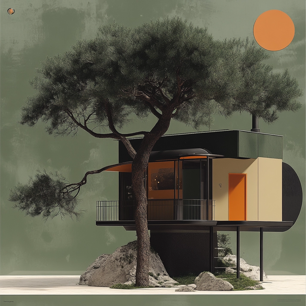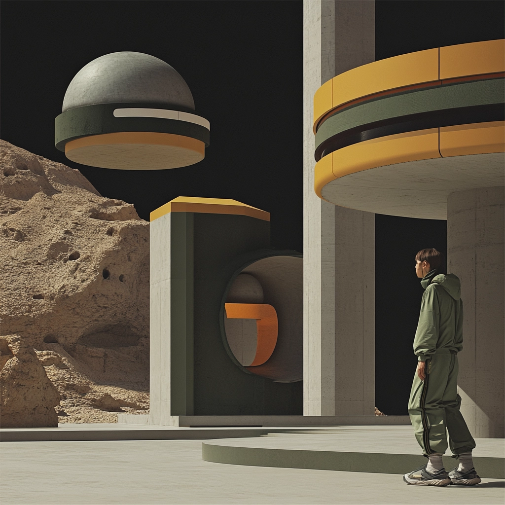 The artwork utilizes strong lighting to enhance the geometric forms, with precise edges and smooth surfaces. Bold color contrasts, especially between green and orange, create defined spaces and enhance the linear spatial sense within a modern architectural theme.