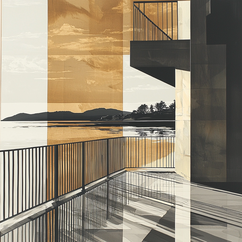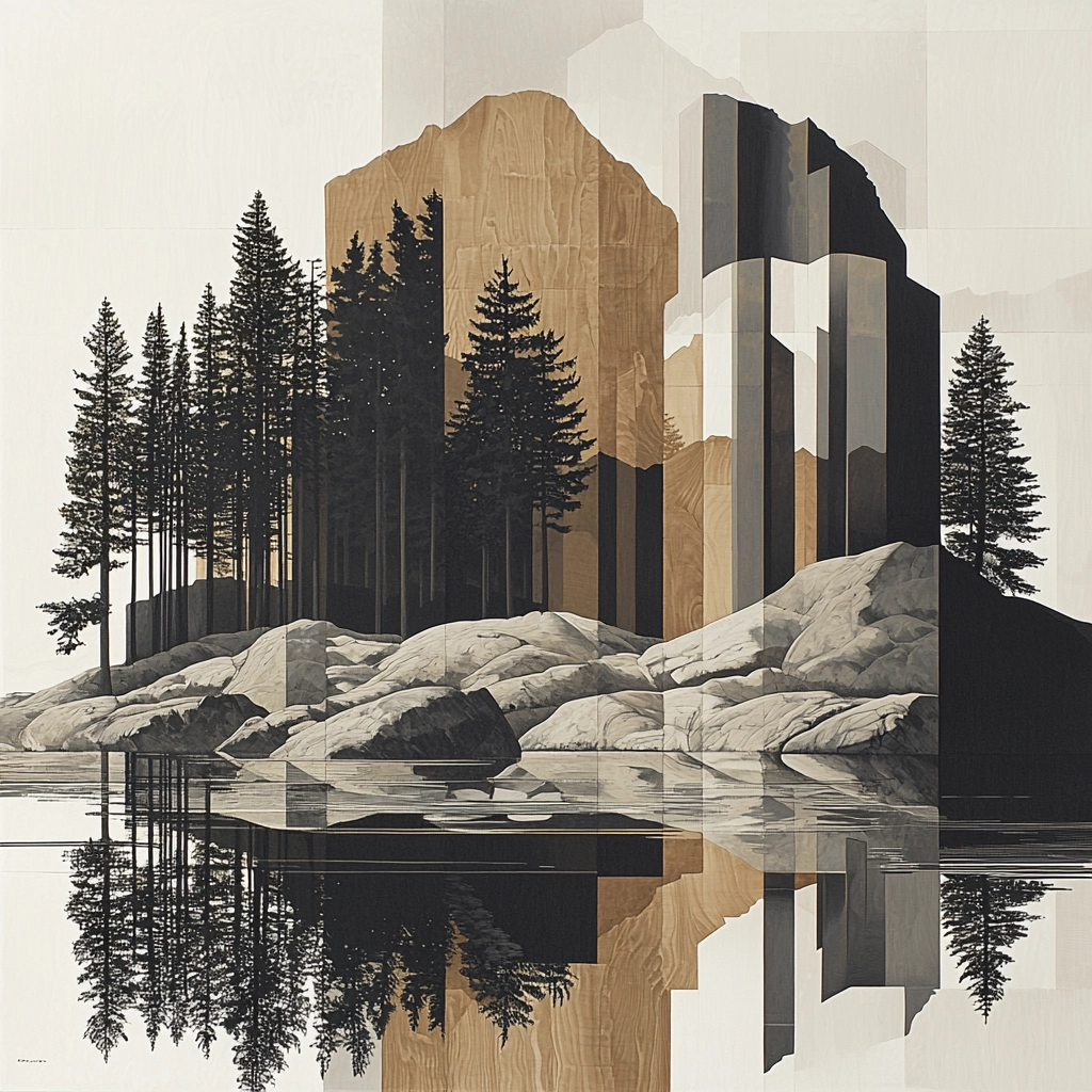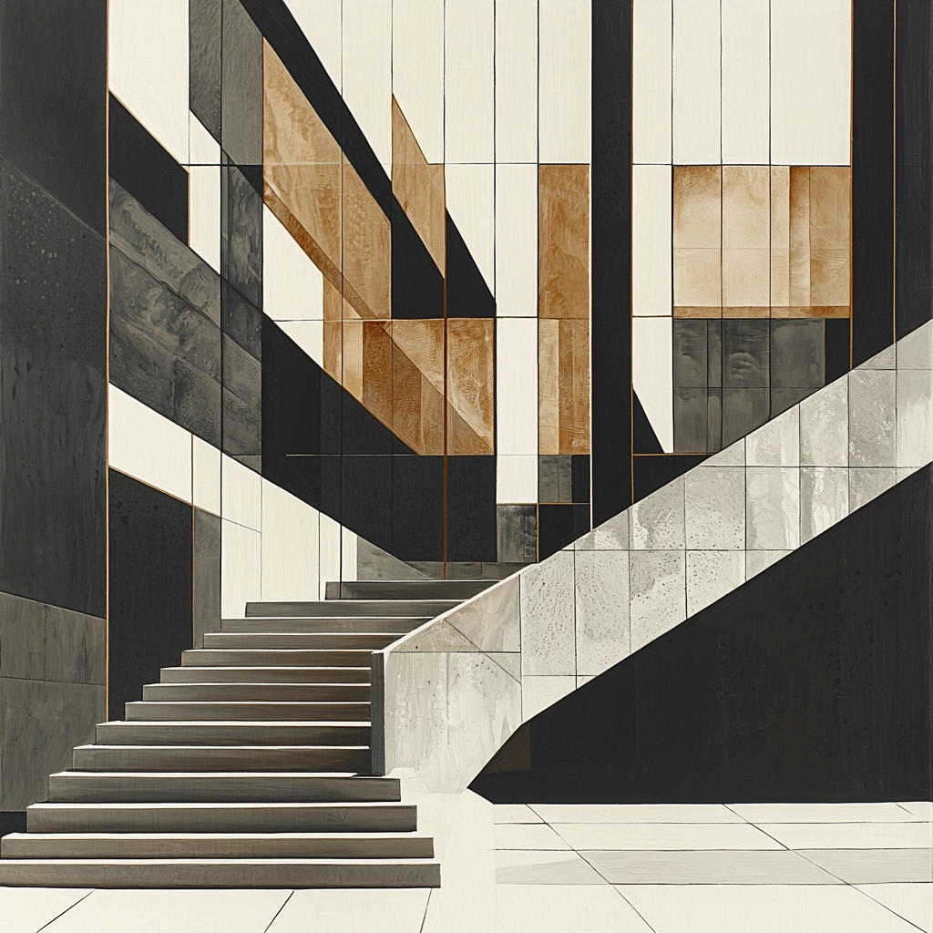 Dynamic geometrical forms with earthy palette and stark contrasts, presenting an interplay of structured environments and natural elements.