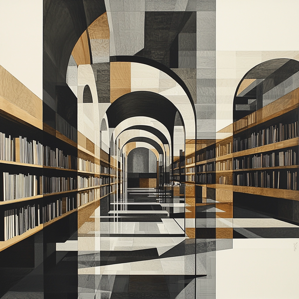 Light is used to highlight the precision in shapes and angles, with a balanced interplay between dark and light areas creating depth. The composition utilizes muted, earthy colors, providing a rich texture that emphasizes form over color saturation.