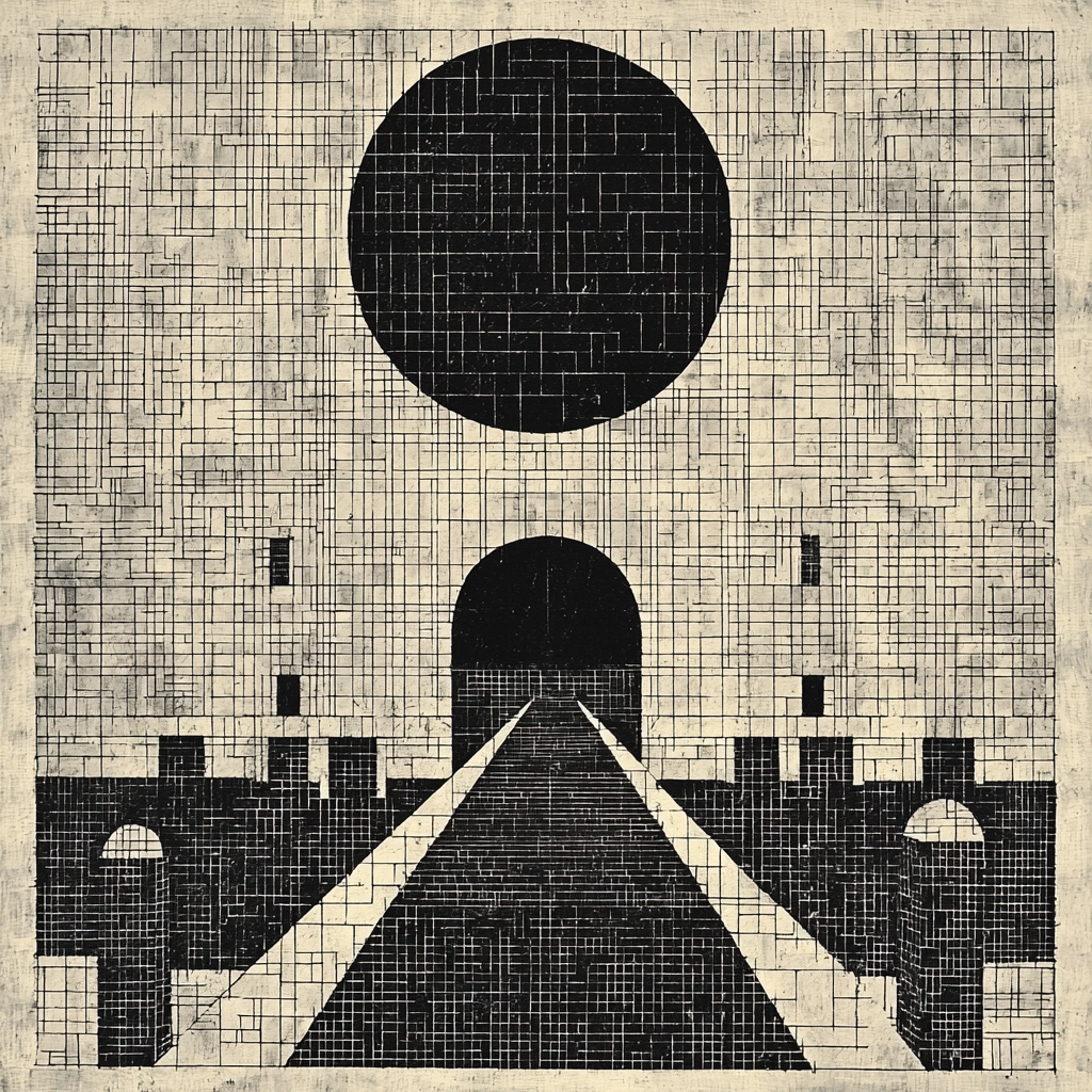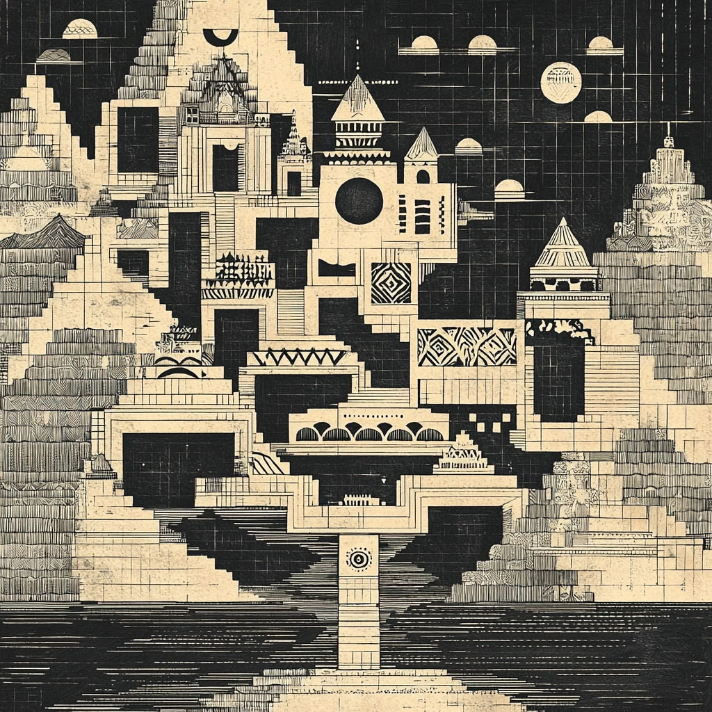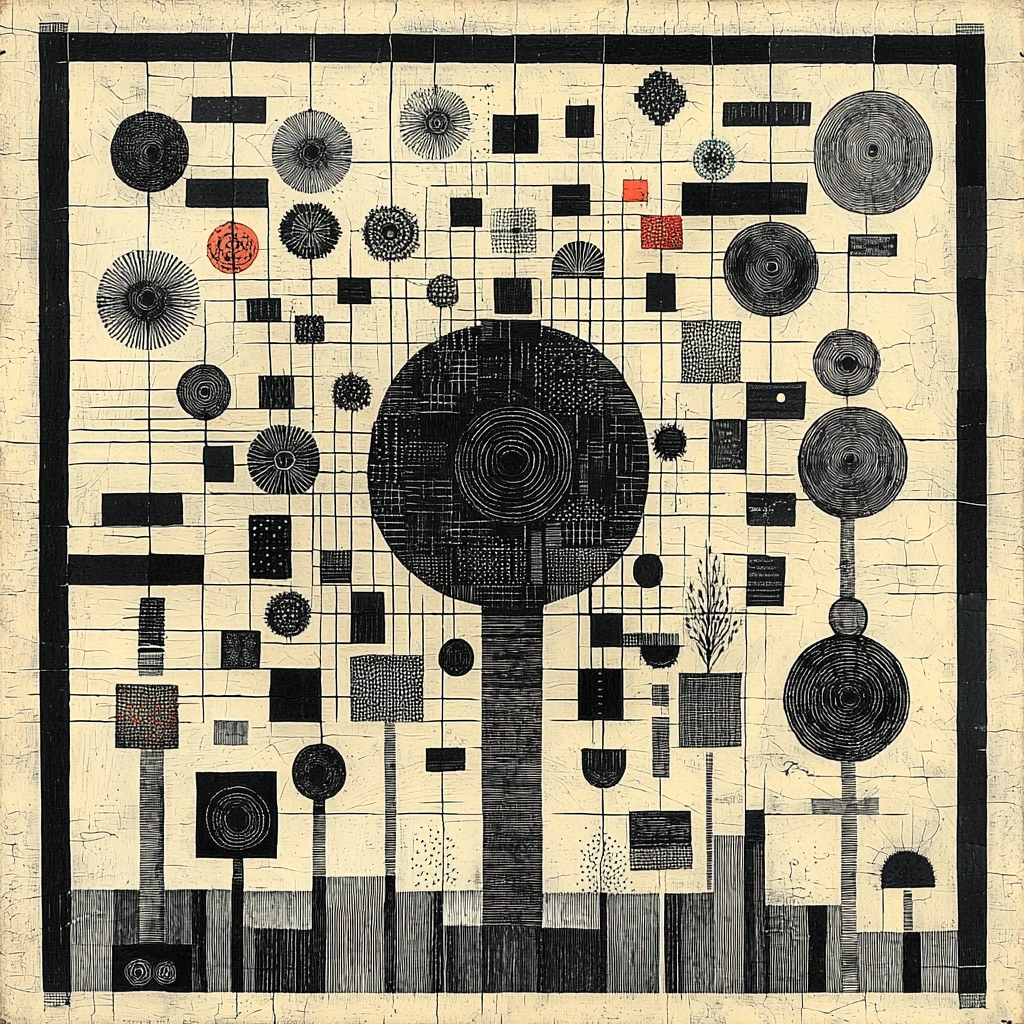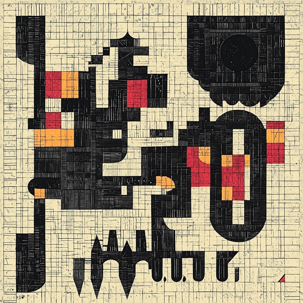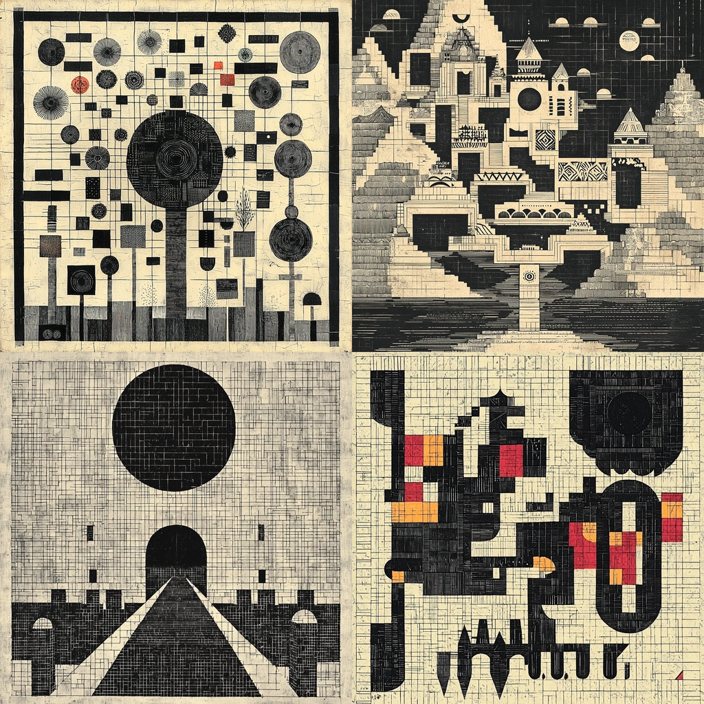 The intricate black and white schematics convey a stark contrast, accentuated by sparse red, and present precision in forms. Texture appears refined with a clear, structured spatial arrangement that reveals linear patterns.
