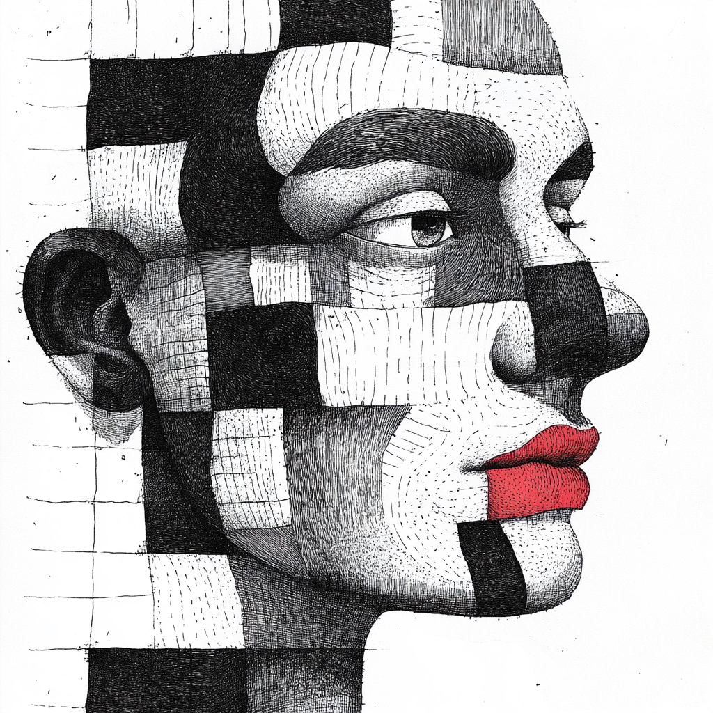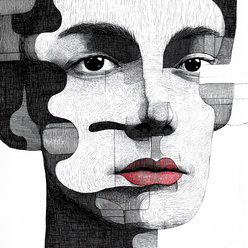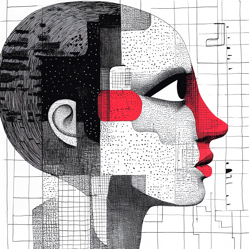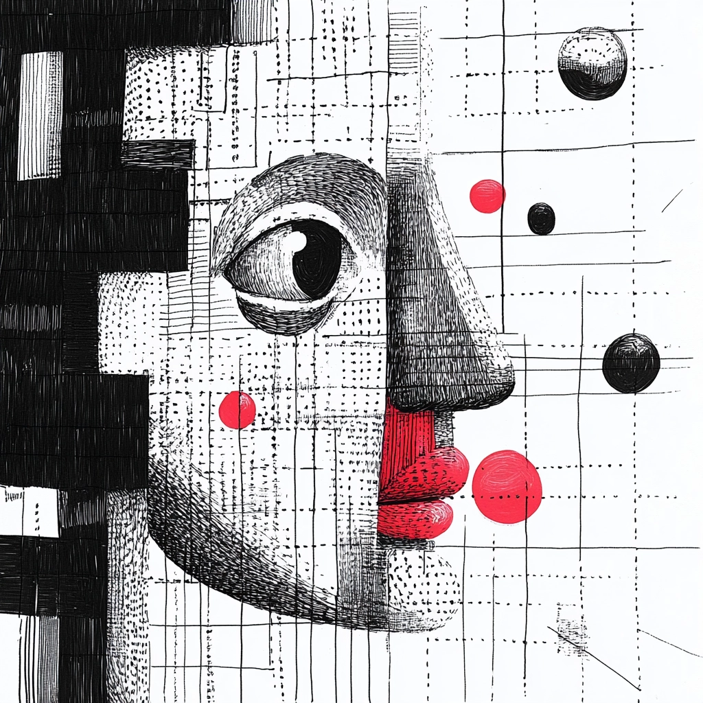 The artwork features strong contrasts using black and white lines and shapes. The use of red highlights specific areas while intricate textural patterns suggest depth. Geometric forms create a sense of fragmented spatial awareness, with intersecting lines adding structure.