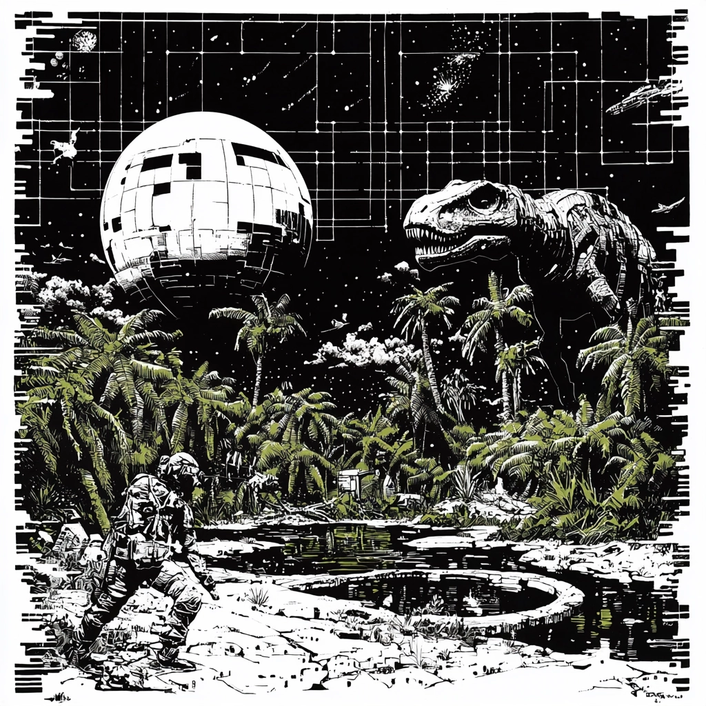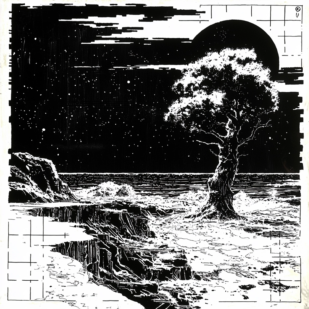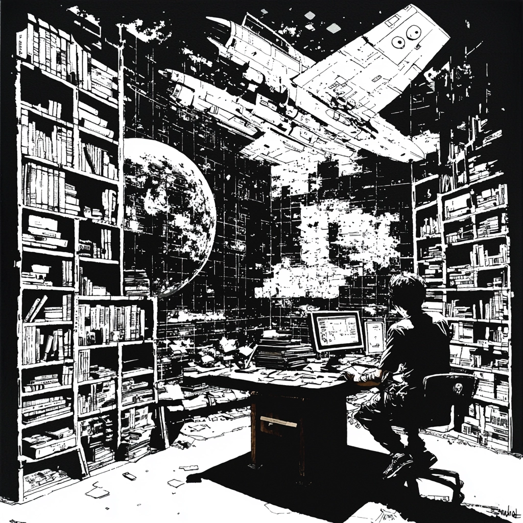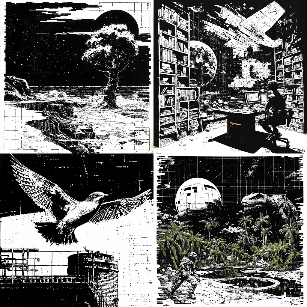 Lighting is used to emphasize contrasts between dark and light areas, resulting in strong visual intensity. The color palette limits itself to black and white, enhancing the effect of sharp lines and precise geometric forms. The spatial settings employ a three-dimensional technique that adds depth and complexity, while textures are intricately detailed and carefully rendered.