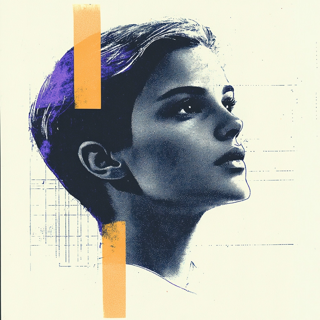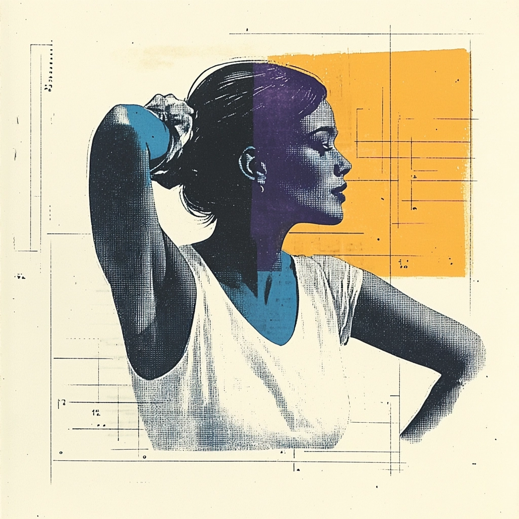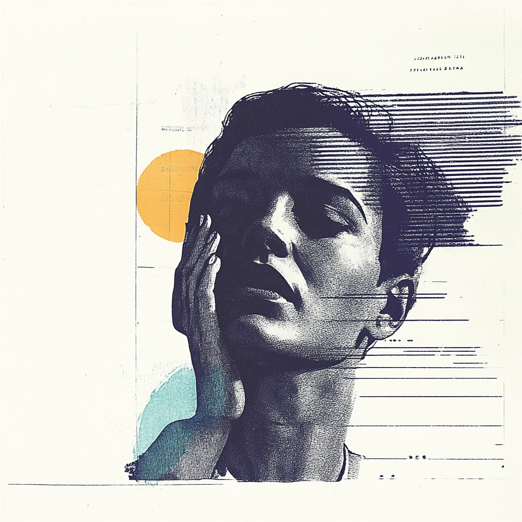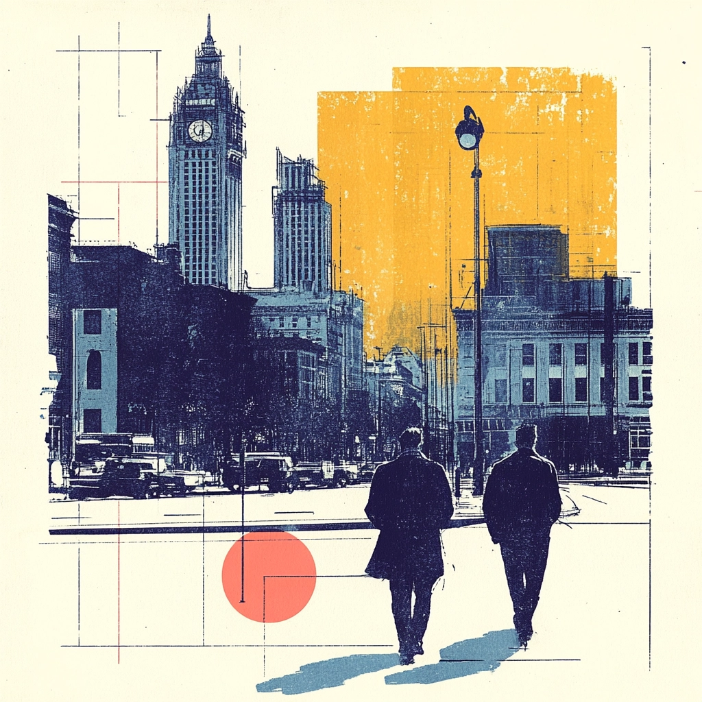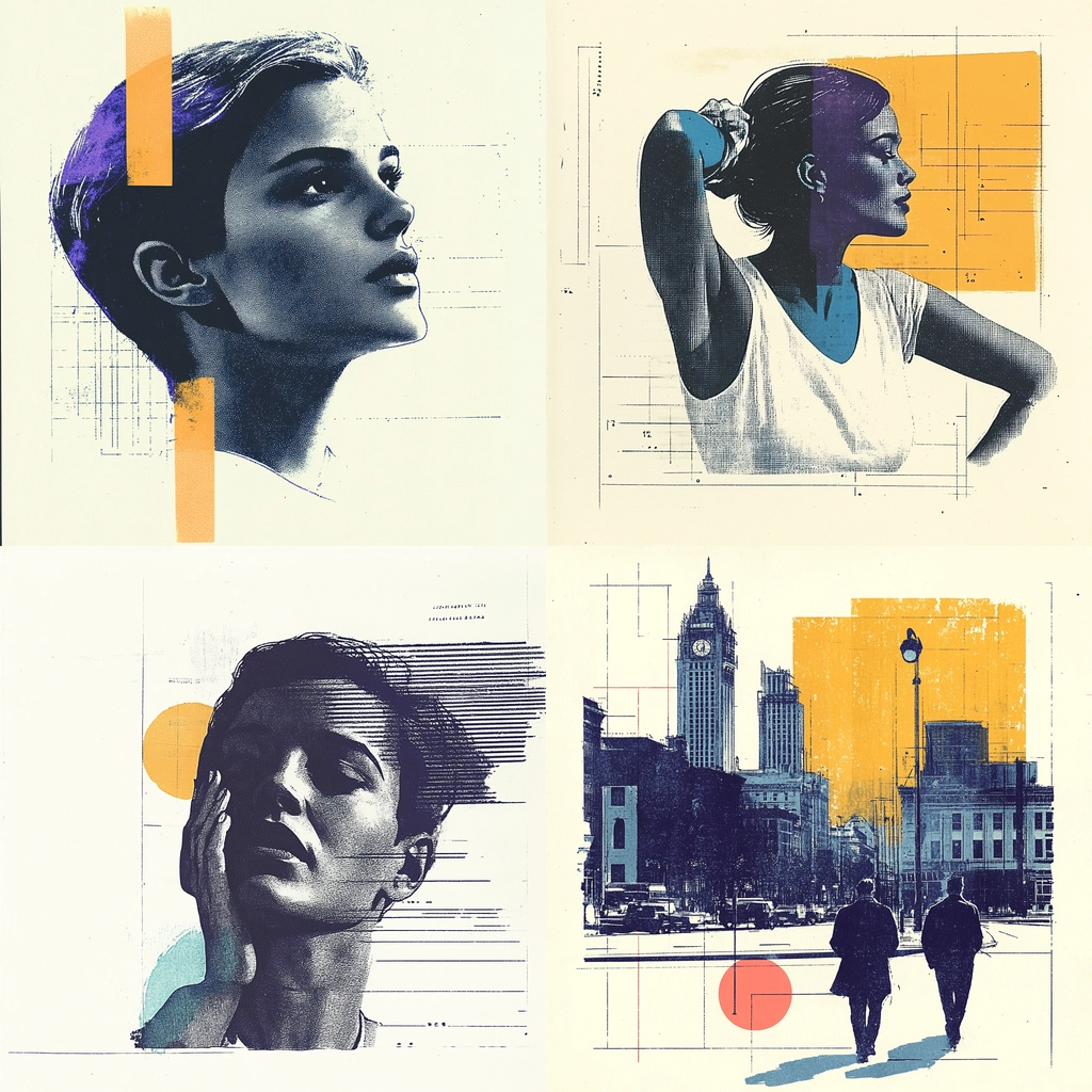 Strong use of geometric shapes and blocks of color overlays create distinct areas of interest. The integration of linear sketches in muted colors provides a spatial depth and manages the texture across various sections. Lighting is subtle, focusing on the contrast between vibrant color blocks and the neutral background.