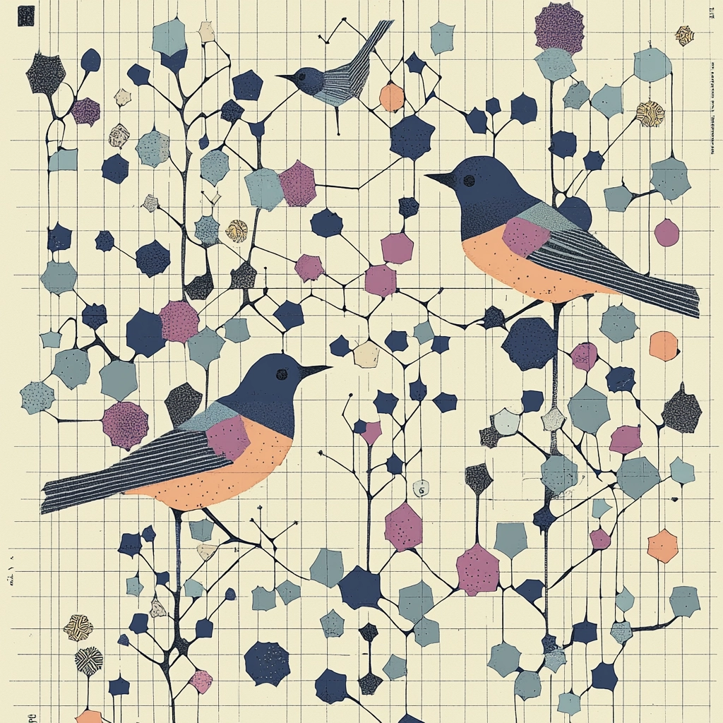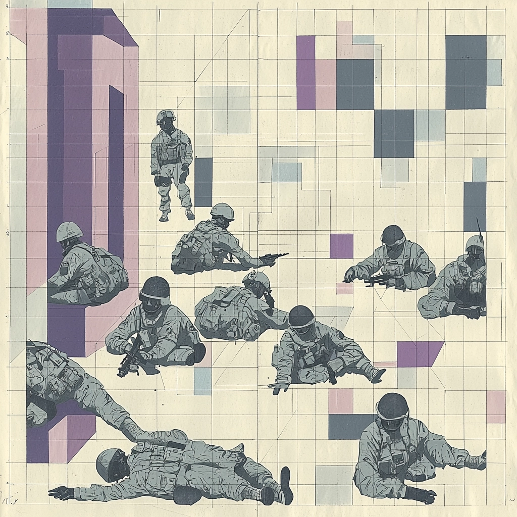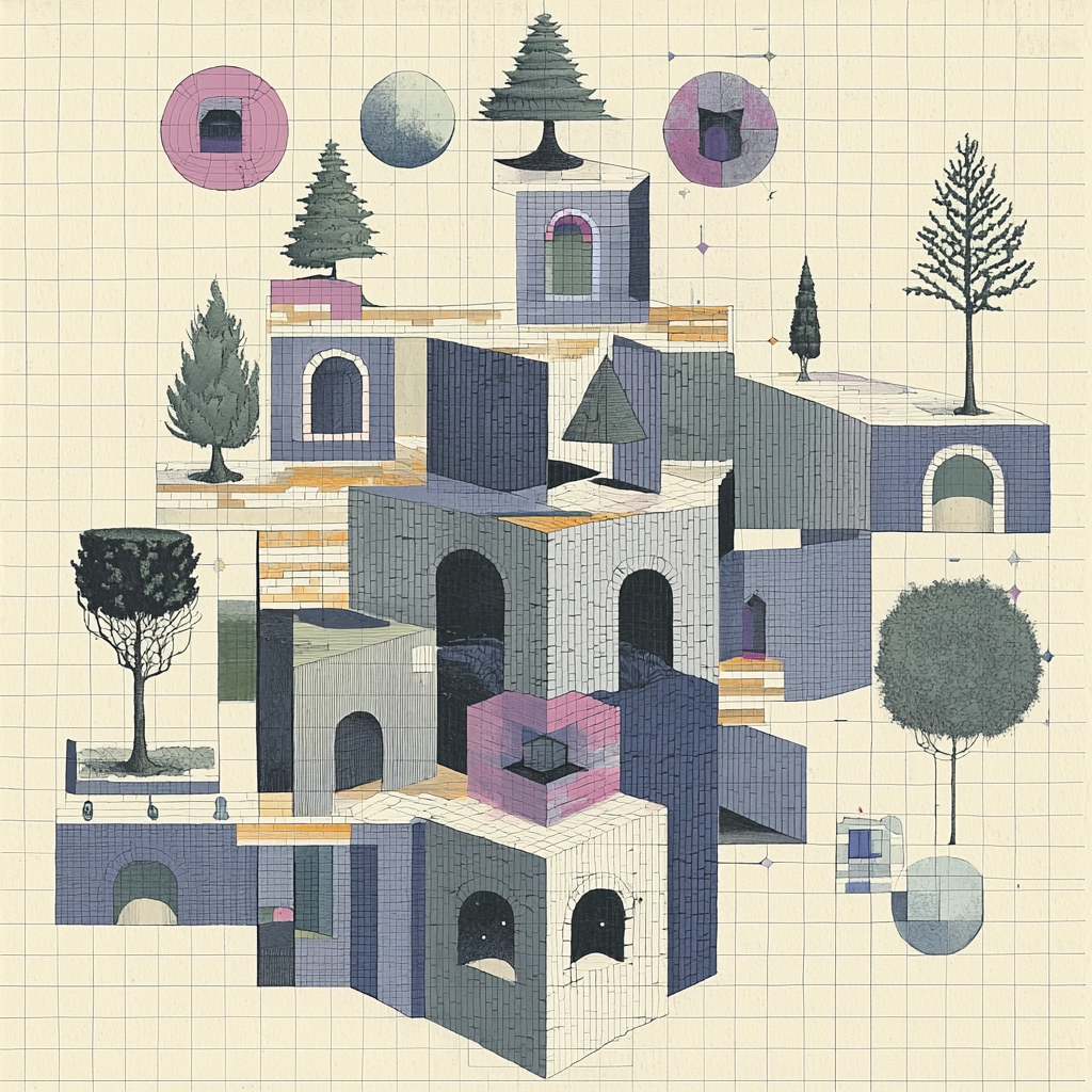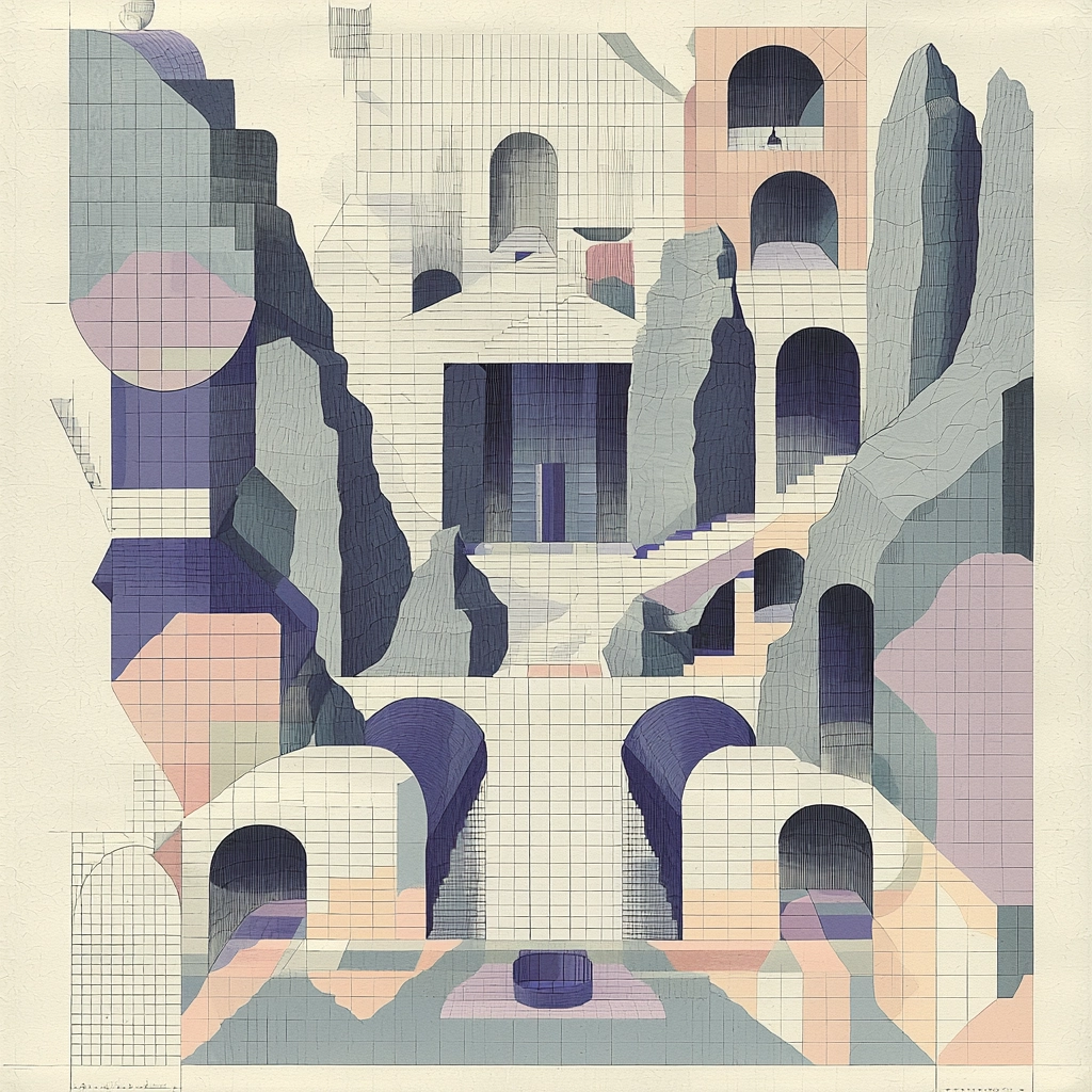 Soft lighting enhances the pastel hues across the grid-like patterns, while the geometric forms create a measured spatial arrangement. The texture appears smooth, with transitions that emphasize the balance between shapes and color tones.
