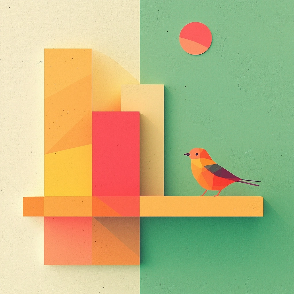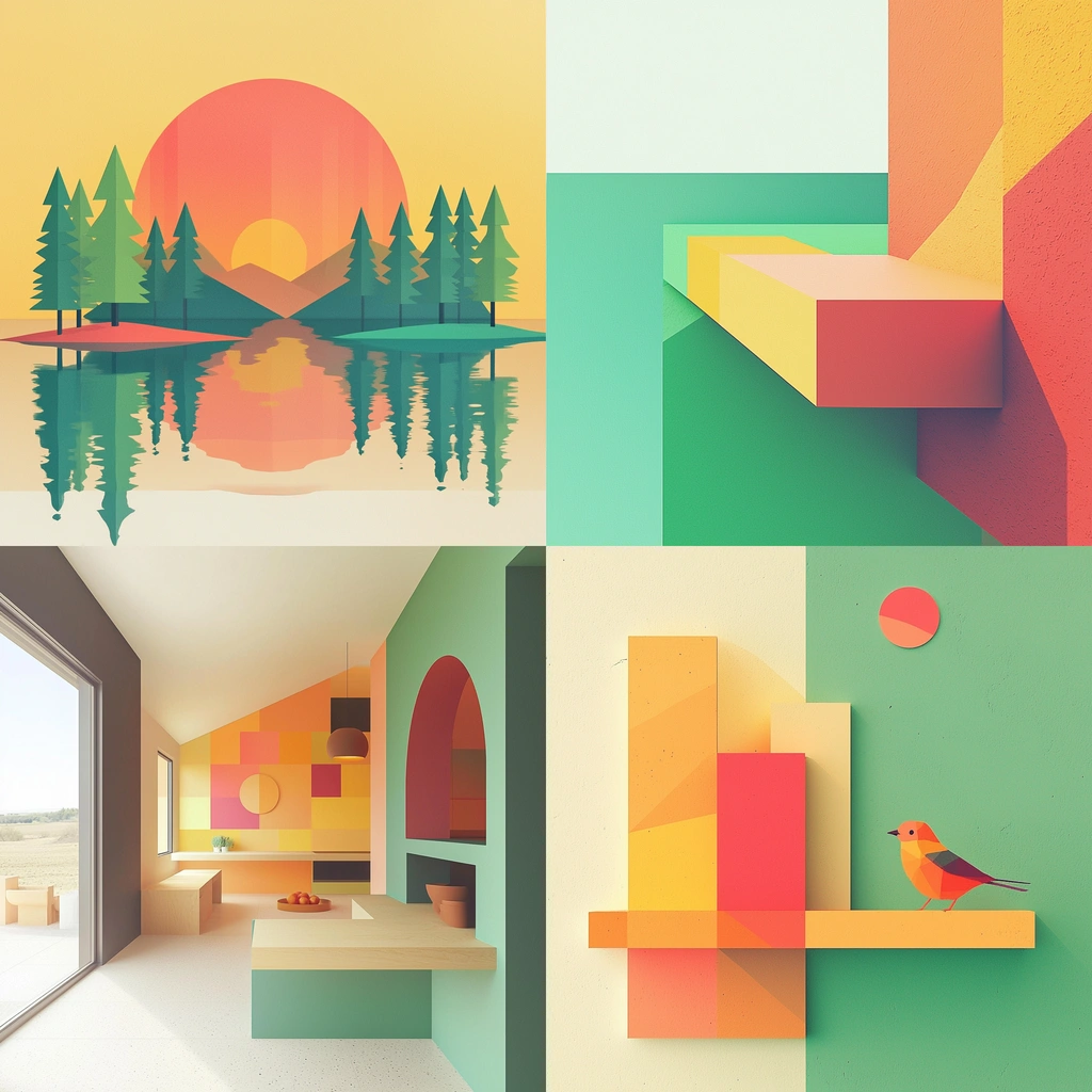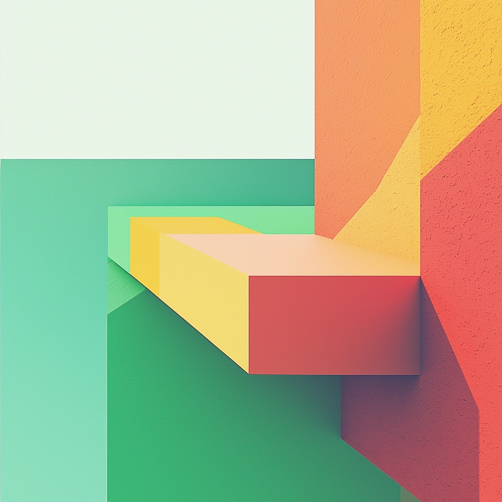A vibrant combination of sharp geometrical shapes and subdued pastel hues.