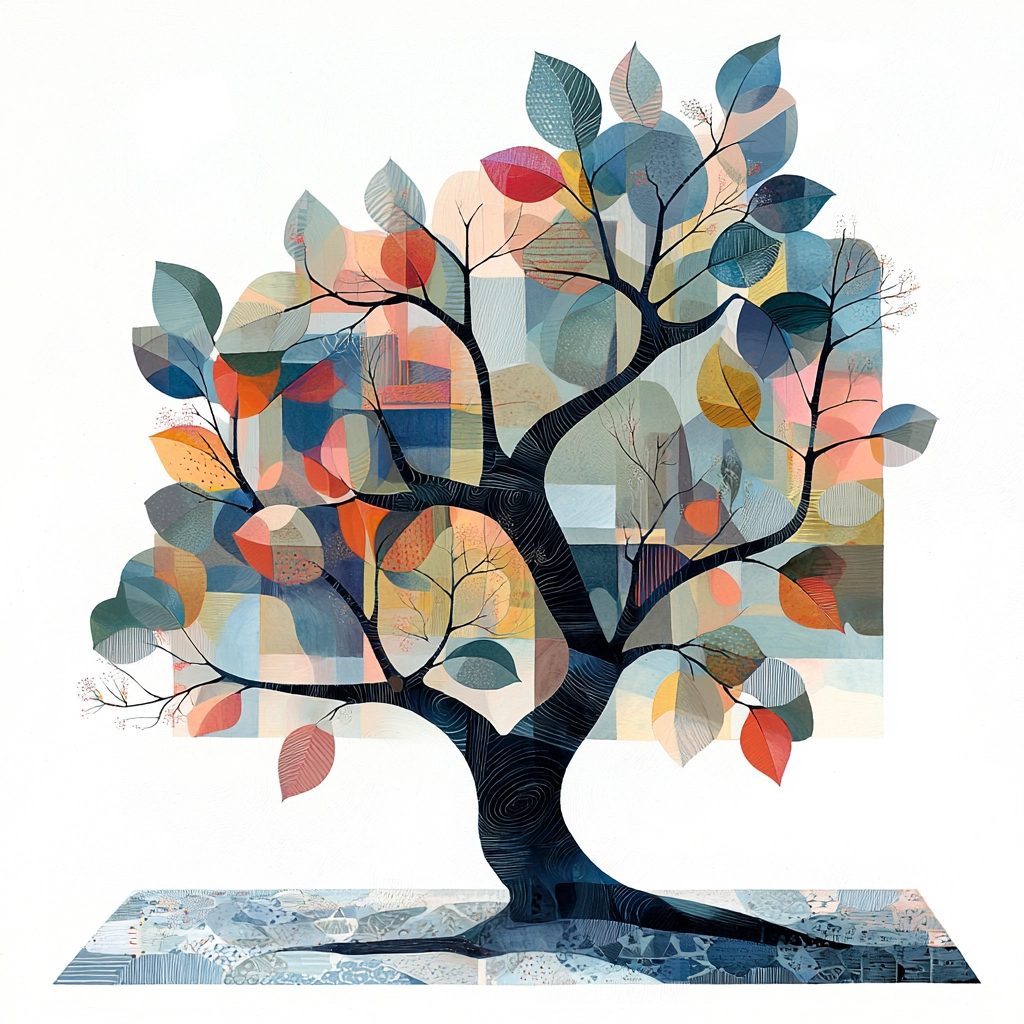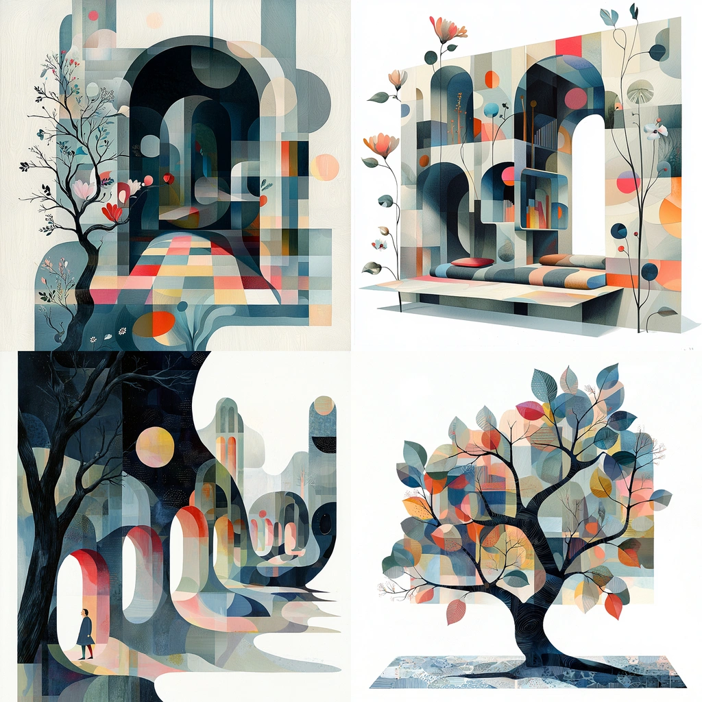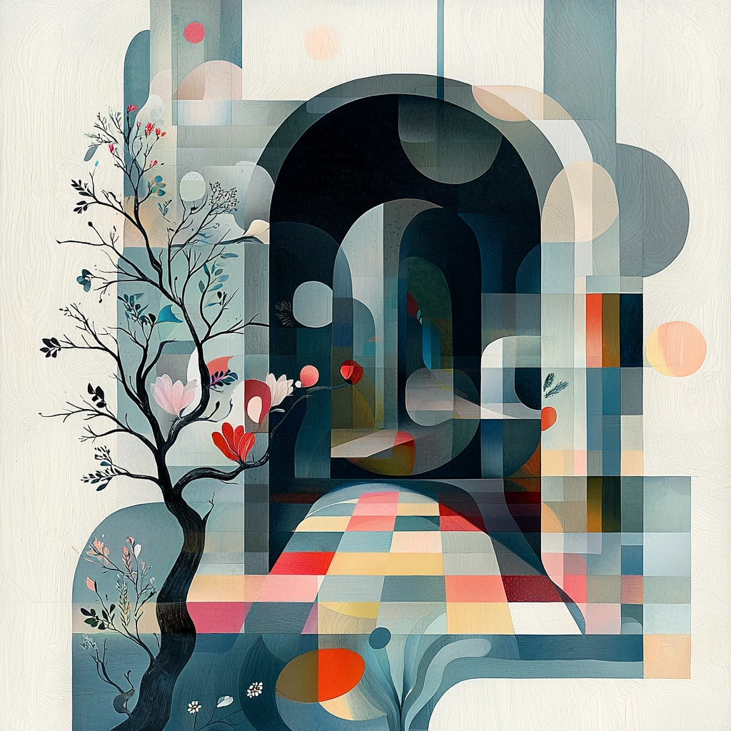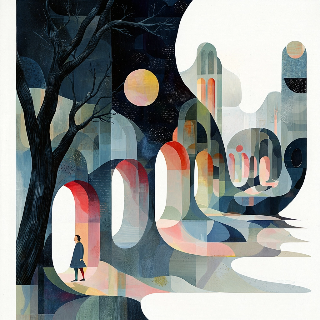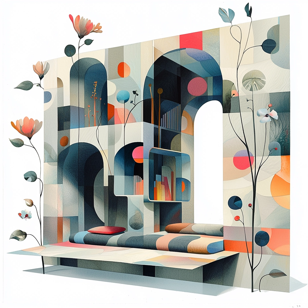 Crisp lines intersect with rounded forms, creating a play of light and shadow. The subtle contrast between soft peach and cool dark blue underscores the depth, while the transparency layers provide a gentle spatial flow.