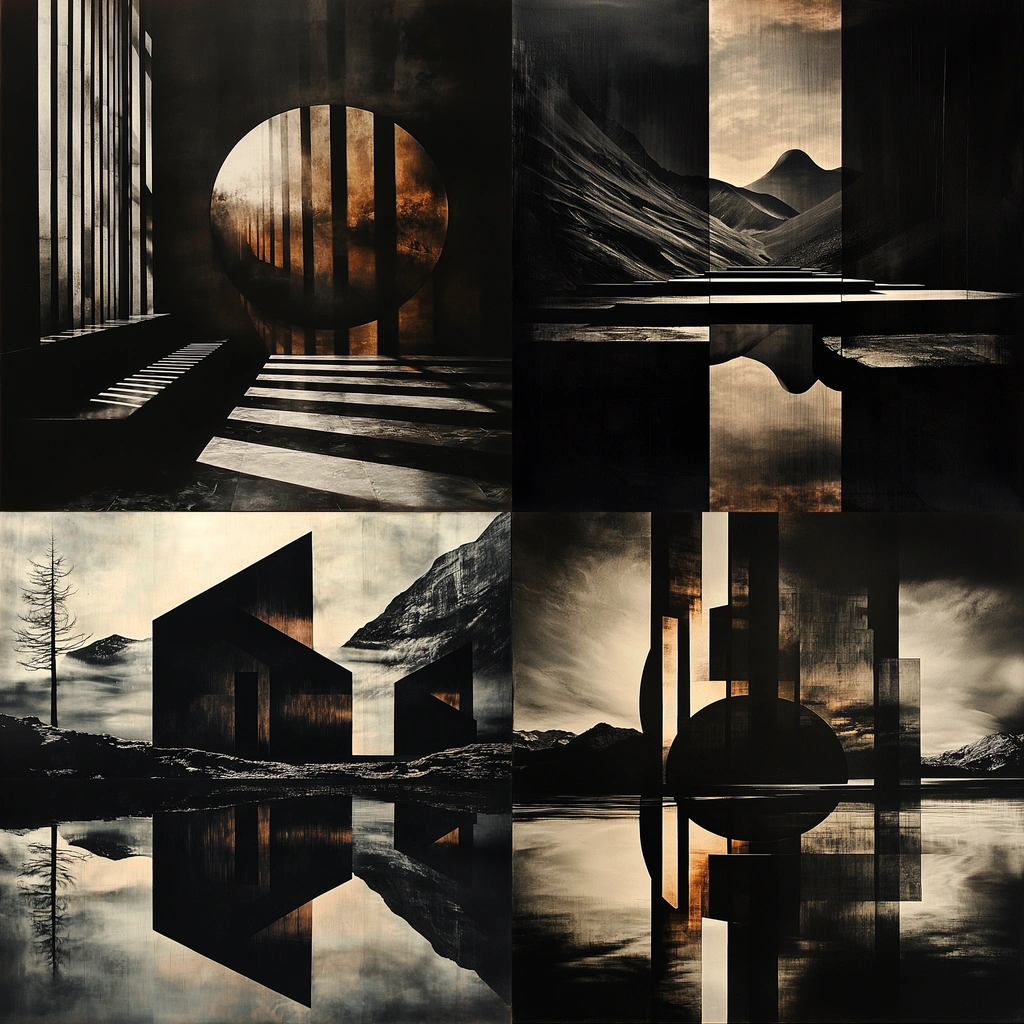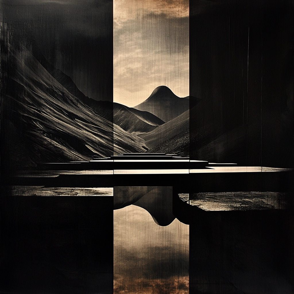 Lighting effects emphasize strong contrasts and reflections; colors dominate with darker hues interspersed with muted tones, creating a dynamic spatial sense; texture is smooth with subtle transitions between different visual planes.