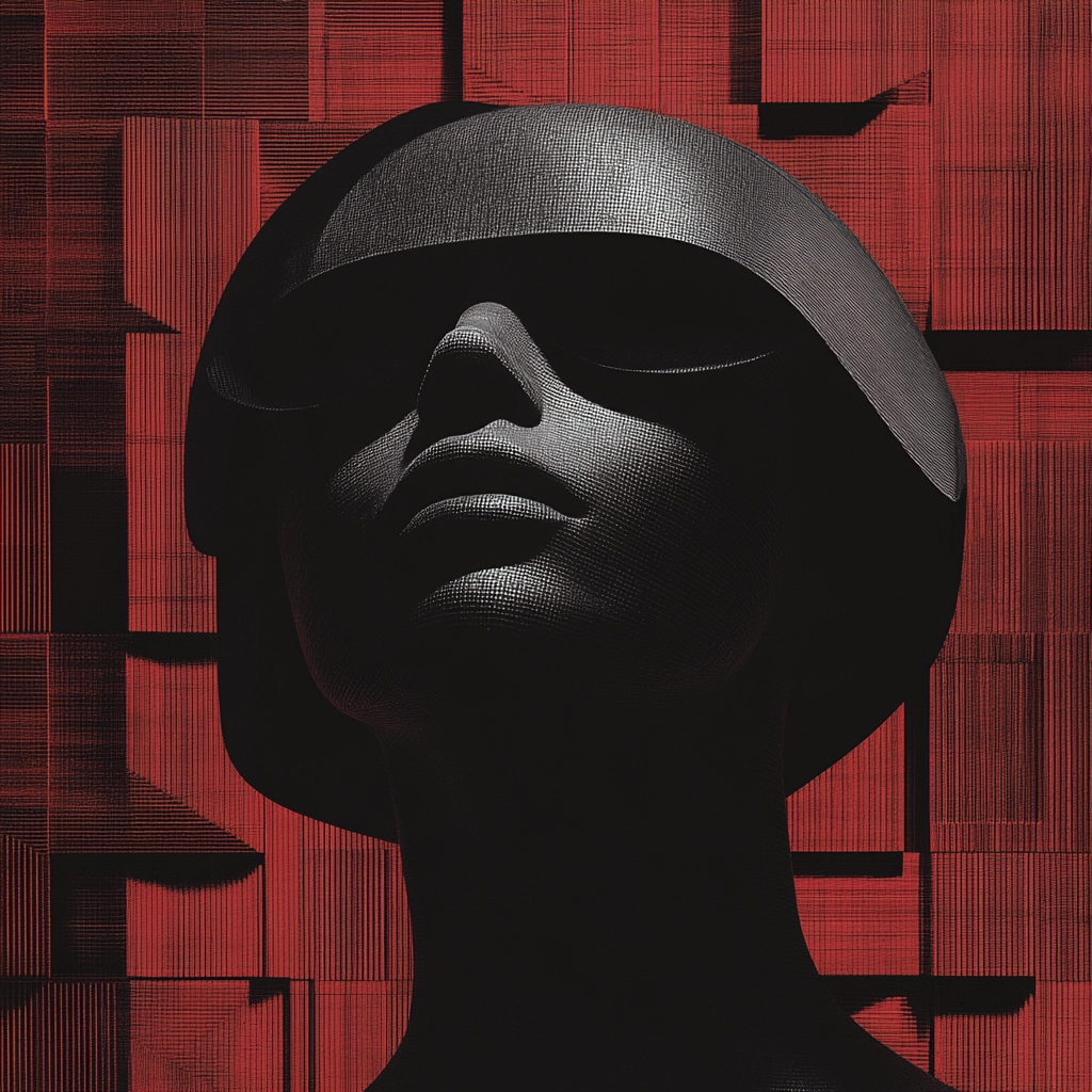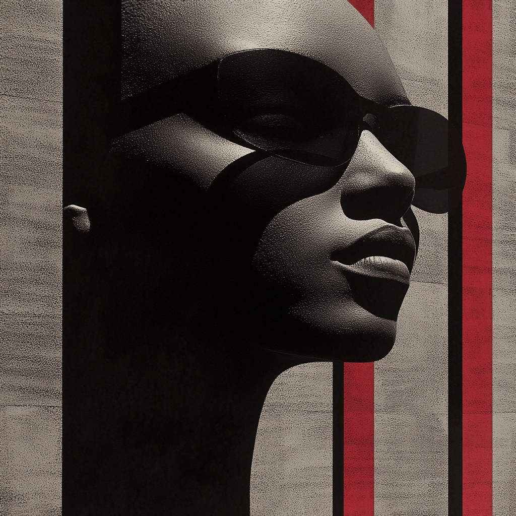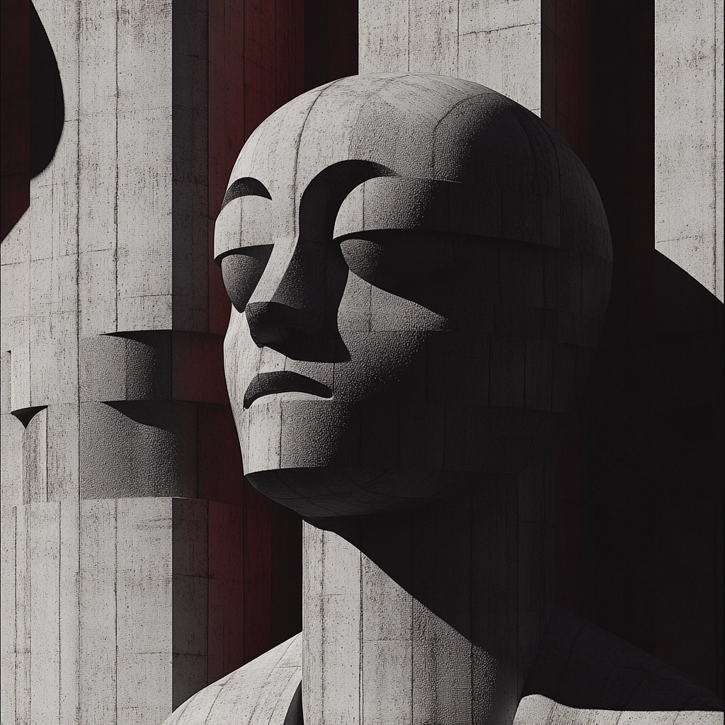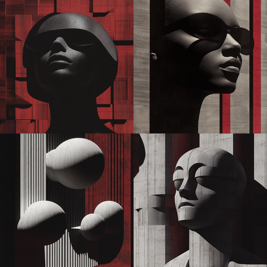Strong lighting creates bold shadows, enhancing depth with a monochrome palette juxtaposed against vibrant red backgrounds. Structural textures accentuate planar forms, and spatial dynamics are reinforced by the interplay of light and shadow across surfaces.