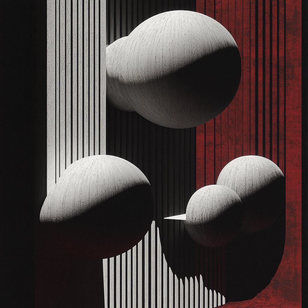 Interplay of sharp contrasts with geometric elements on red backgrounds.