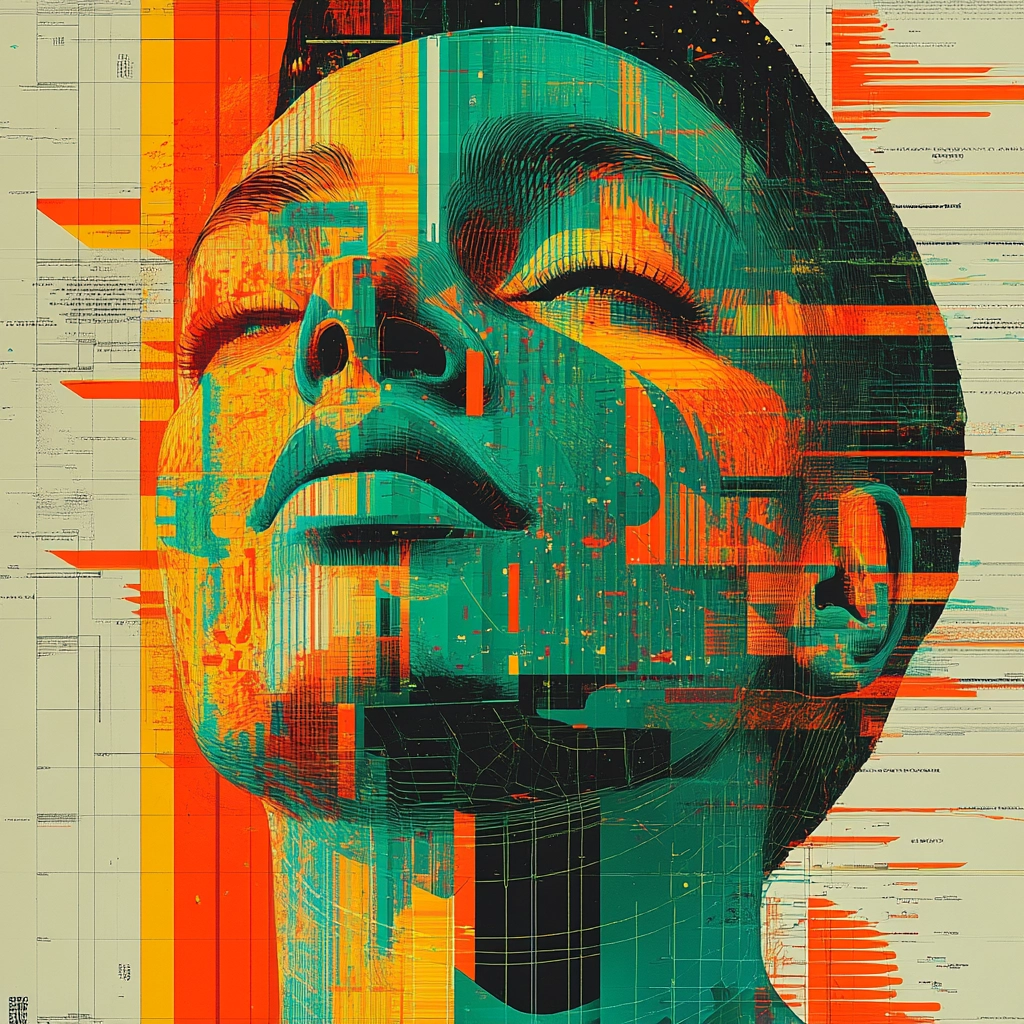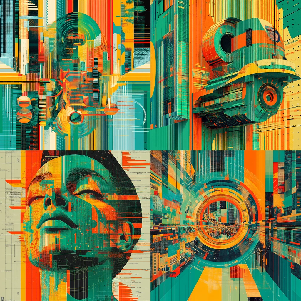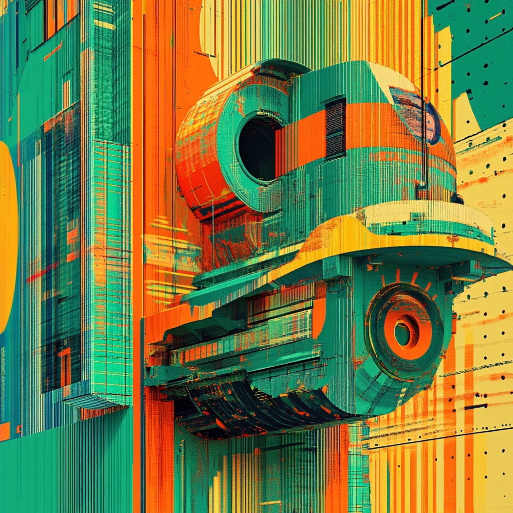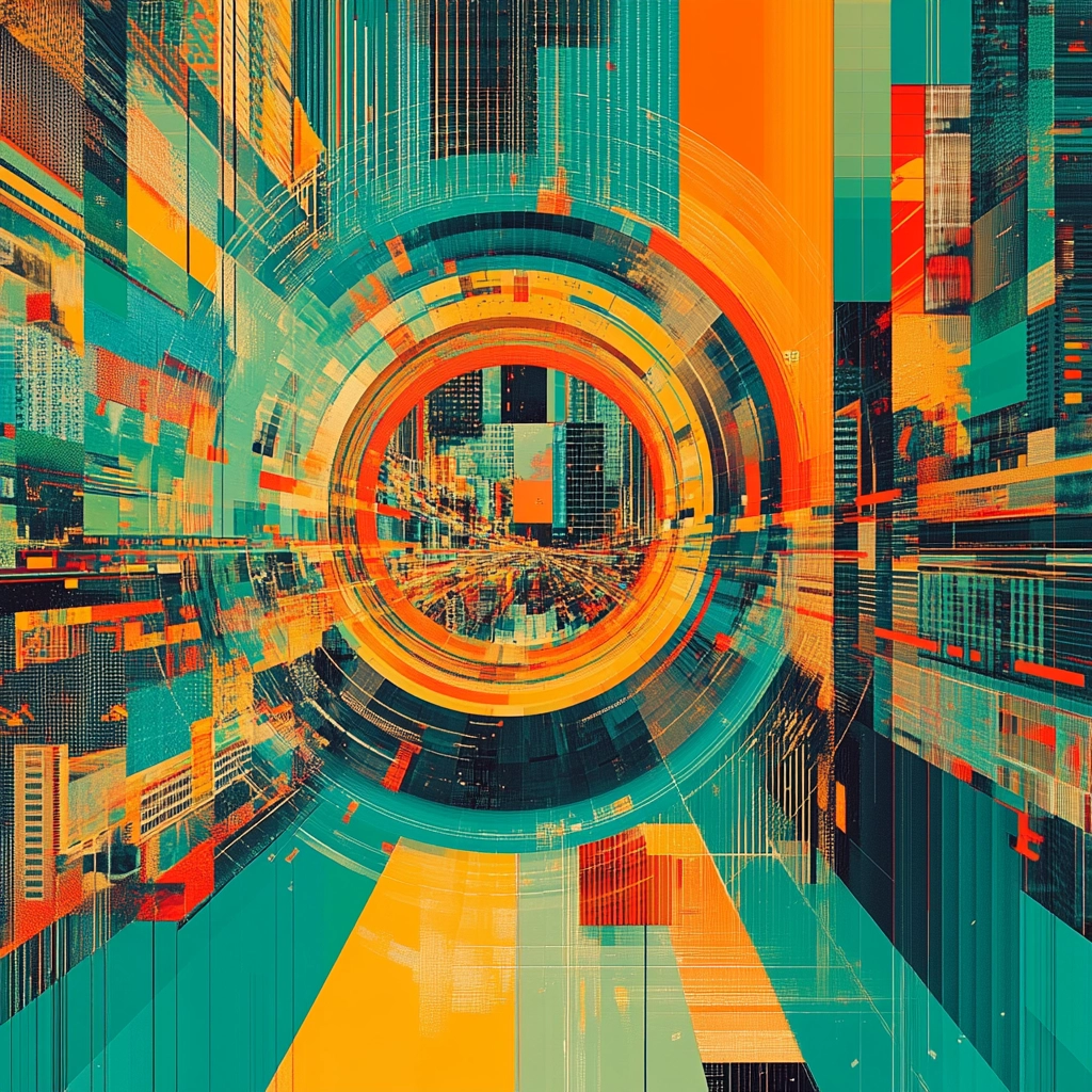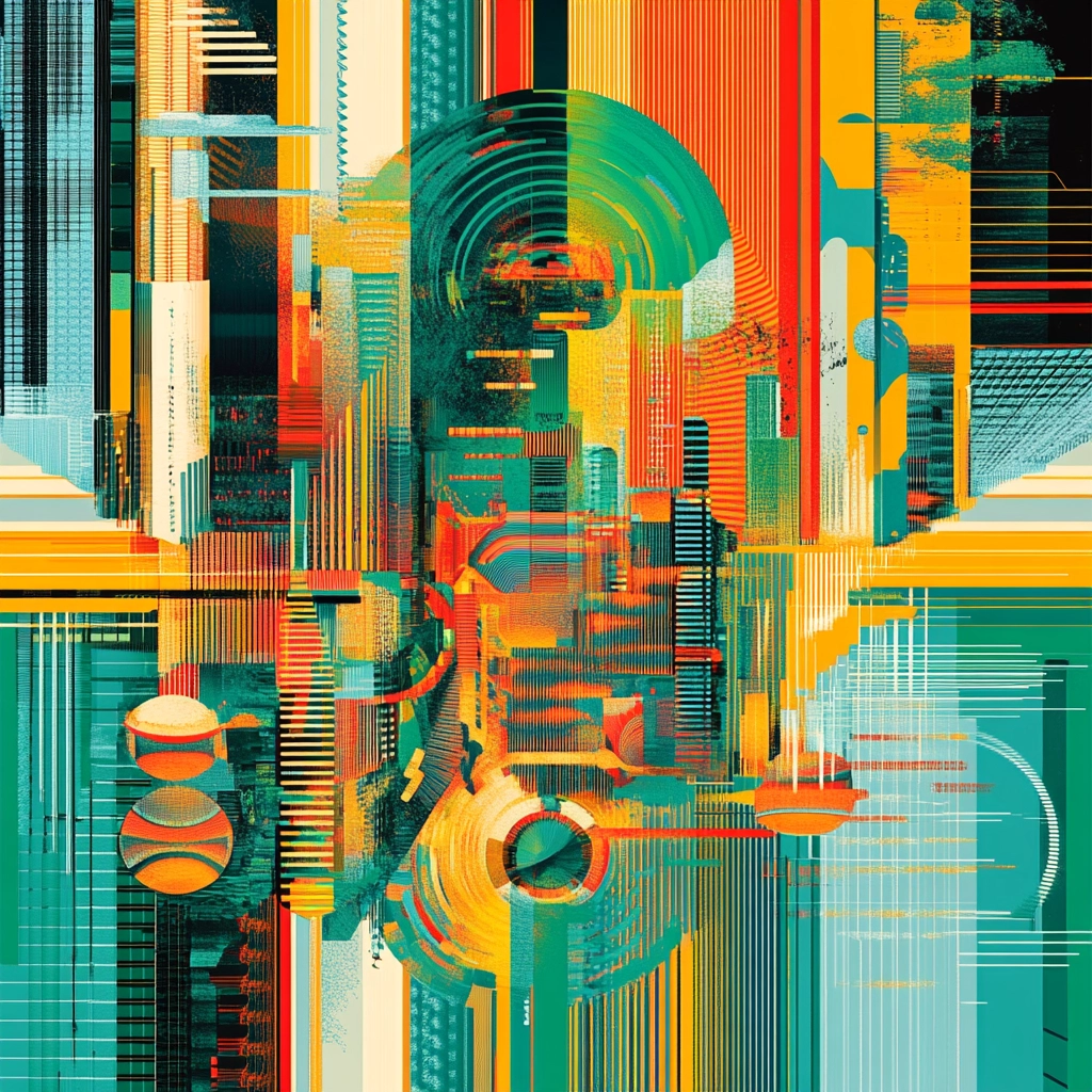 Dynamic lighting accentuates the sharp geometry, with a layered depth achieved through intersecting lines and shapes. Vivid colors create a bold, electrical intensity while textures enhance visual interest.