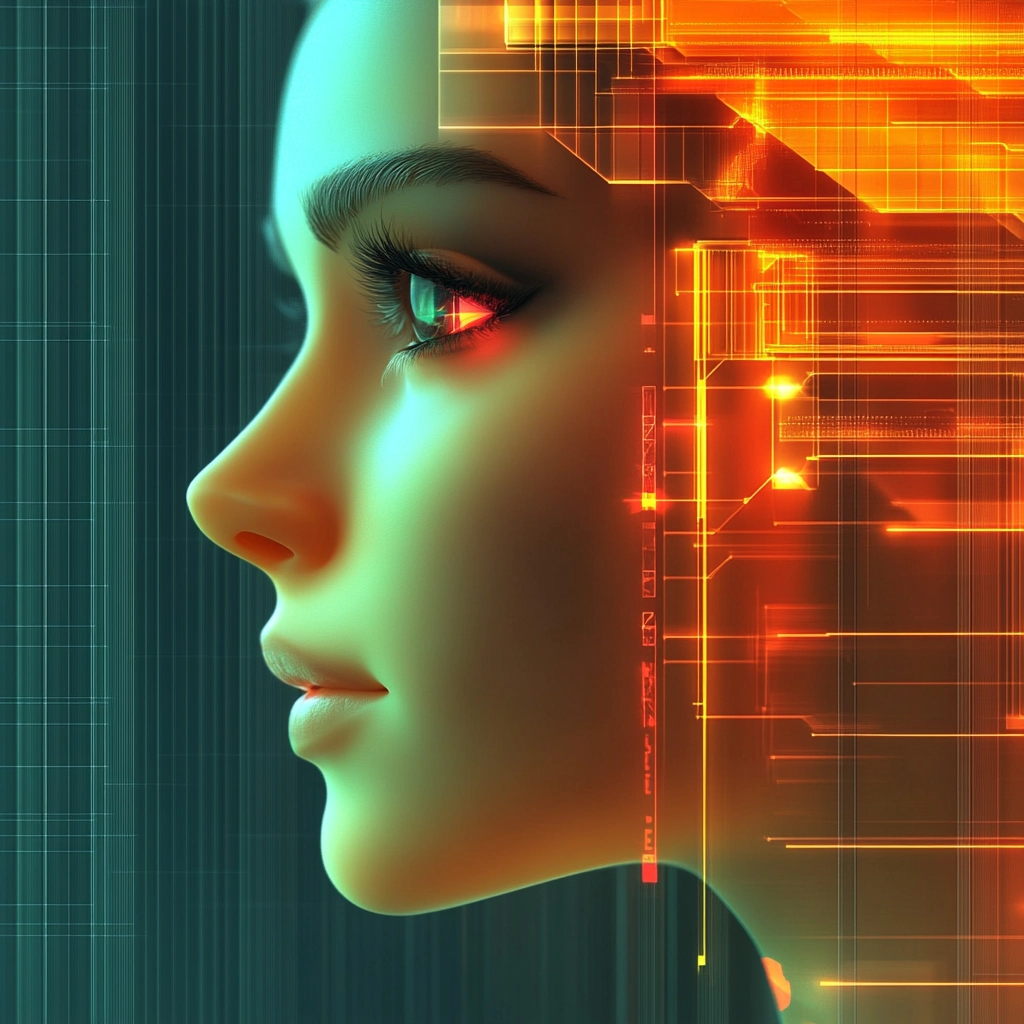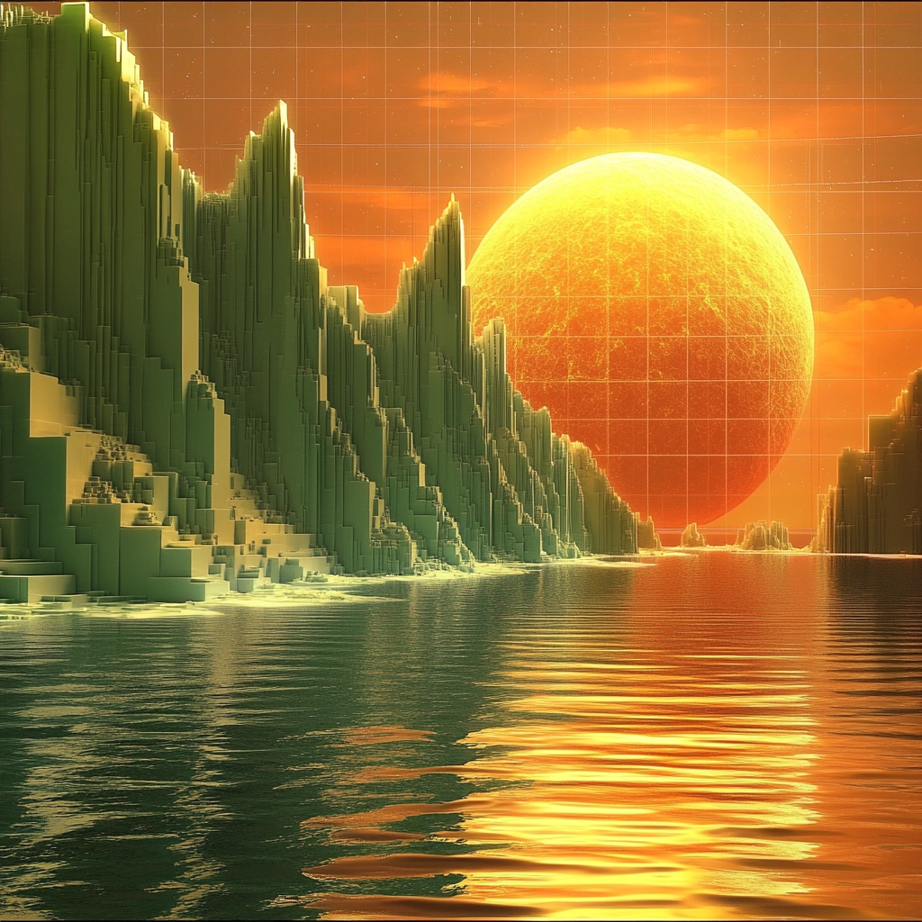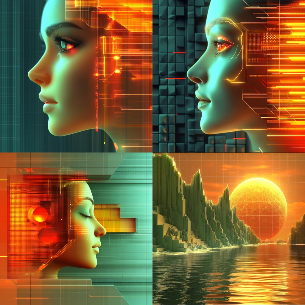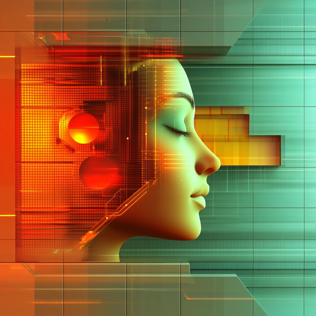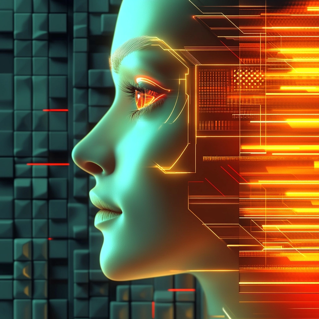 Contrast is heightened by the interplay of warm orange against cool teal, while crisp lines and blocky forms contribute to a sense of depth and precision. The lighting accentuates the geometric shapes, giving a distinctive visual rhythm to the composition.