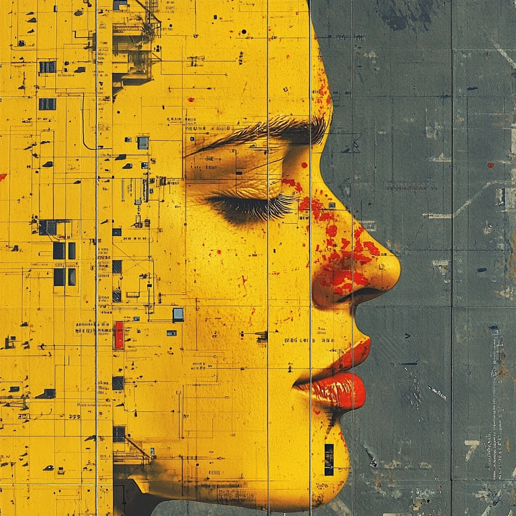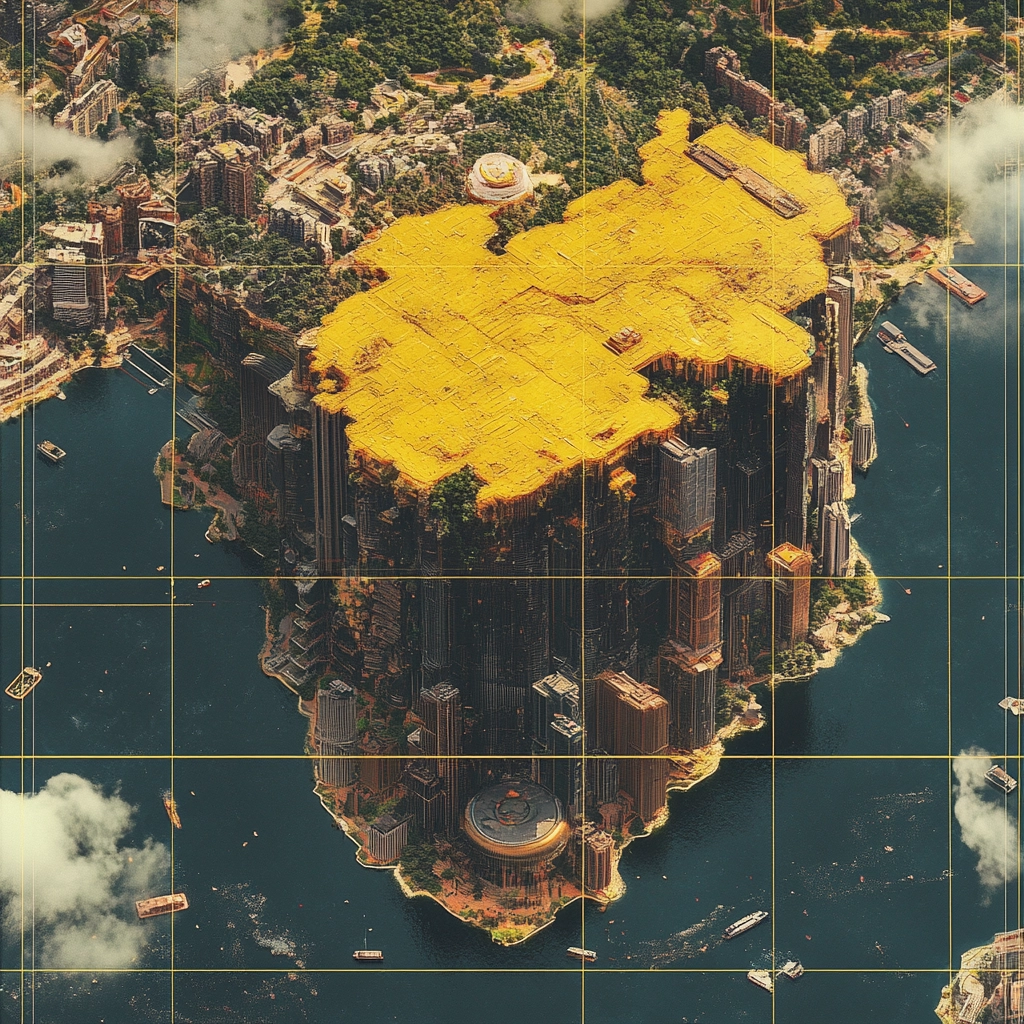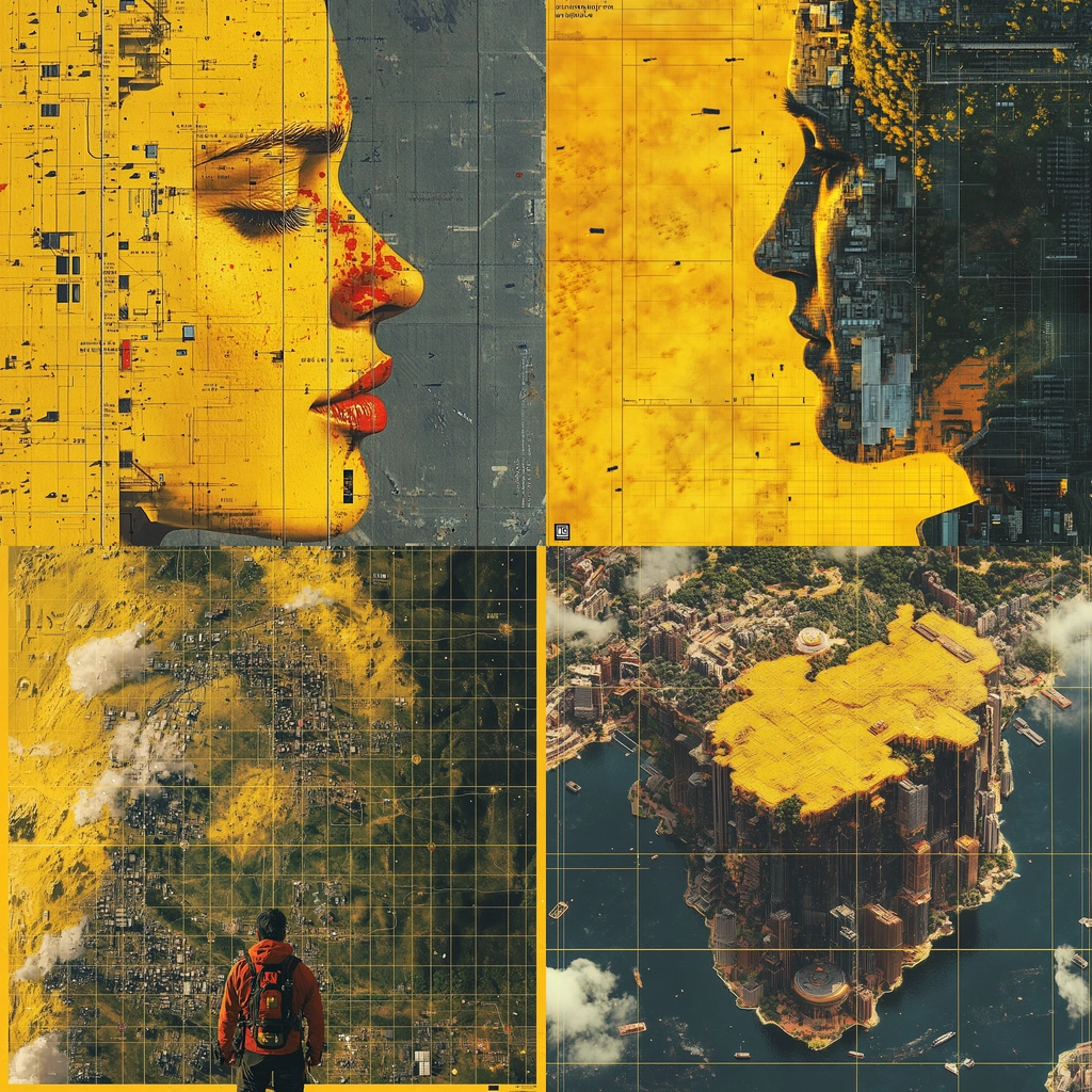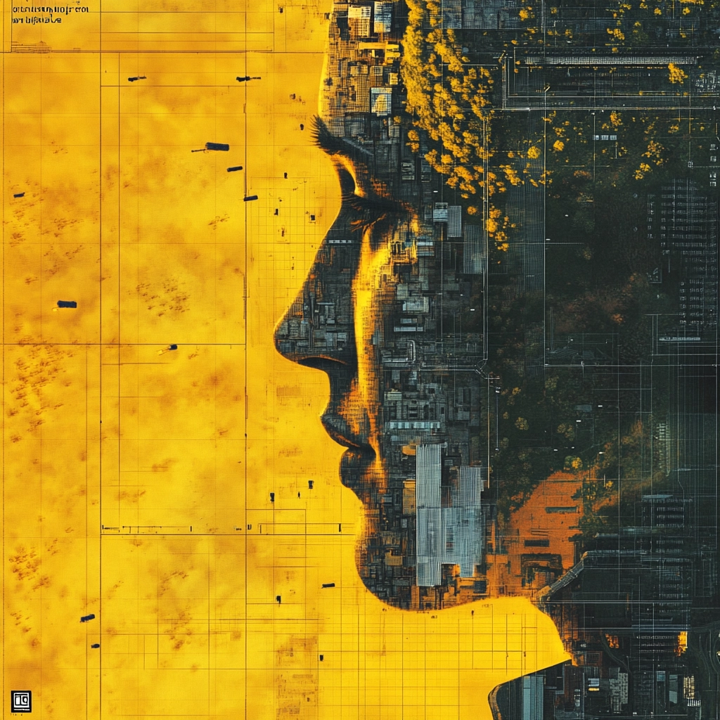 The grid pattern overlays add structure, contrasting with the organic shapes beneath. Predominantly yellow, gray, and green hues evoke an interplay between city and nature, enhanced by high contrasts and spatial depth.