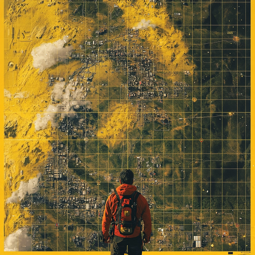 The image features a grid overlay on cityscapes with a striking juxtaposition of industrial and natural elements anchored in yellow and gray.