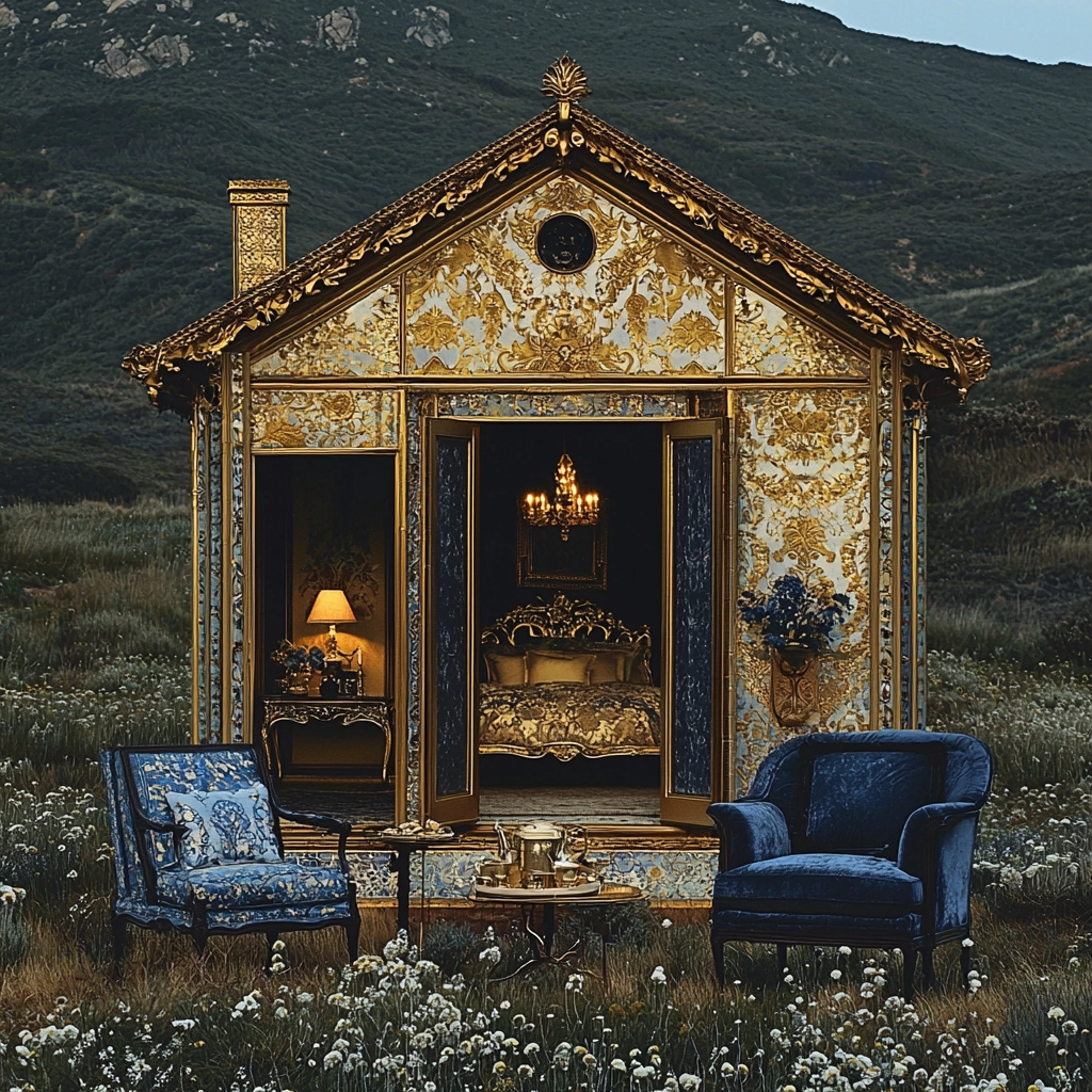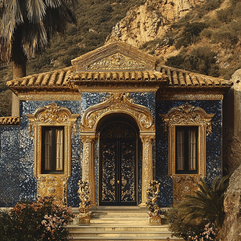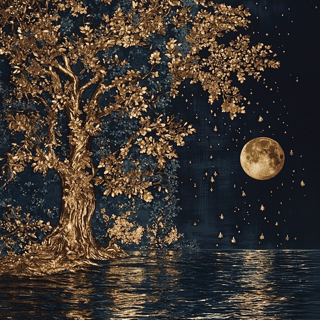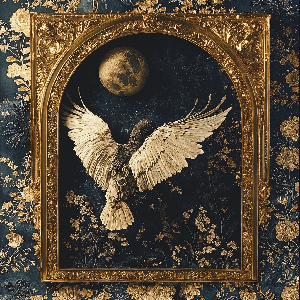 Rich use of opulent gold contrasts deep blues, creating an intricate baroque impression with a night-themed backdrop.