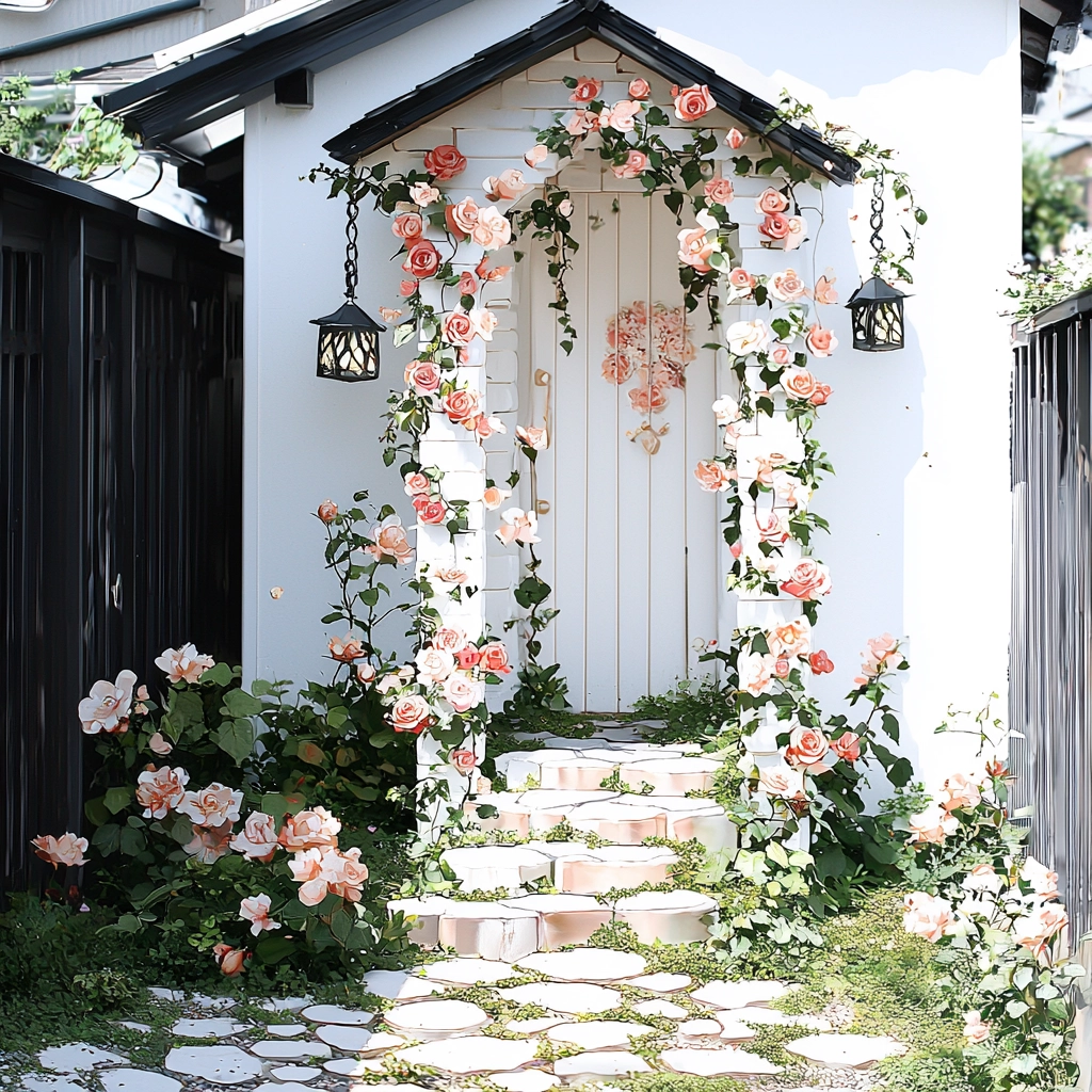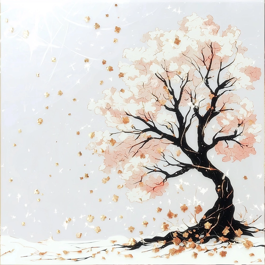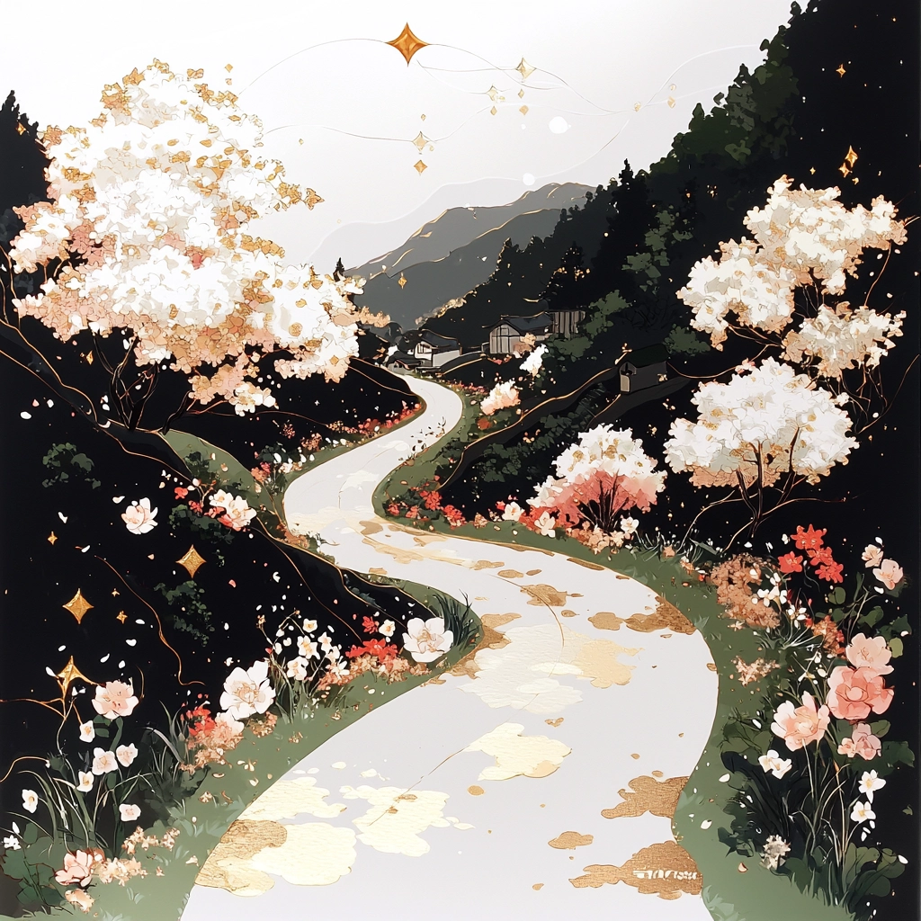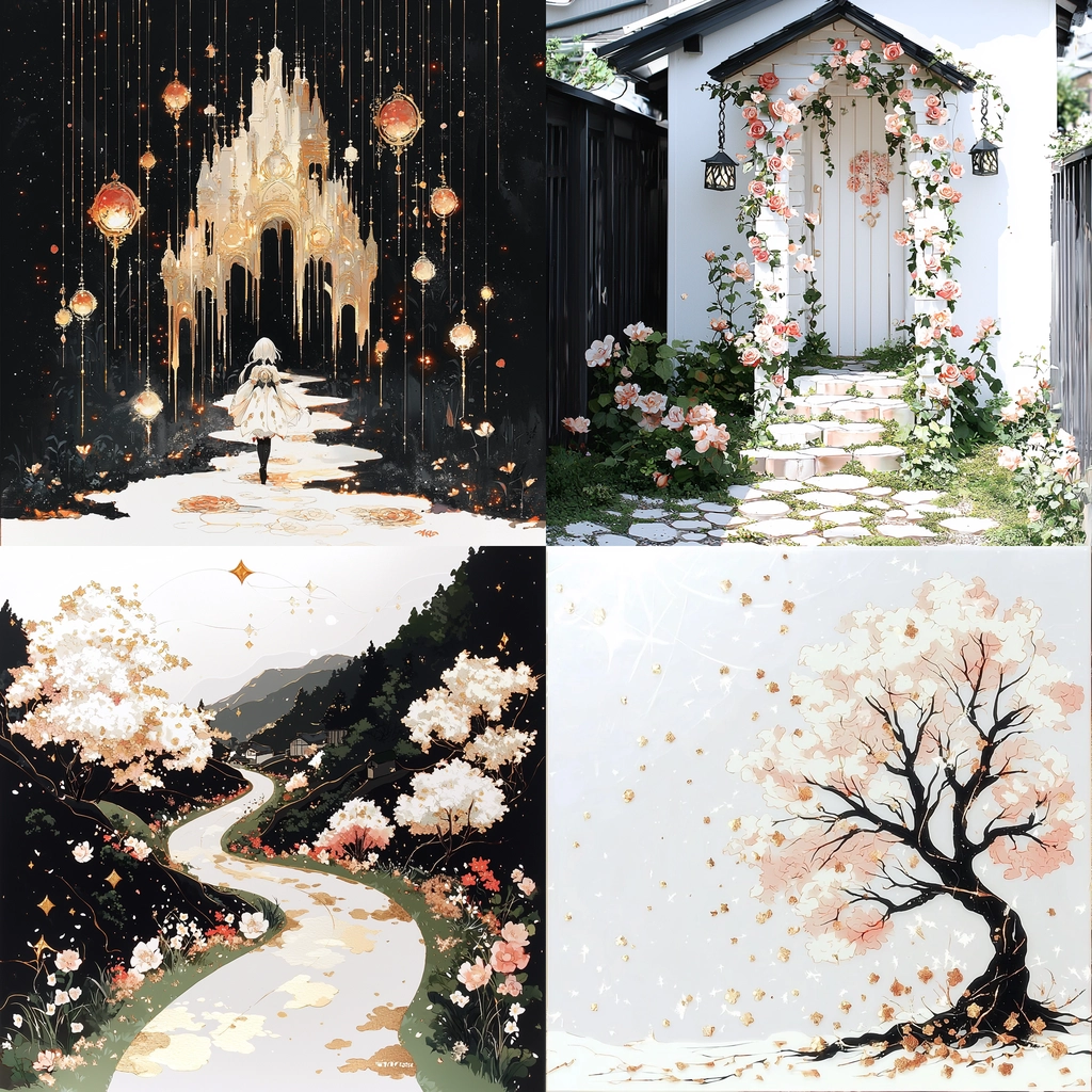 The lighting effects highlight the intricate textures of gold embellishments with a luminous effect, creating depth and contrast. The color characteristics emphasize an opulent sense with gold accents and delicate blossoms. Textures range from smooth surfaces to textured foliage, enhancing the spatial sense within the compositions.