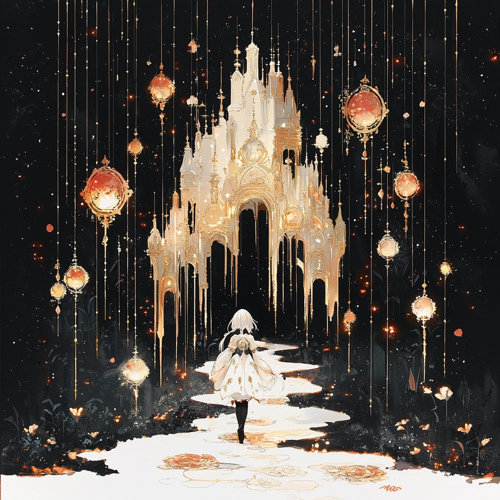 Elegant balance of ornate gold and soft pale blooms set against dark backgrounds.