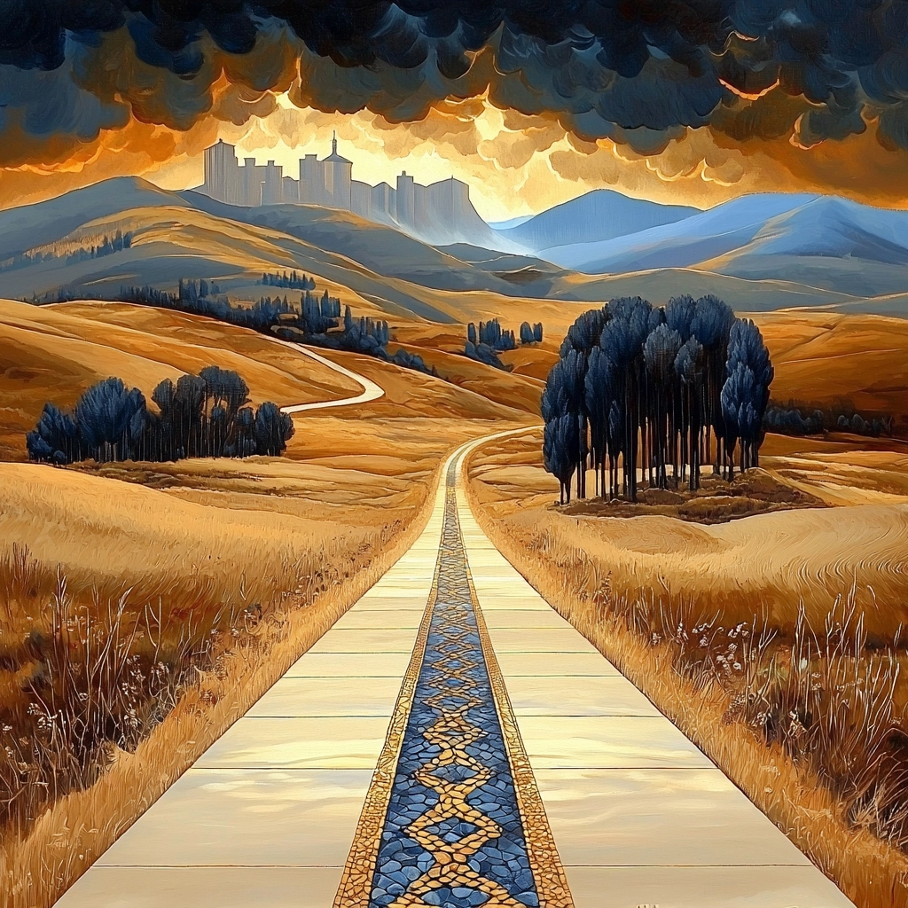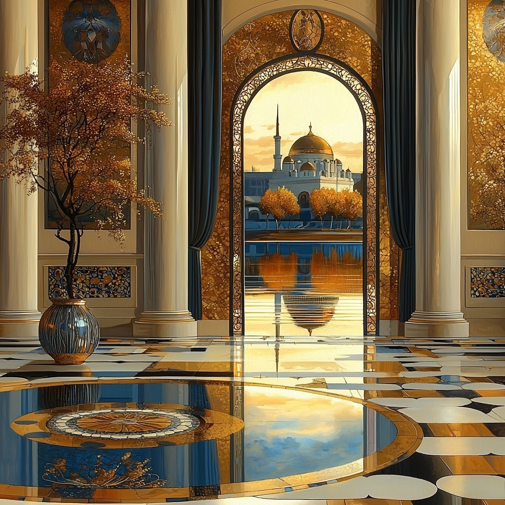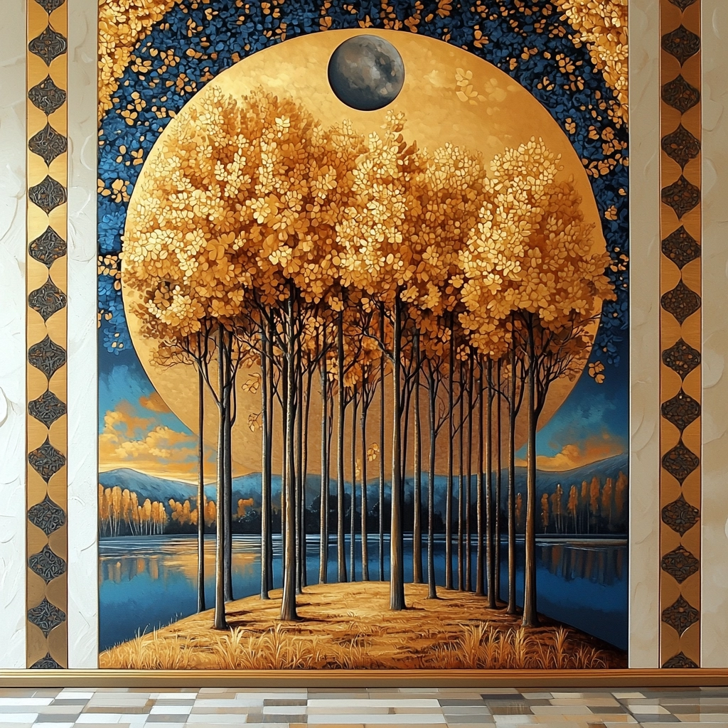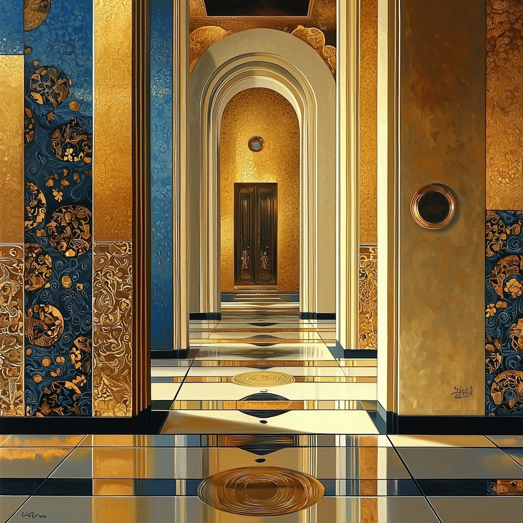 A sophisticated composition featuring intricate patterns and strong color contrasts in gold and blue.