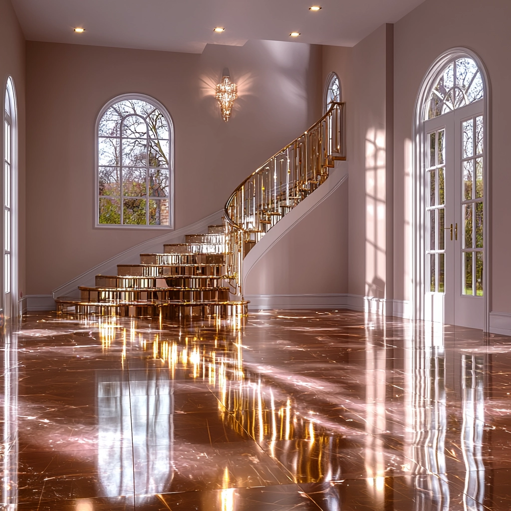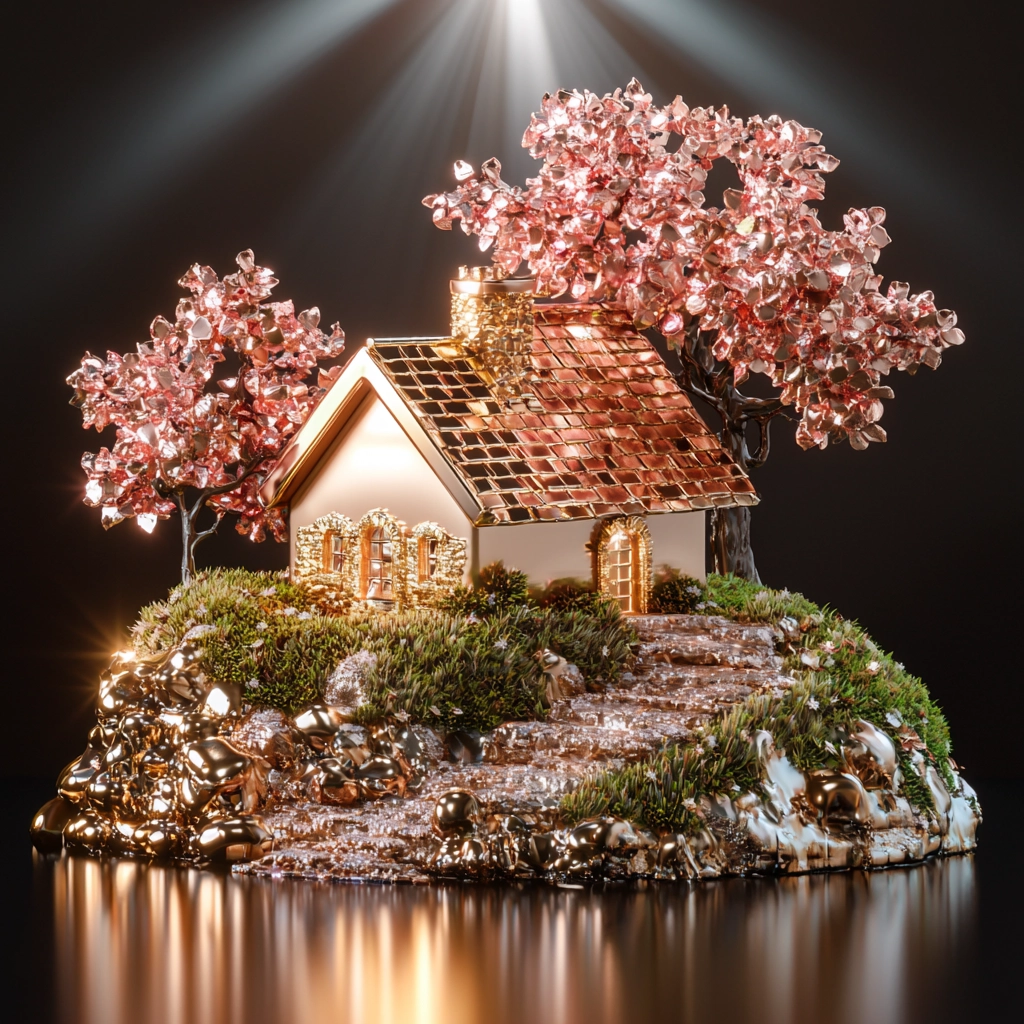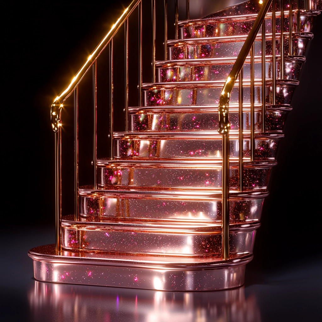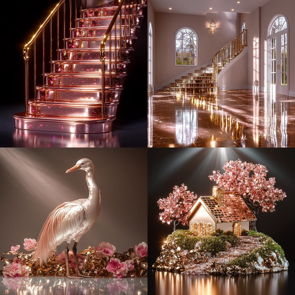 The use of lighting techniques creates a radiant glow, accentuating the richness and luster of pink and gold hues. The reflective surfaces enhance the spatial sense, providing depth and complexity. Texture is expressed with smooth finishes, boosting the clarity and realism of the scene.