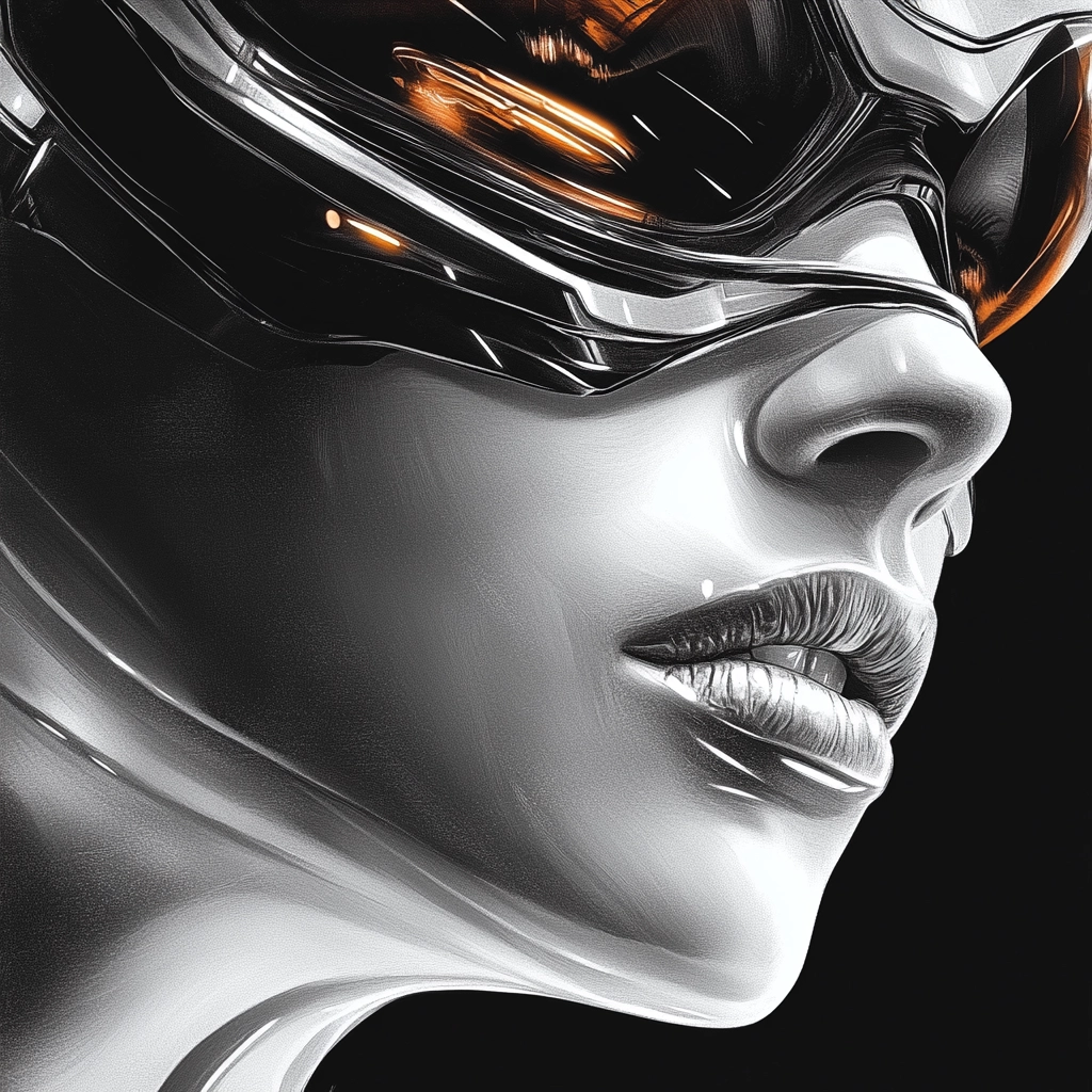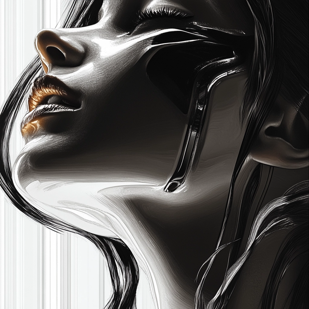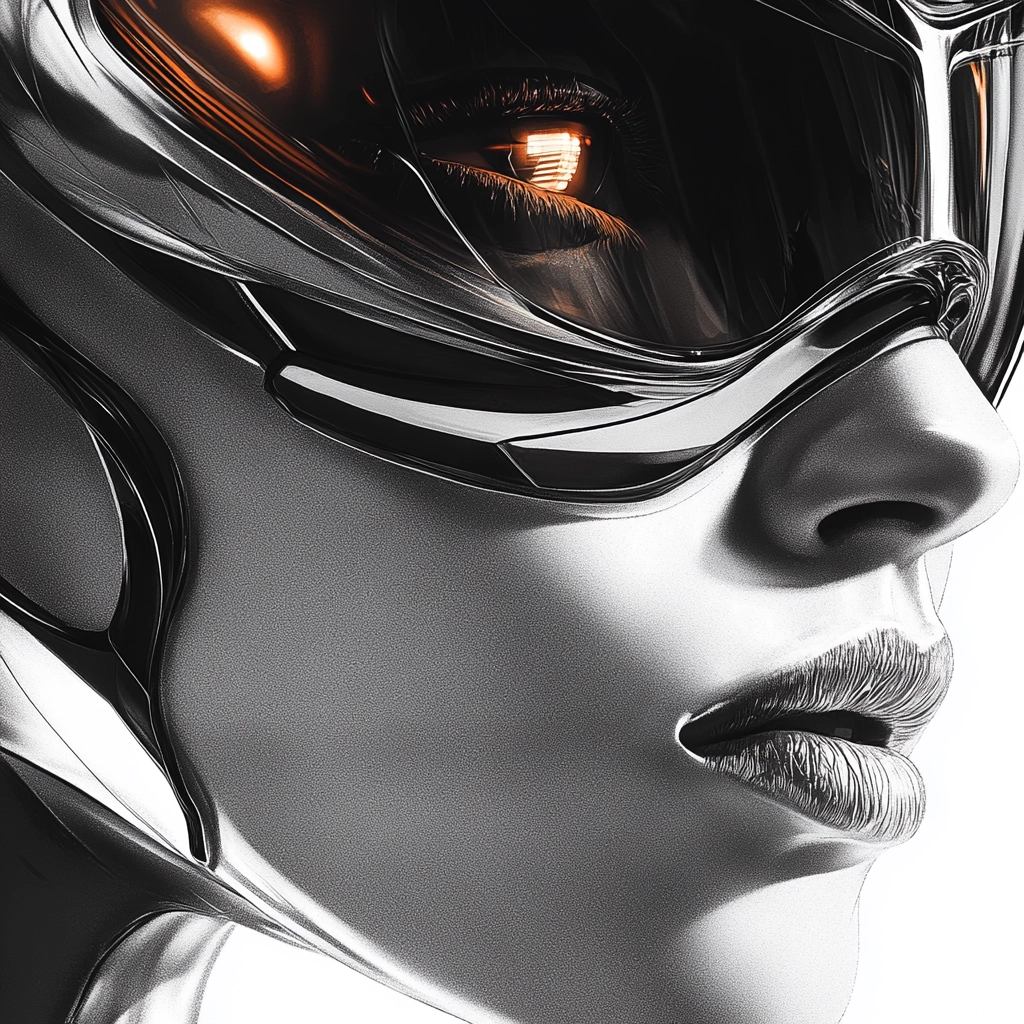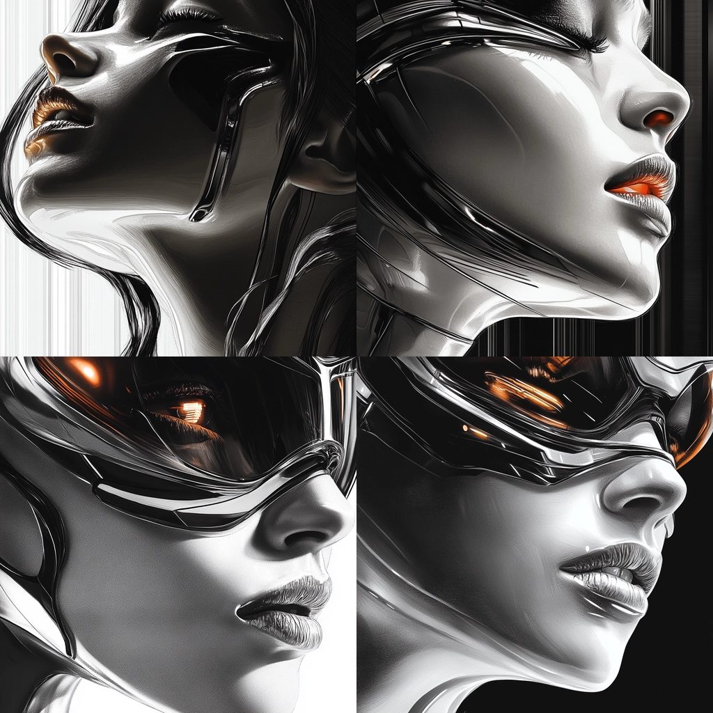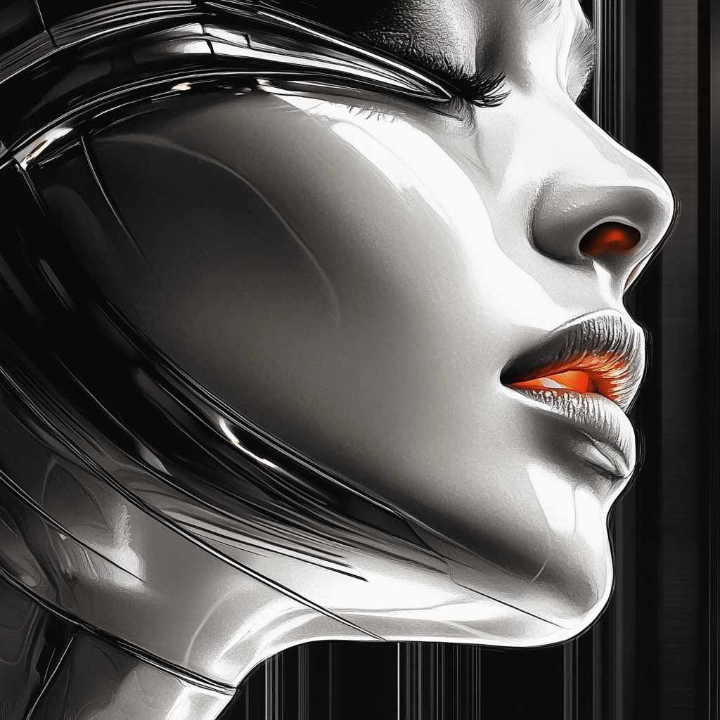 Using high contrast lighting and smooth, reflective textures, the image captures a sense of fluid motion through glossy, undulating surfaces. The distinctive layering of light and shadow enhances the metallic sheen and offers a sense of depth and space.