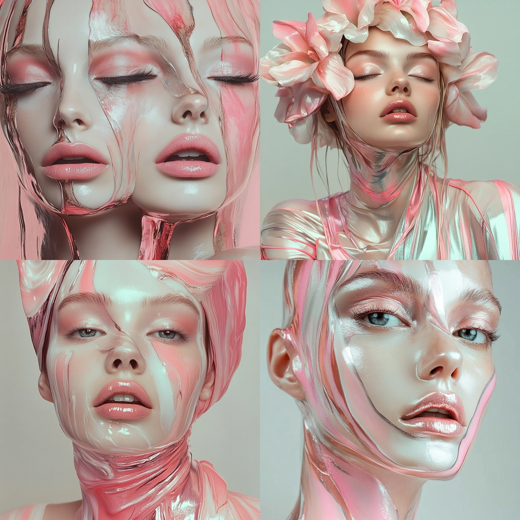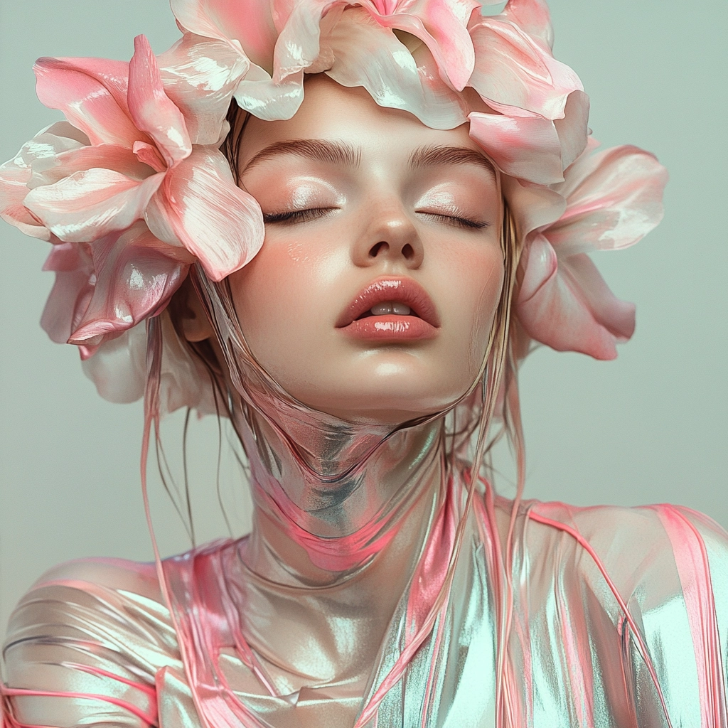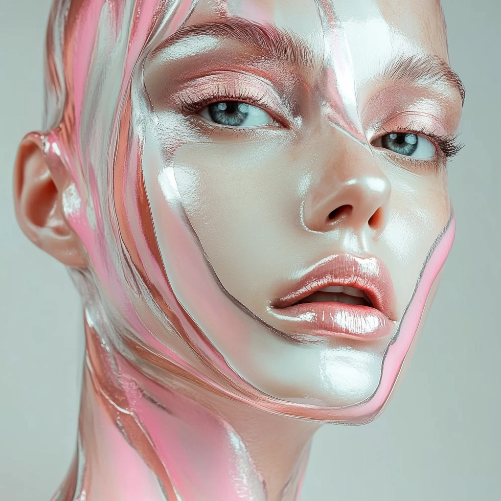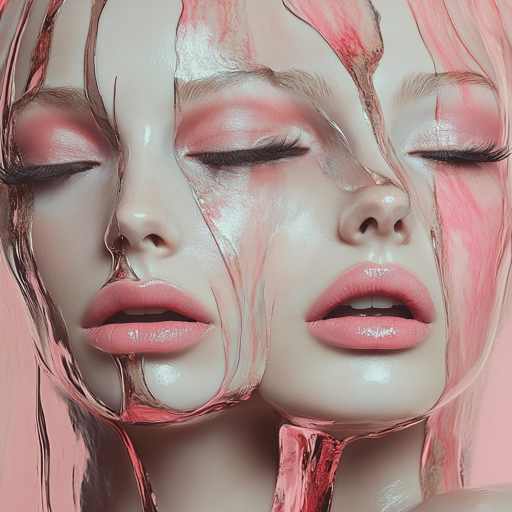 The composition features a glossy surface with flowing textures, highlighted by soft pink and white hues against a subtle beige background.