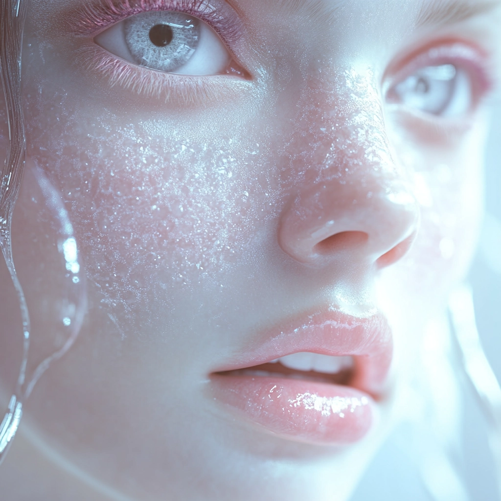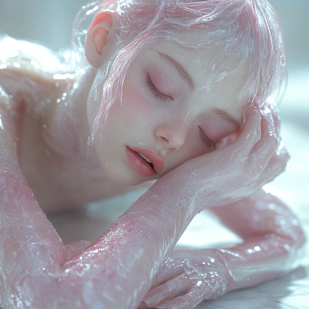 The lighting is diffused and gentle, highlighting a glossy surface which enhances the realistic details. The colors are predominantly pastel, offering a soft texture and harmonious blending, where spatial depth is subtly emphasized, giving a tactile quality.