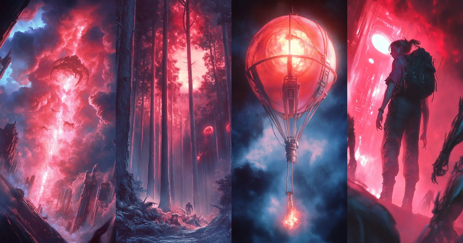 Intense neon-like red colors illuminate the scene, contrasting with deep blue shadows. The interplay of light focuses attention on vivid focal points. The texture ranges from smooth gradients to soft details, enhancing the depth and space within each image.