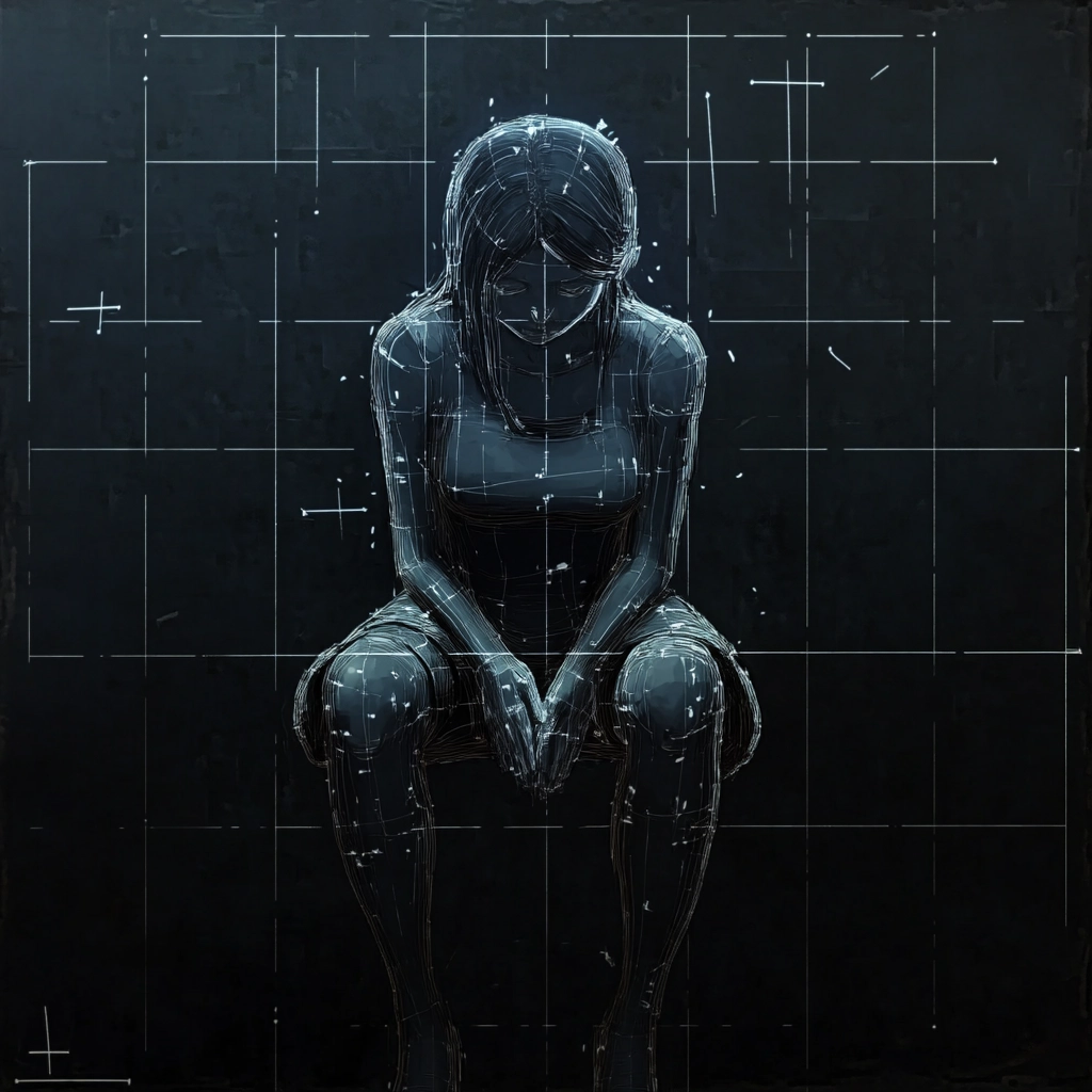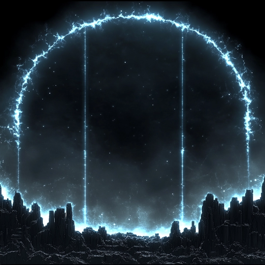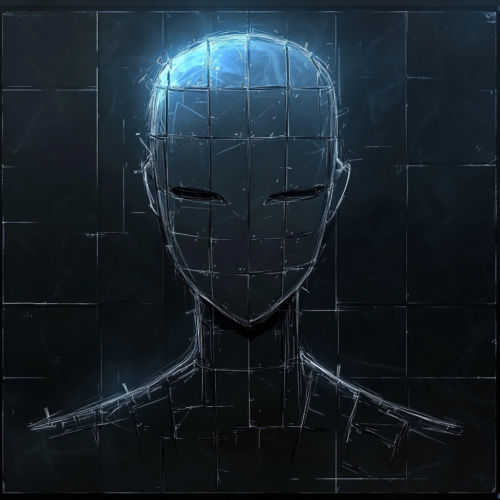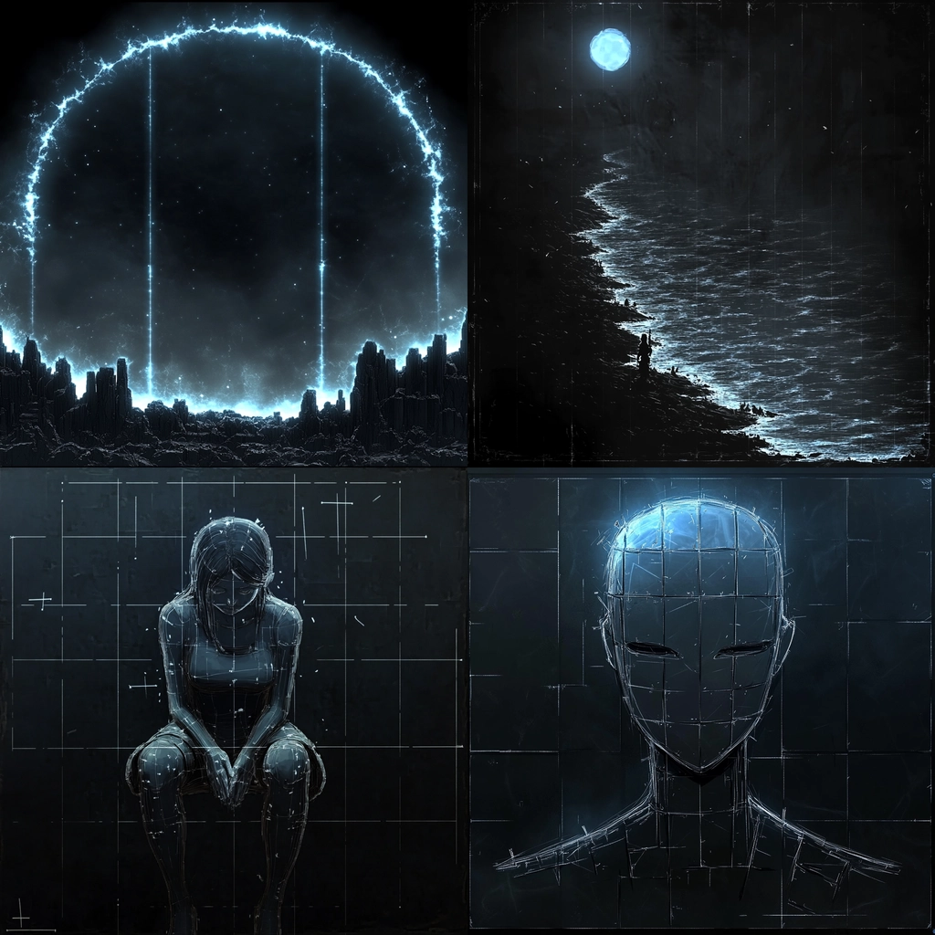 The composition uses cyan illuminations against dark blue background to contrast light and shadow.