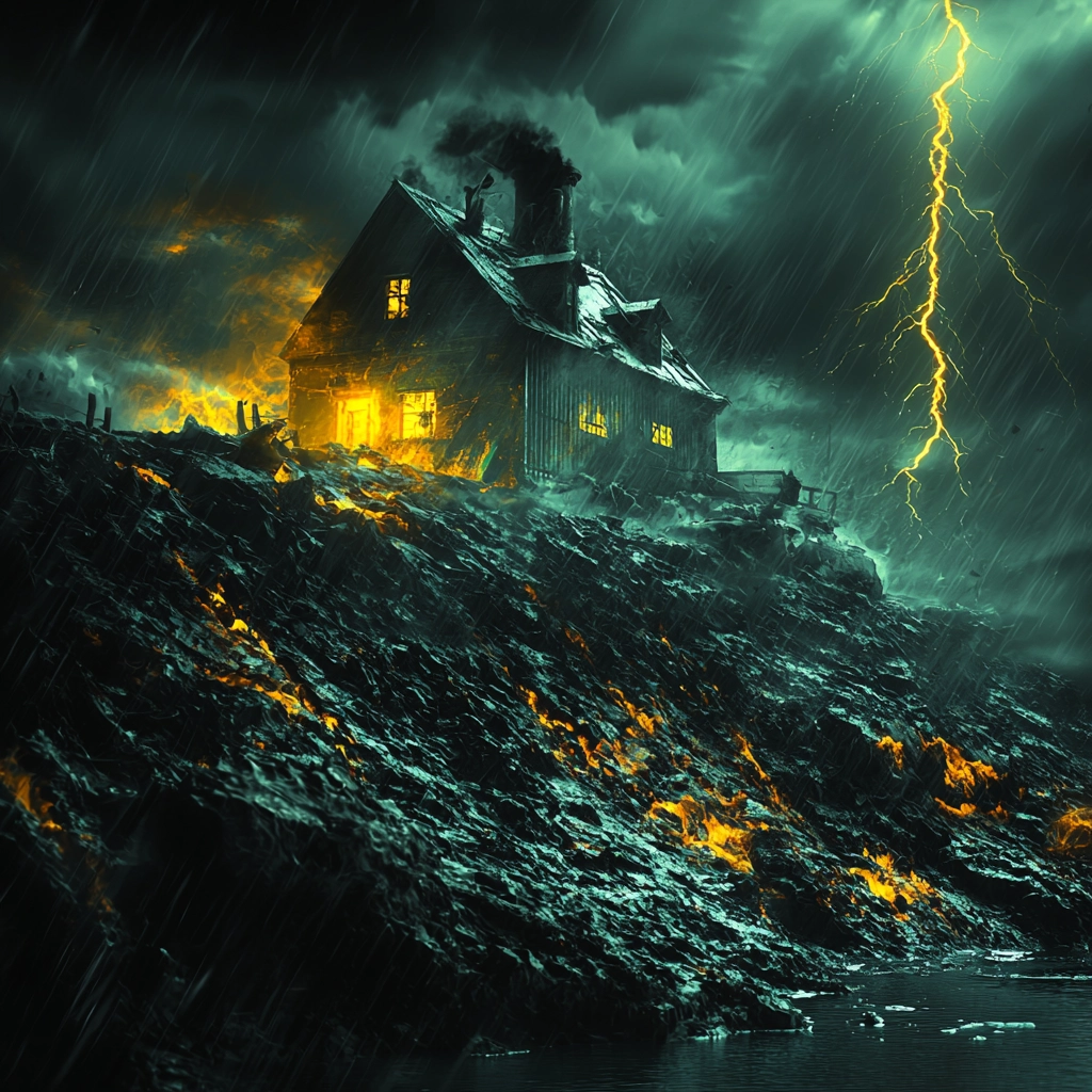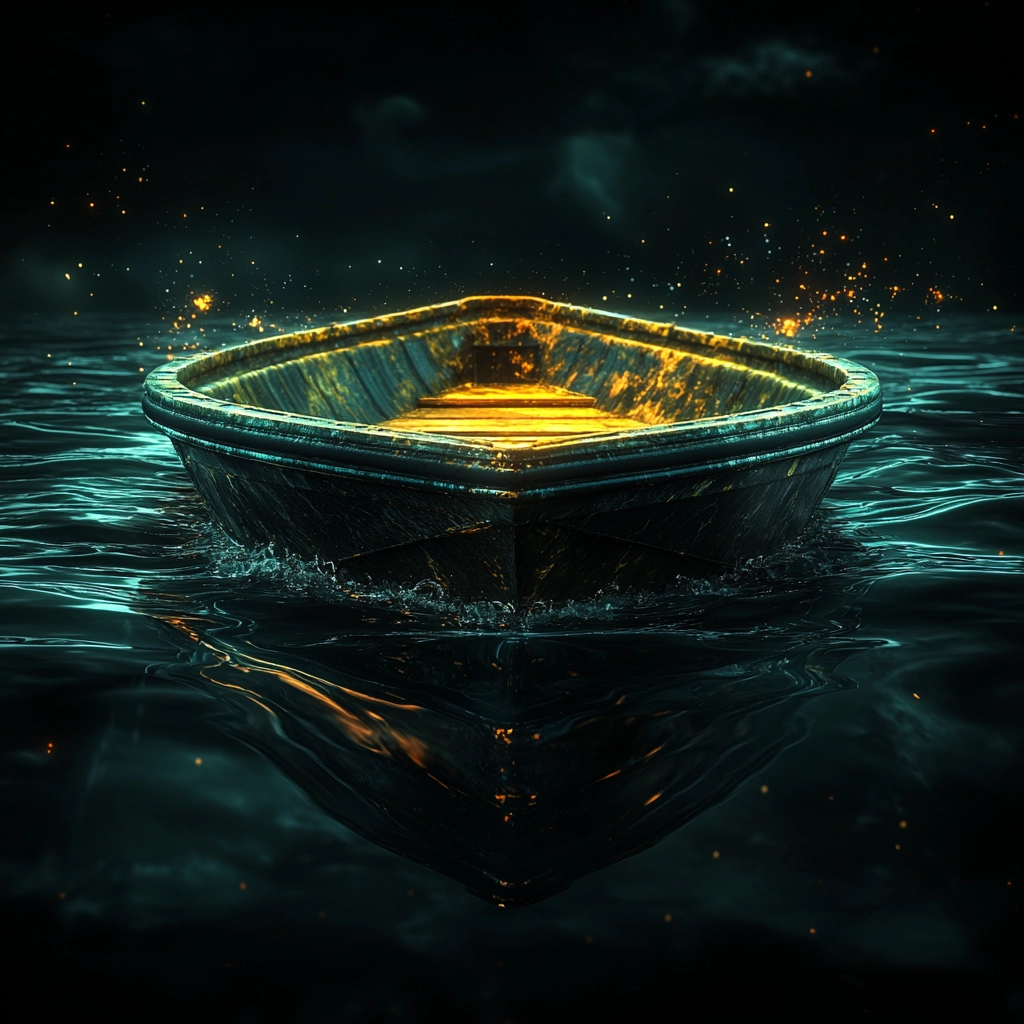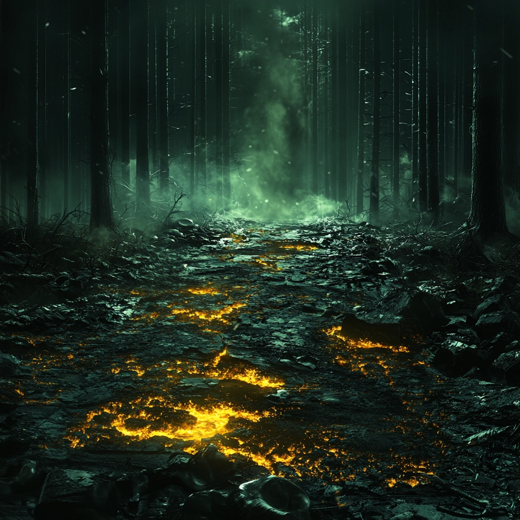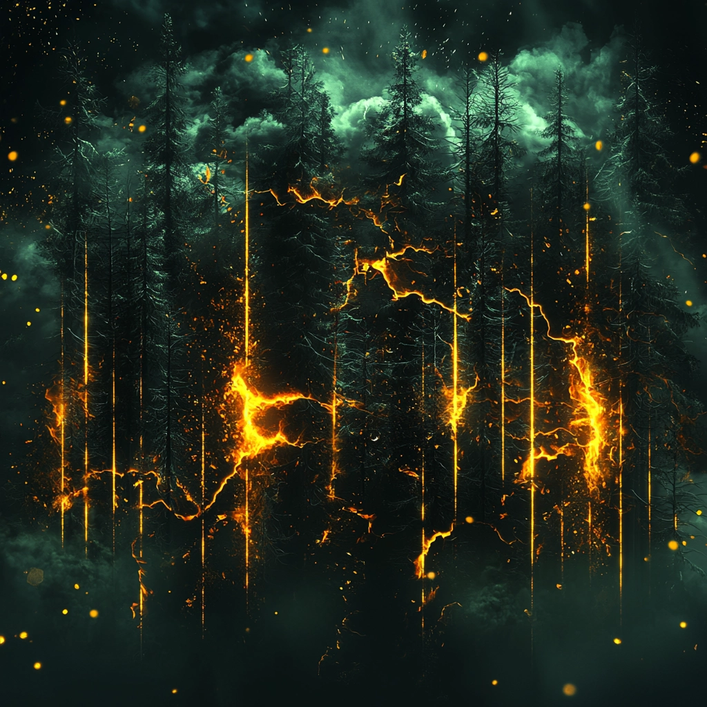 The use of striking lighting juxtaposes brightly glowing orange hues against deep green and dark blue backgrounds. A strong sense of depth is cultivated by these contrasts, paired with a textured expression that certain areas of the visual space shimmer with light, bringing out the drama in the dynamic composition.