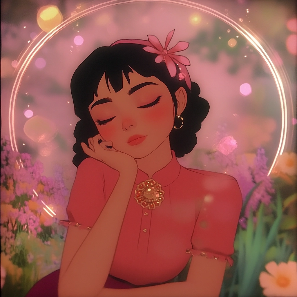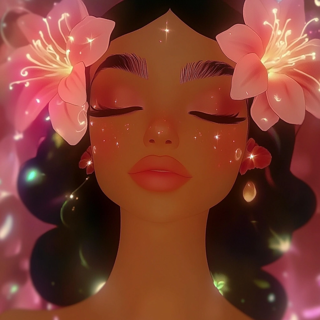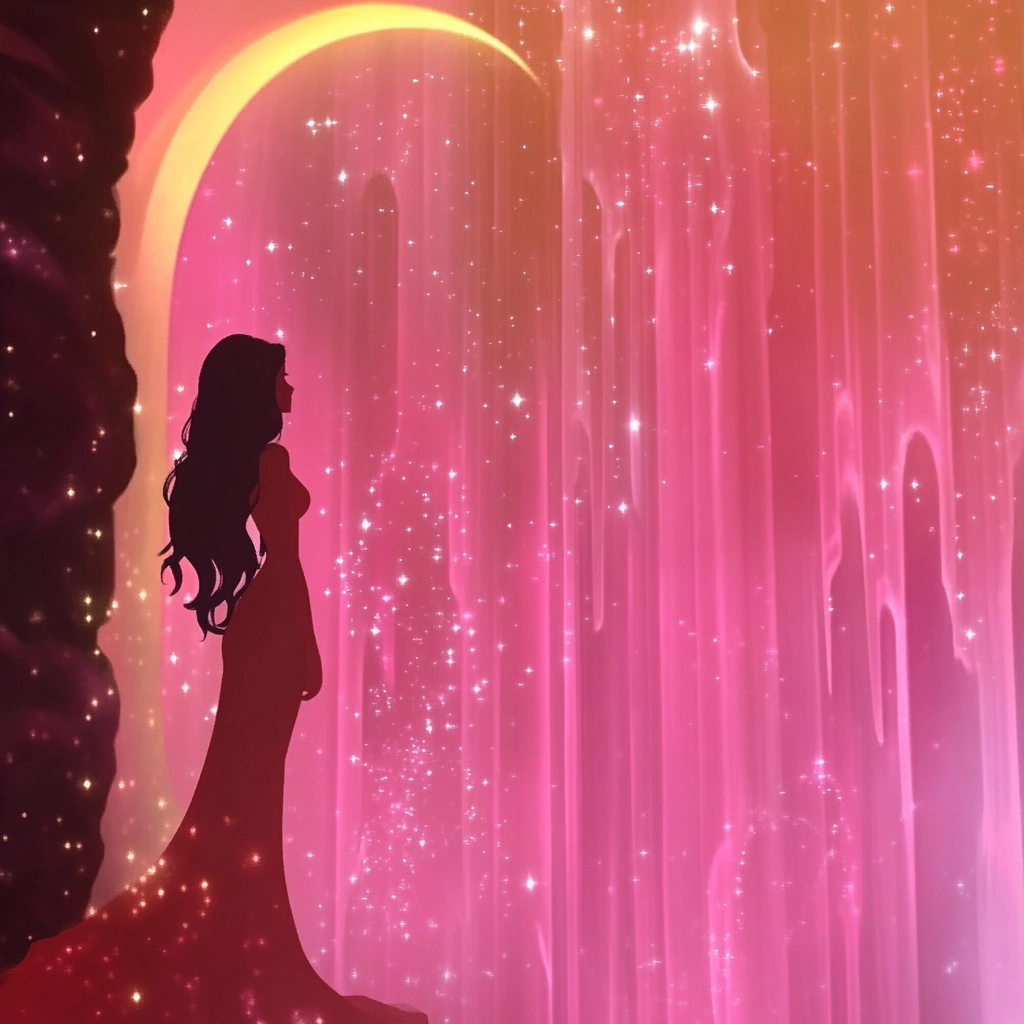 Lighting creates a luminous sheen across surfaces, emphasizing a rich palette of pink and gold hues. The spatial composition feels intimate, with varying textured elements enhancing depth and visibility across individual parts.