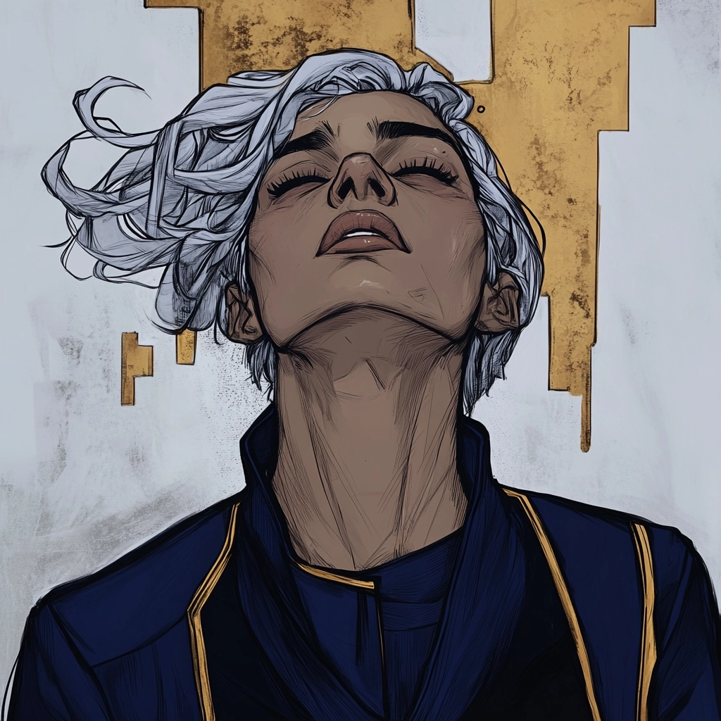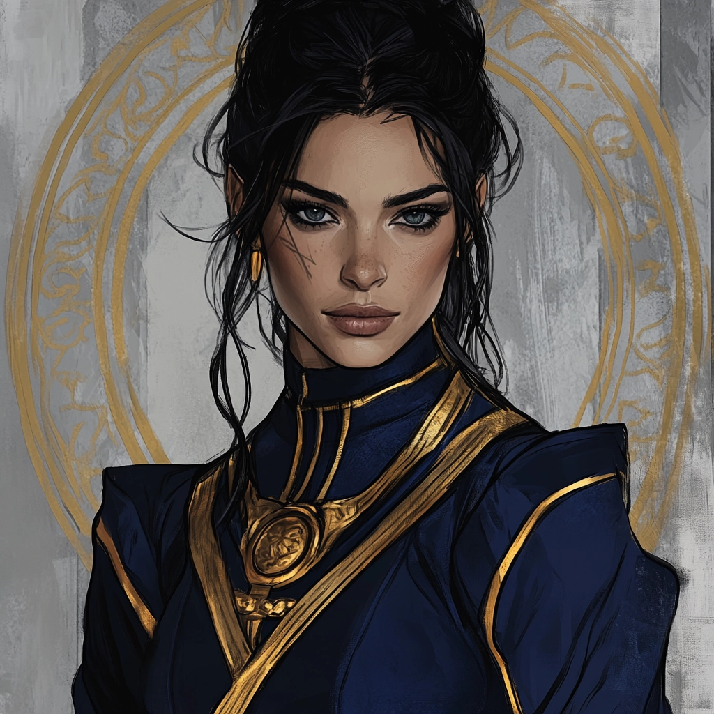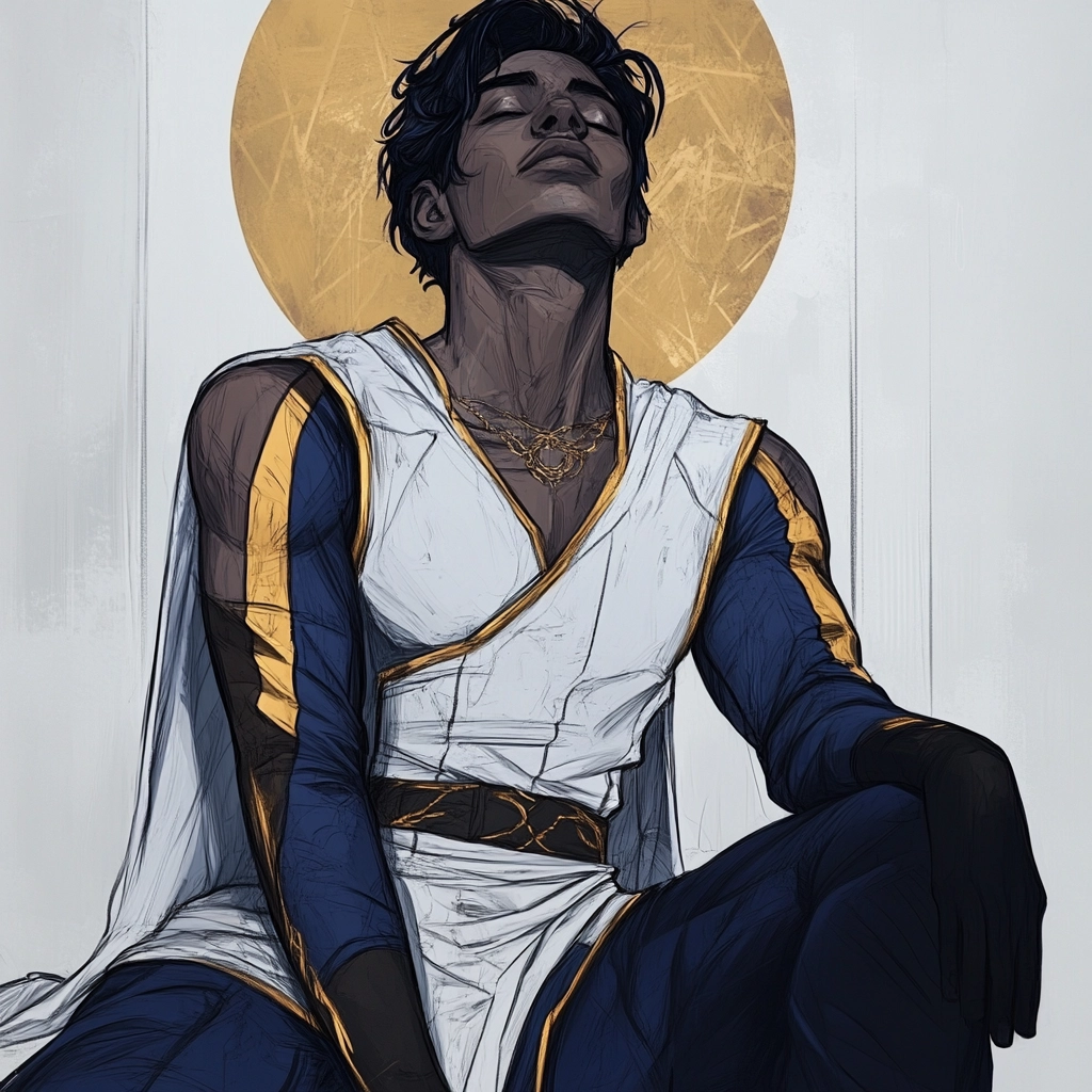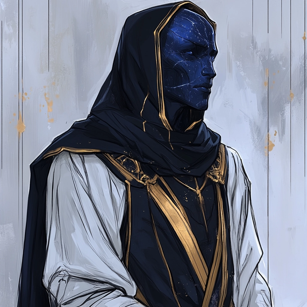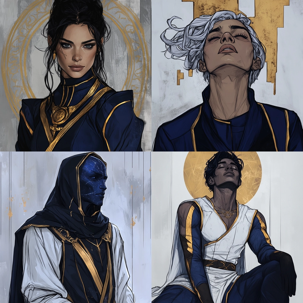 Dynamic lighting highlights the intricate gold accents on dark blue garments, creating a strong contrast. The texture is smooth yet detailed, emphasizing depth and elegance. Spatial arrangements lend subtle depth and focus.