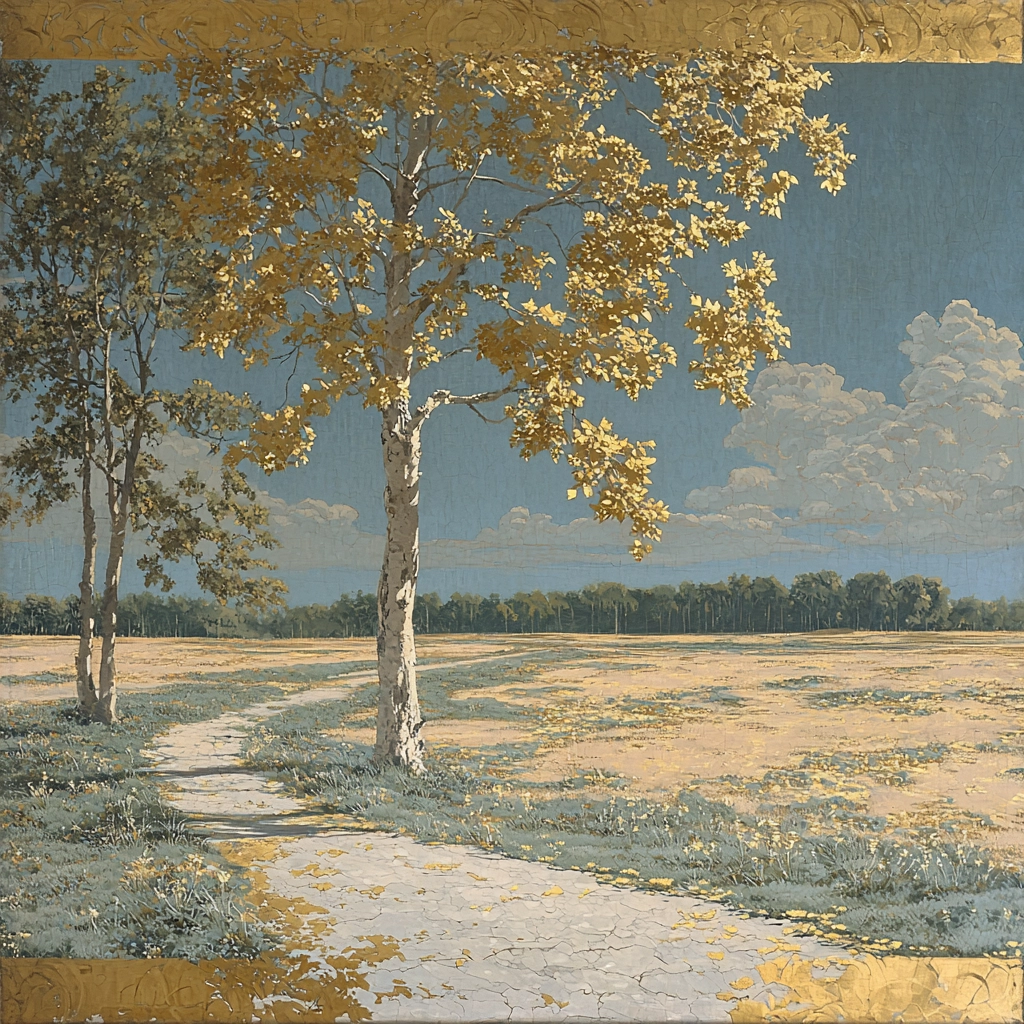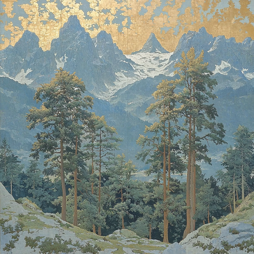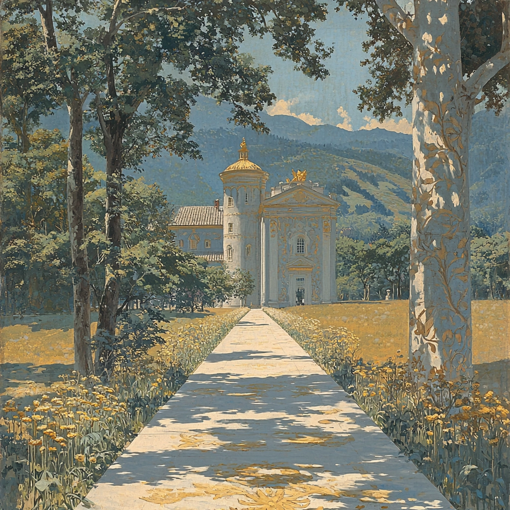 The lighting effect is bright and evenly distributed, enhancing the clarity of the scene. Colors are harmonious with a focus on cool blues that provide a serene backdrop, punctuated by reflective gold accents that bring warmth and focal points. The texture is realistically rendered, with careful attention to minute details, contributing to a strong sense of depth and space.