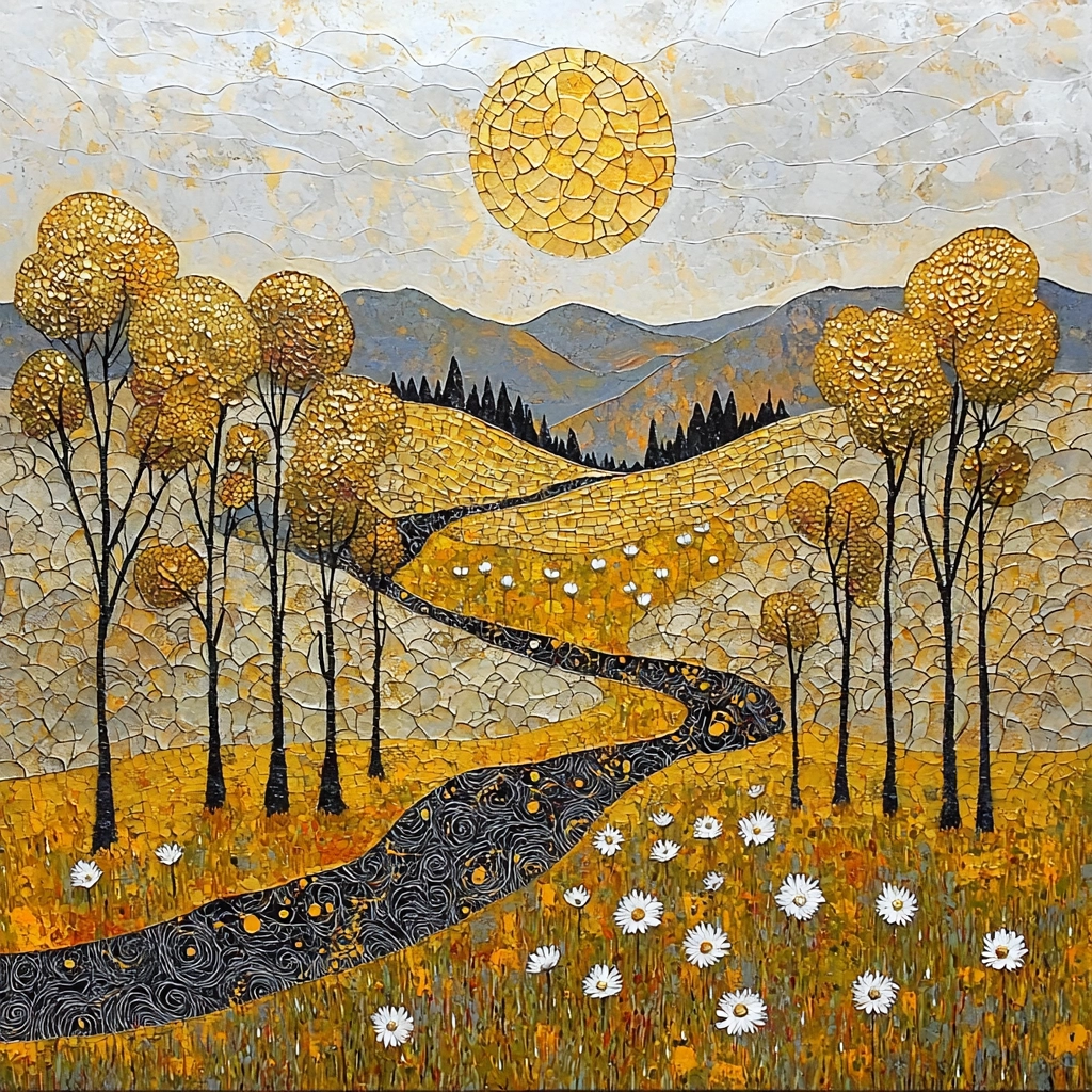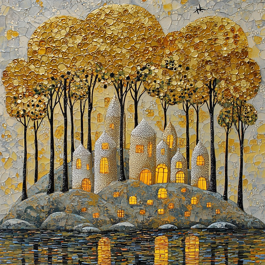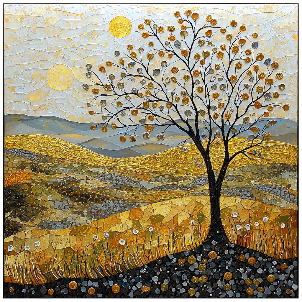 The interplay of light emphasizes gold hues, creating a layered and textured appearance. Elements of nature are presented with stylized lines, enhancing the depth through contrasting shades, and surfaces are infused with tactile richness.