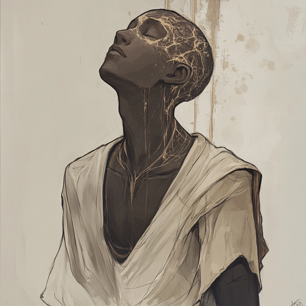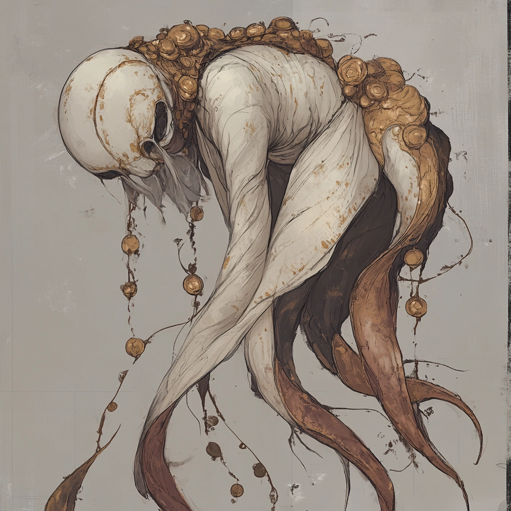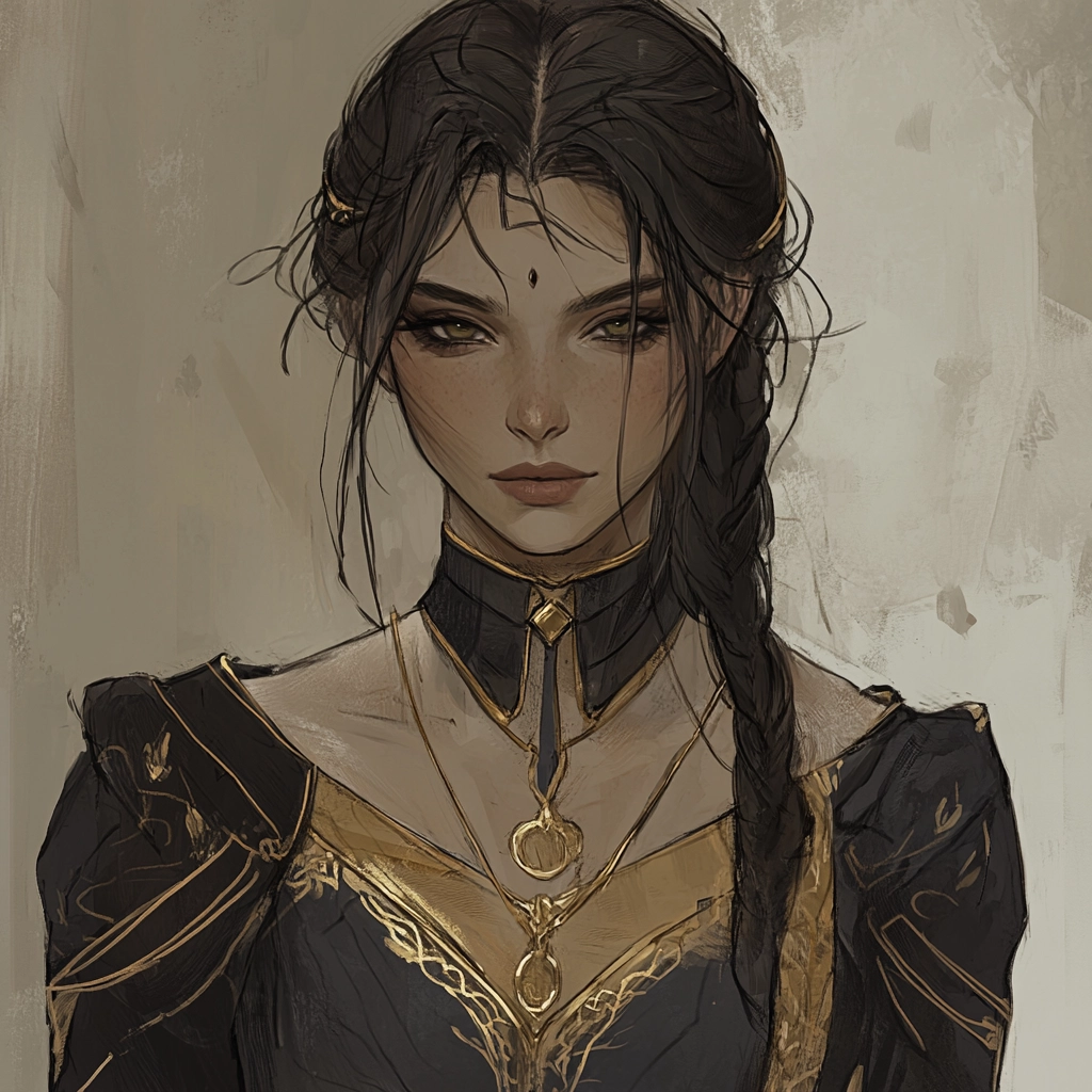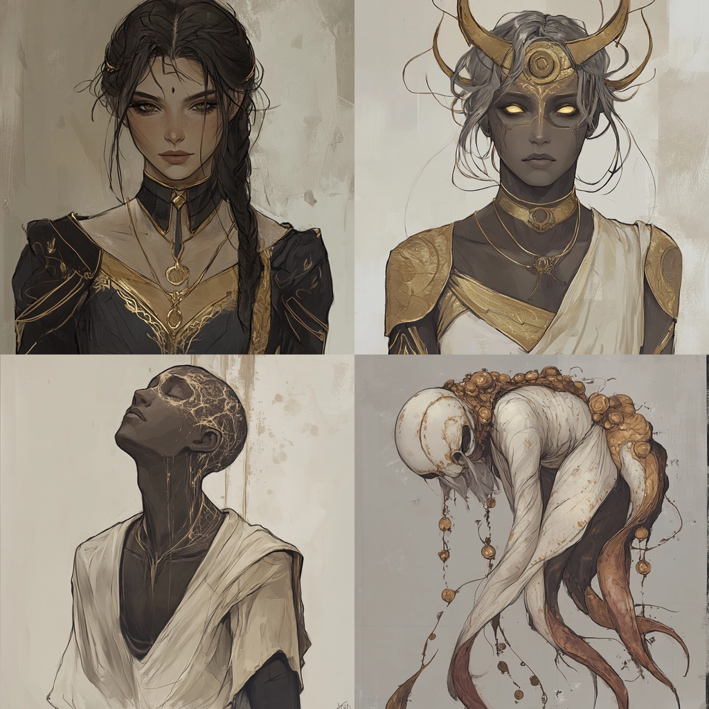 The lighting is subdued, enhancing the boldness of the black and gold elements against the pale background. Gold accents detail the rich textures, creating depth and dimensionality. The spatial composition is tight, emphasizing intricately designed garments and forms.