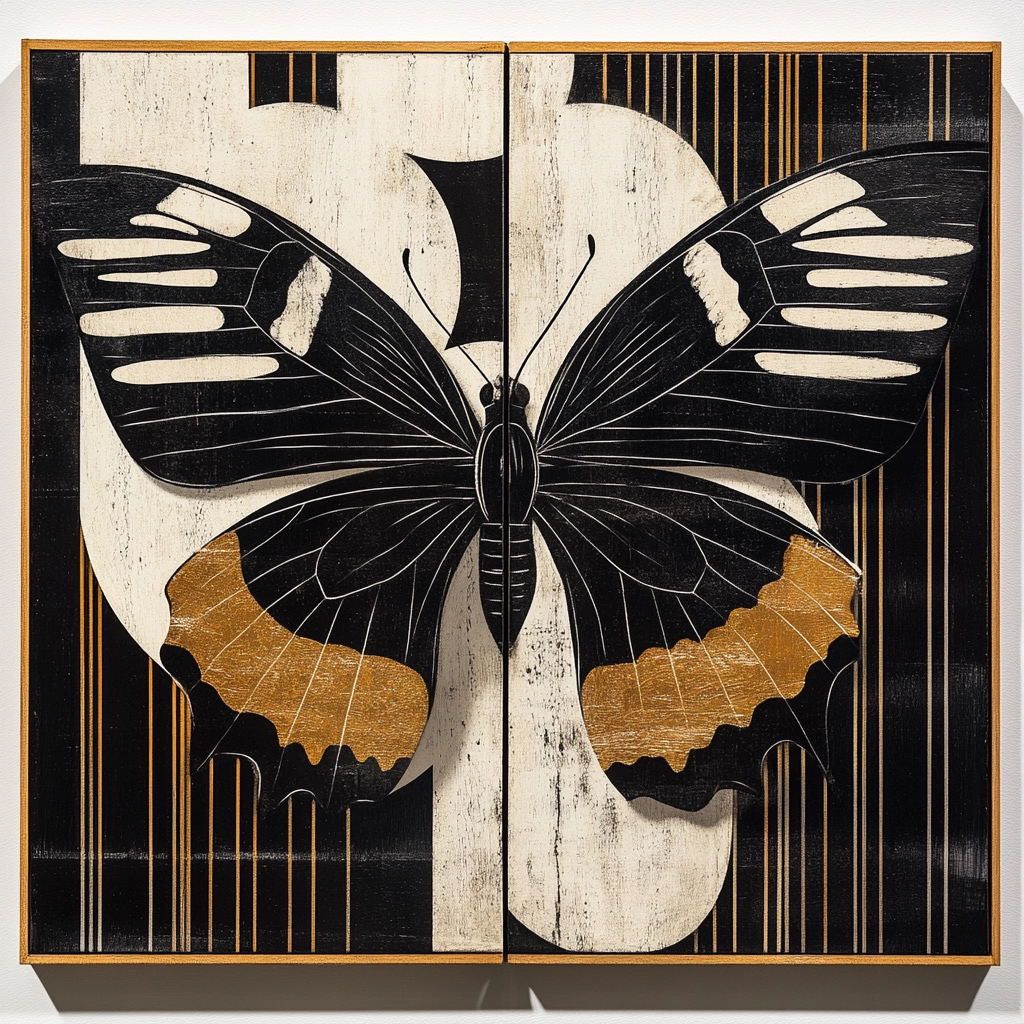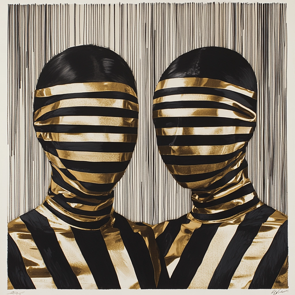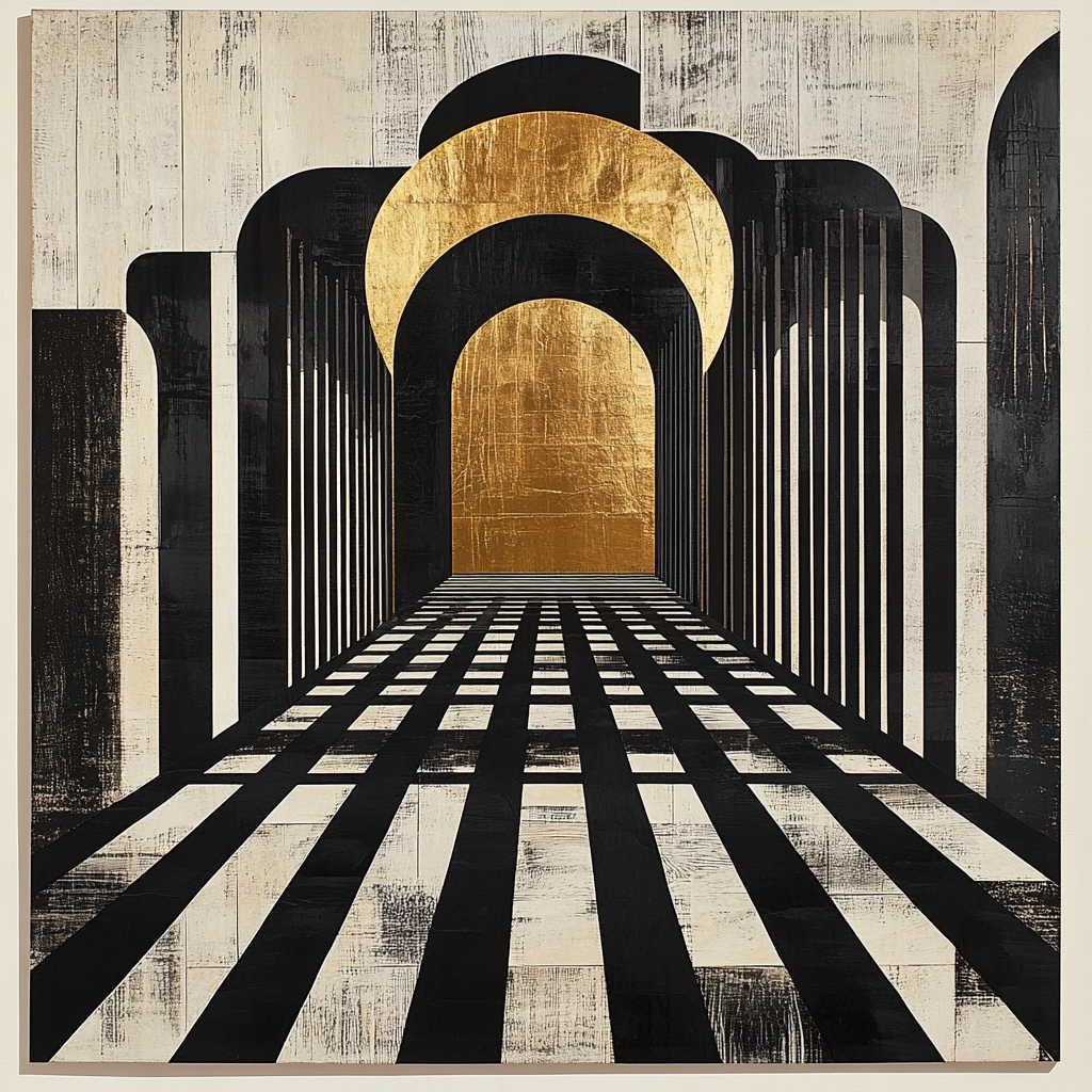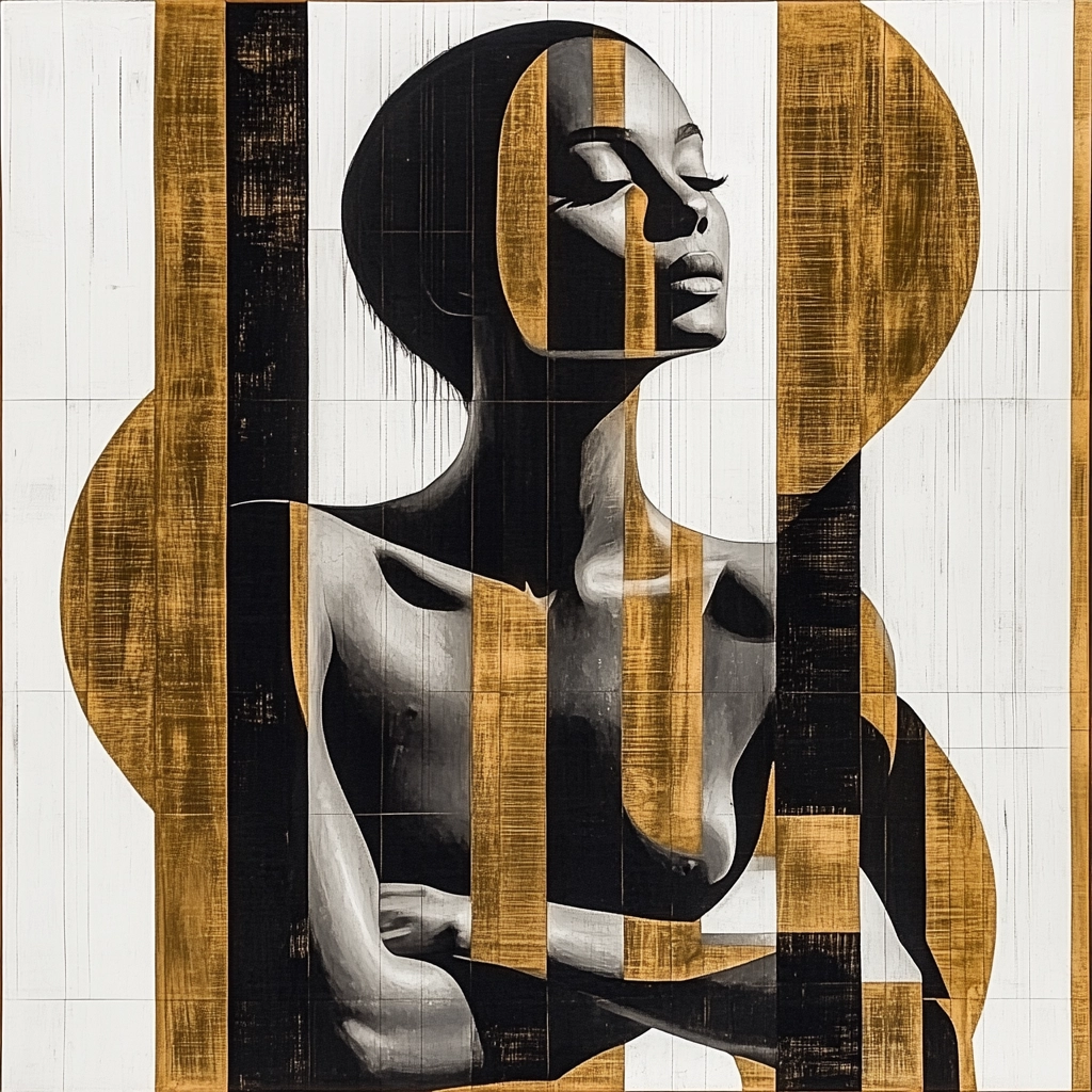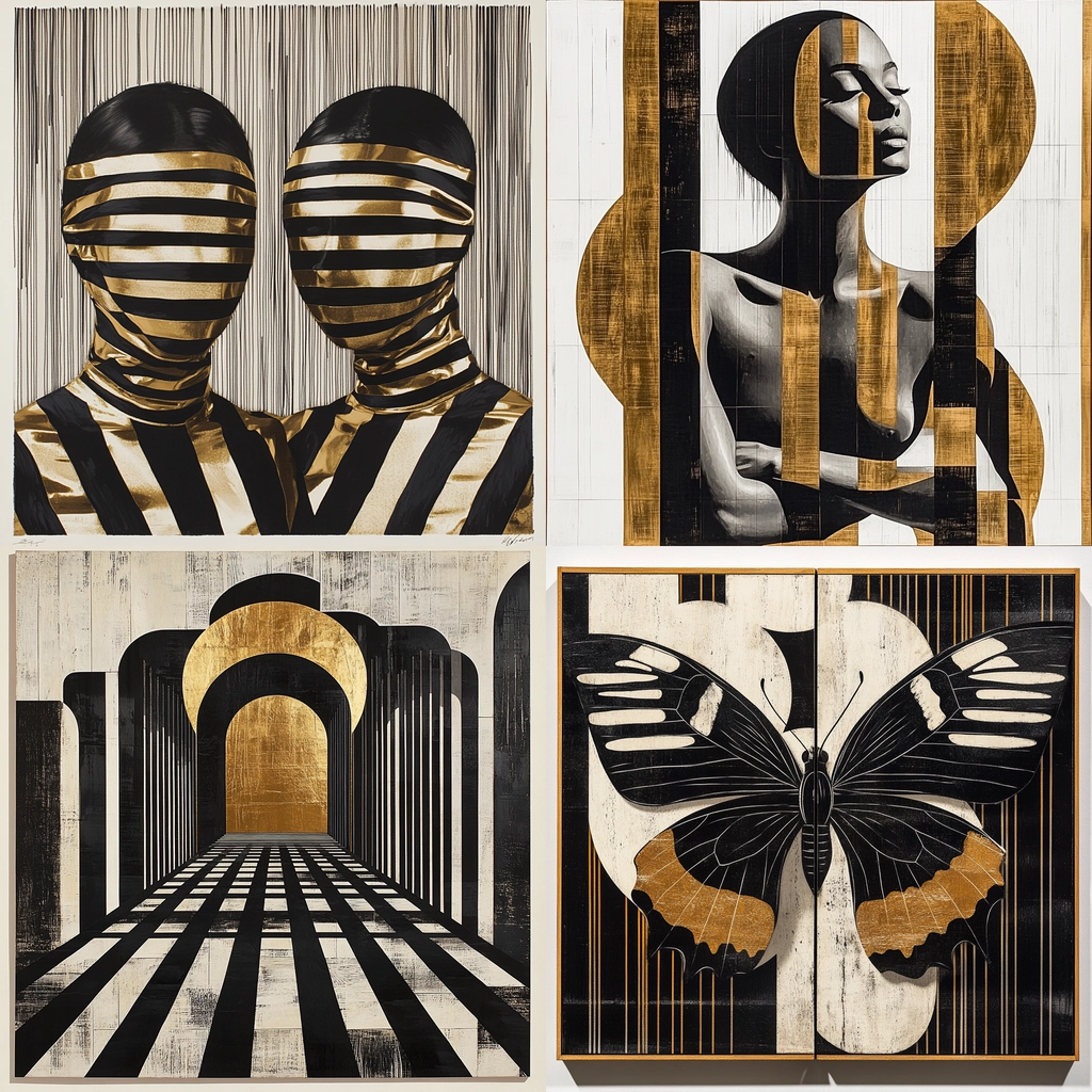 Bold use of black and white stripes juxtaposed with metallic gold highlights creates a strong contrast and clear spatial divisions, emphasizing geometric and organic forms across the composition.