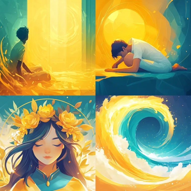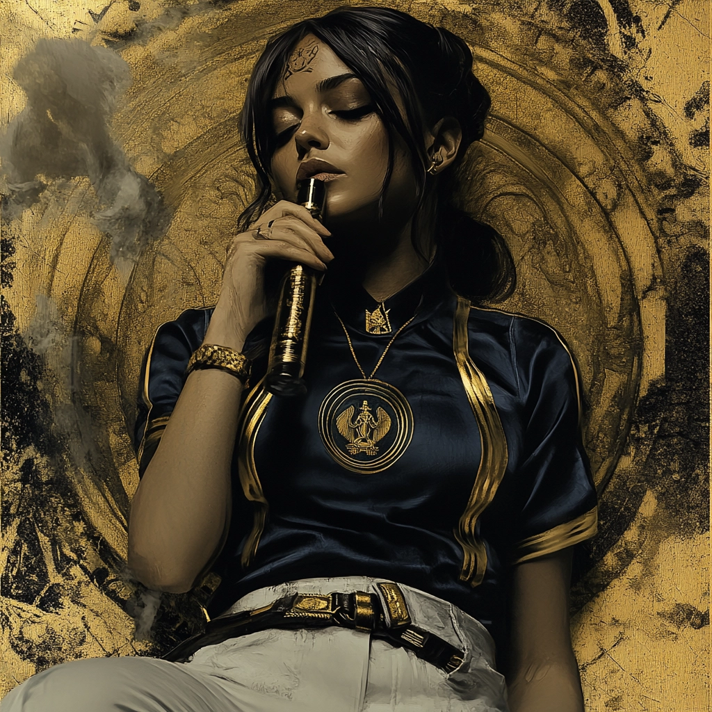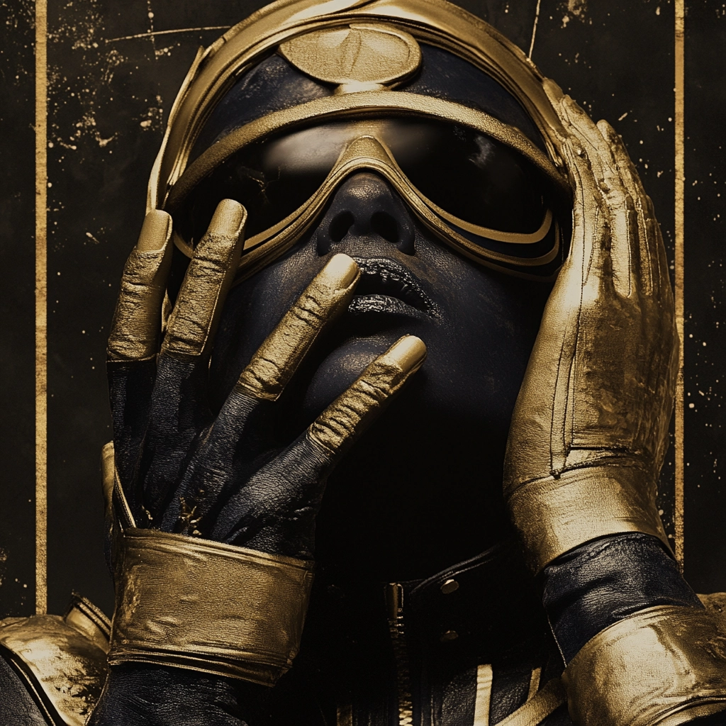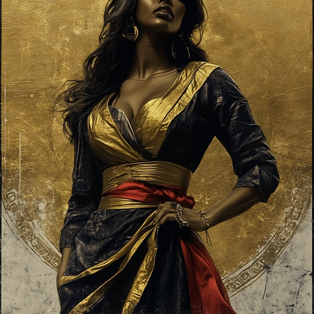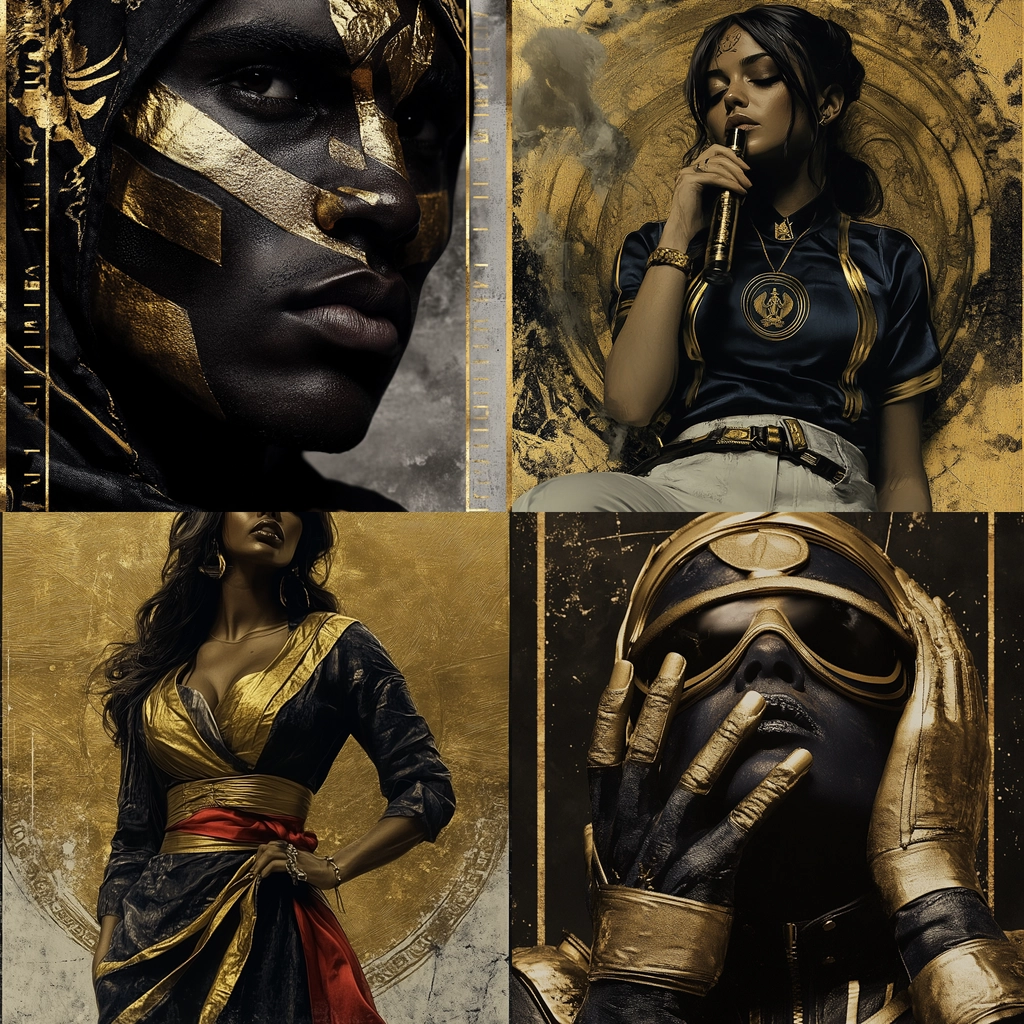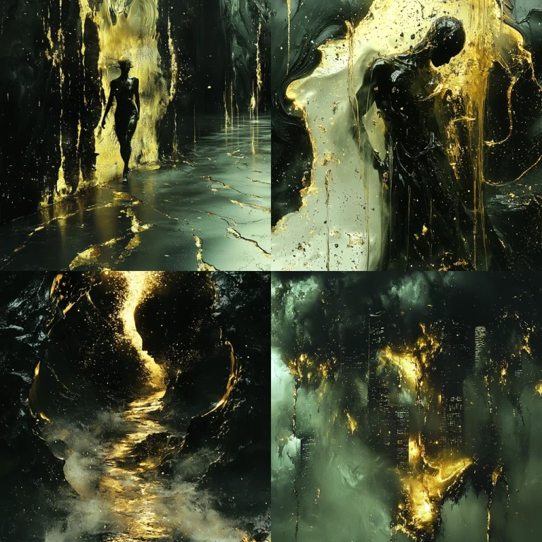 Rich gold tones juxtapose with dark blue textures, creating a dramatic interplay.