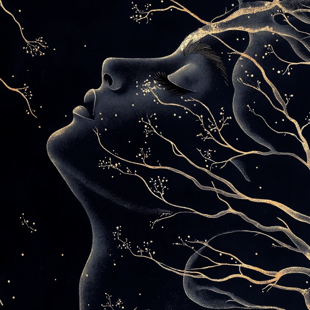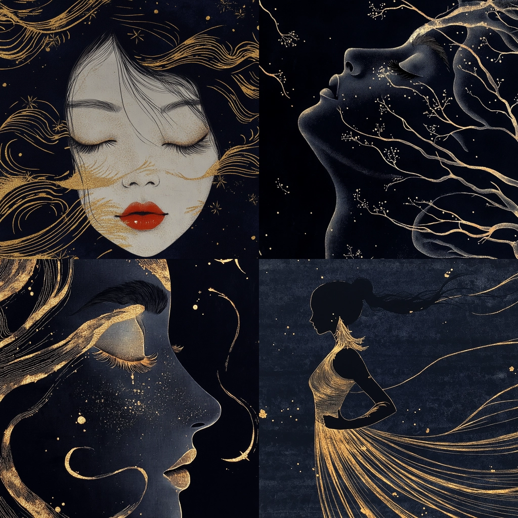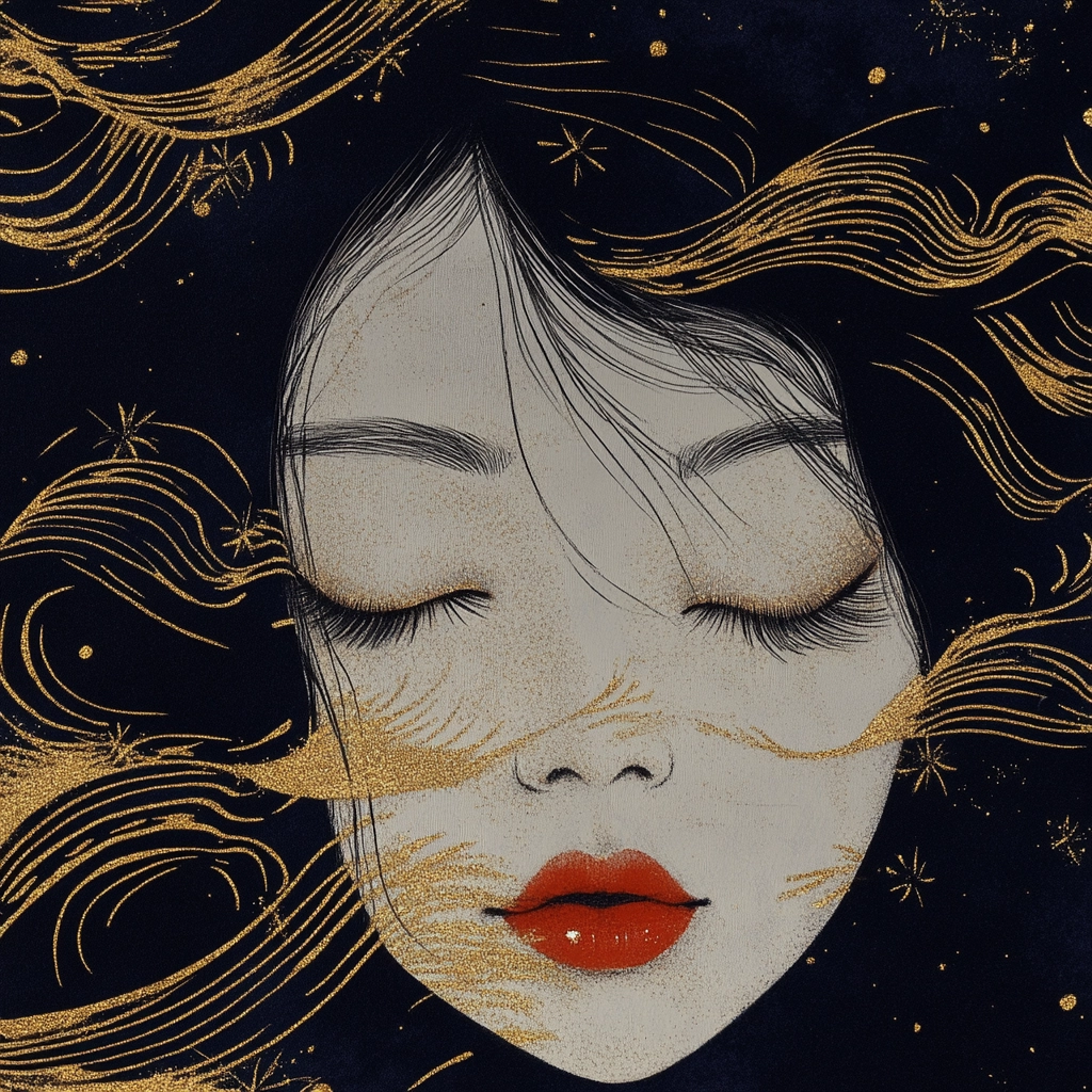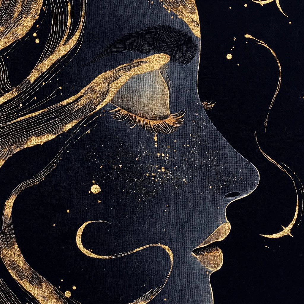 The composition features a striking use of gold against dark blue, enhancing contrast and depth through flowing lines.
