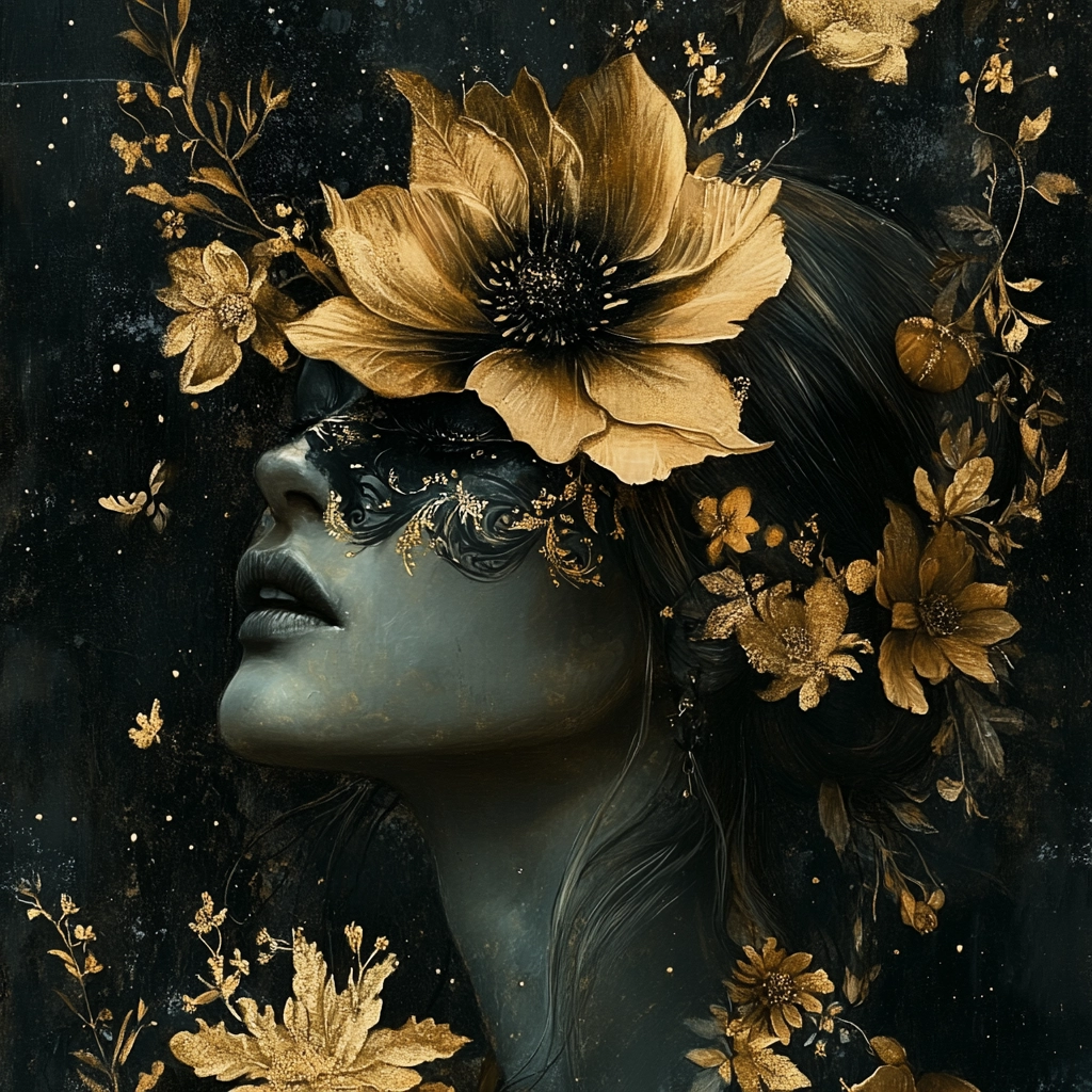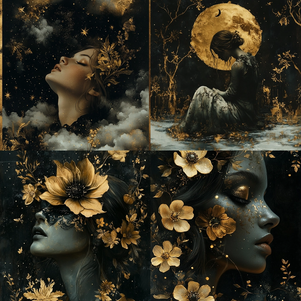 Intricate compositions merge golden elements against dark backgrounds, creating a rich visual effect.