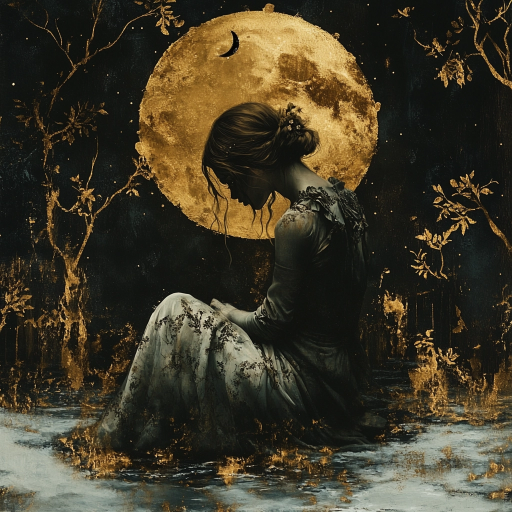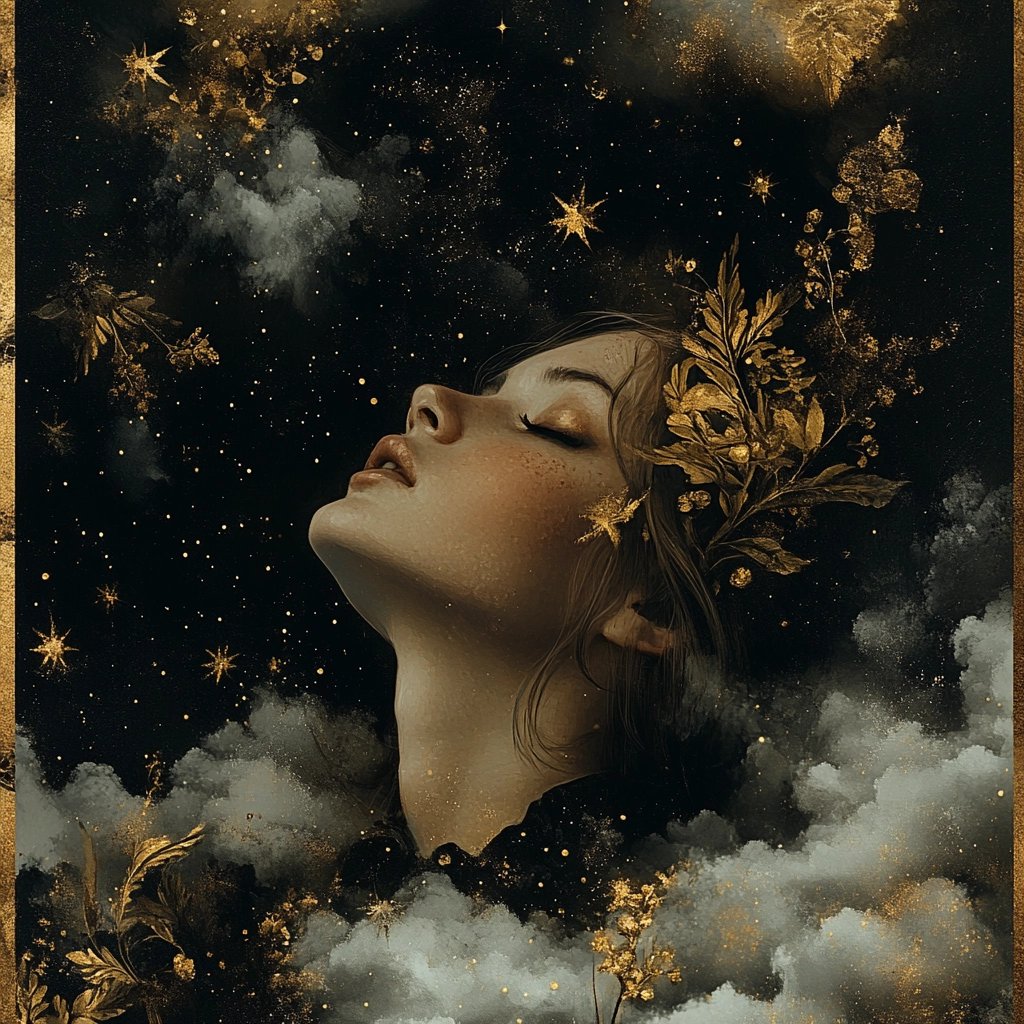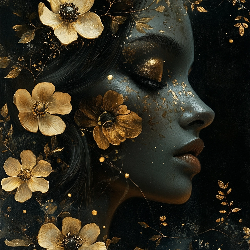 The lighting highlights gold accents, forming a sharp contrast against deep black. Textures range from the soft flow of clouds to the refined details of floral patterns. Spatial depth is achieved through the strategic use of light and shadow, providing a three-dimensional feel.