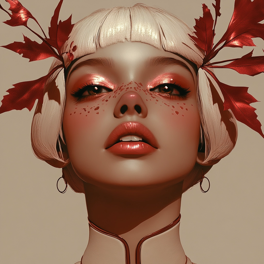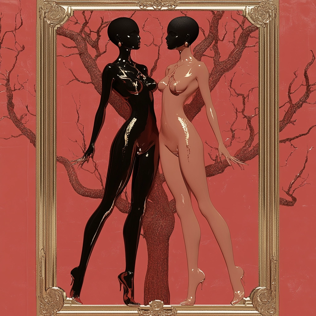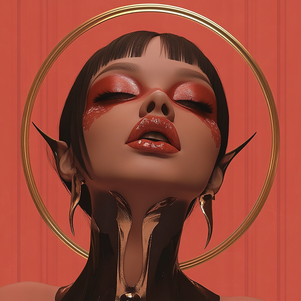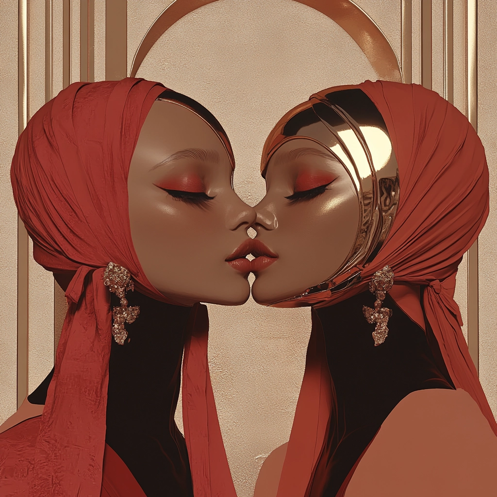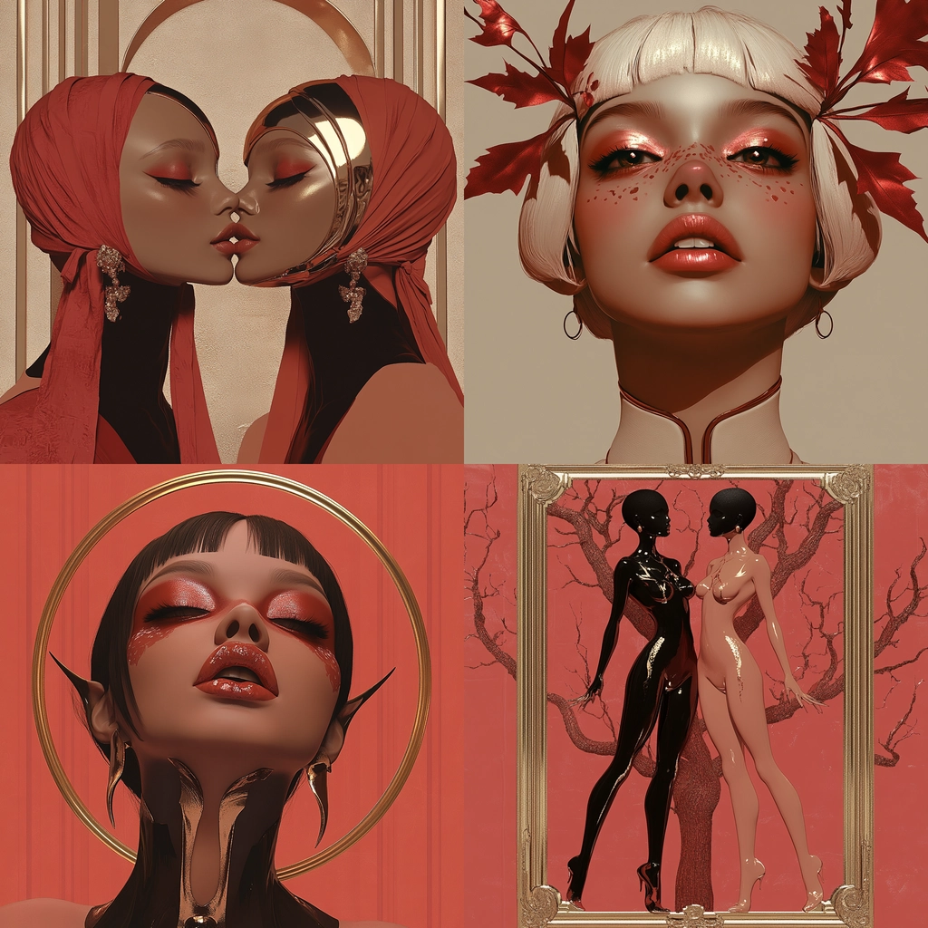 Warm, bold wine-red tones dominate the composition alongside elaborate gold accents, creating a balanced contrast between shadowed and illuminated areas. The textures range from smooth to reflective, enhancing the spatial complexity and dimensionality.