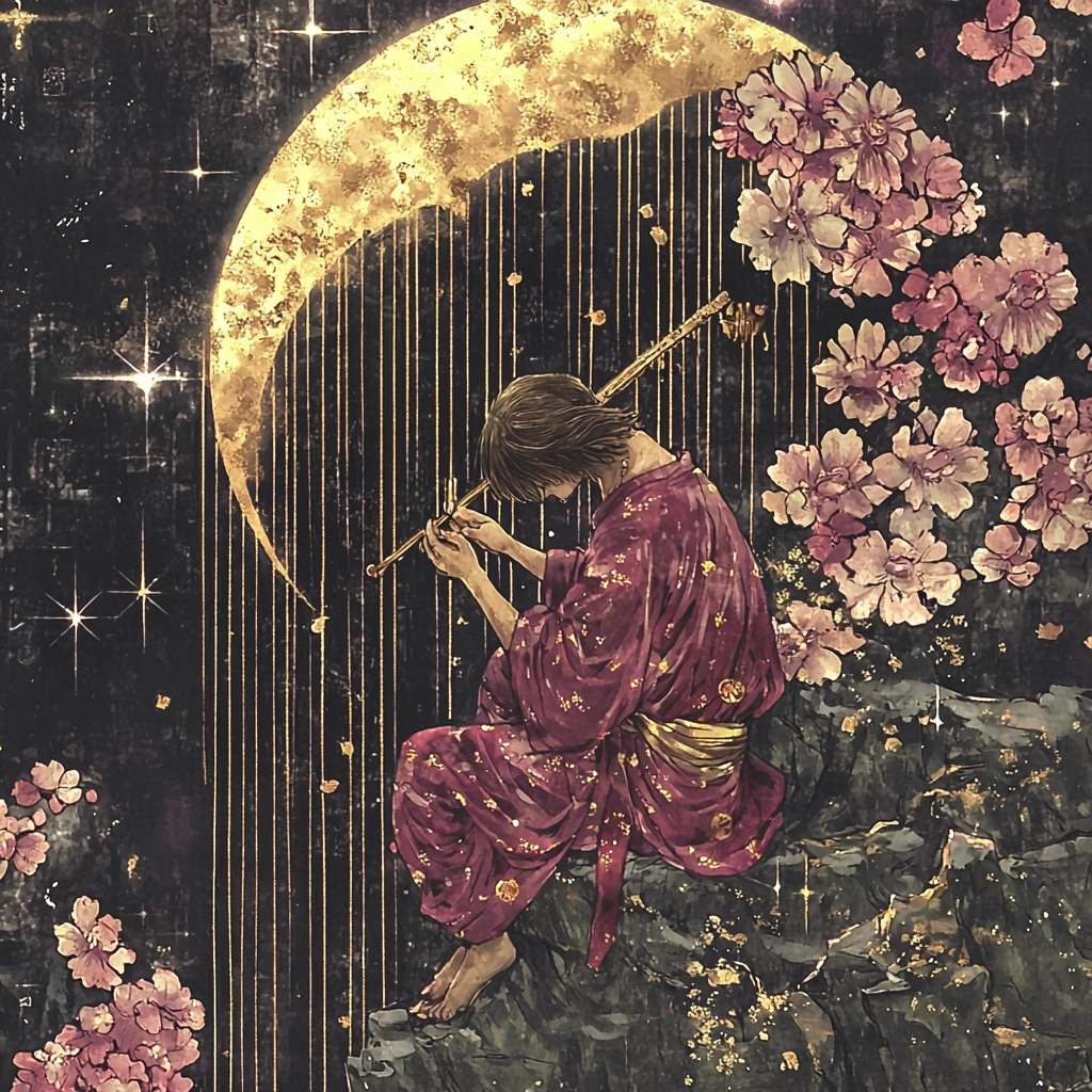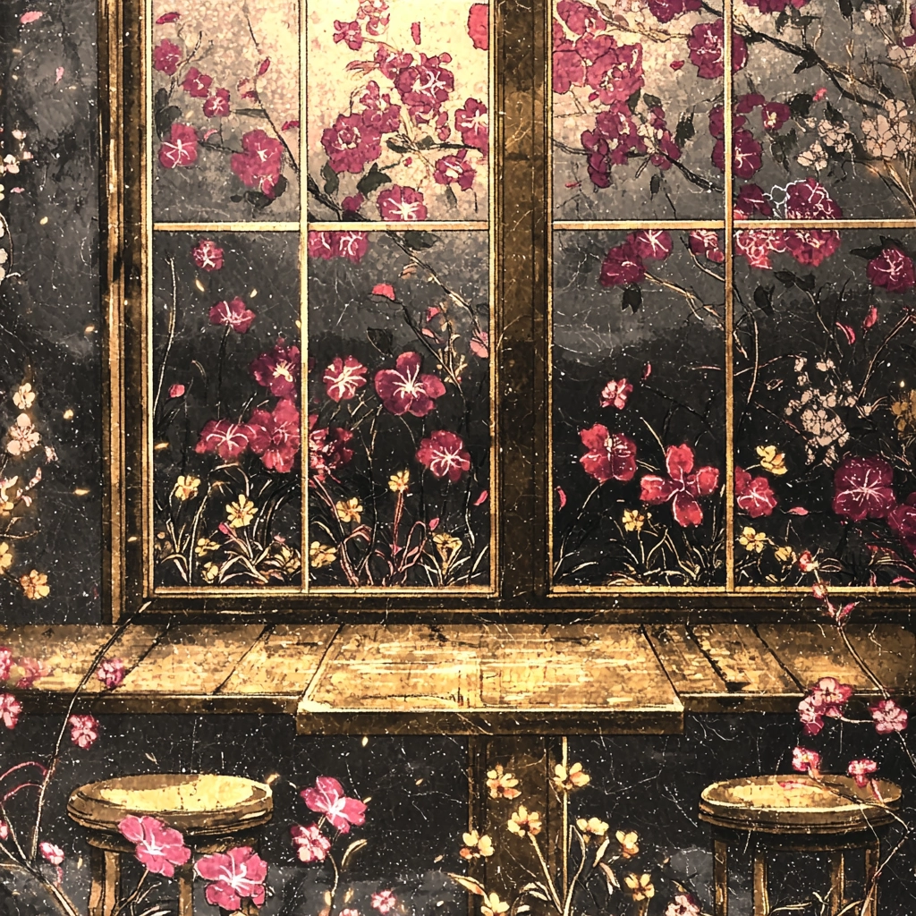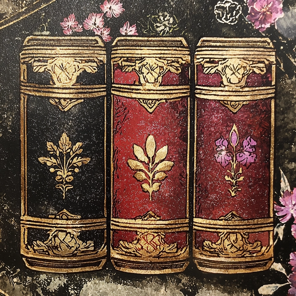 Gold accents illuminate deep wine reds and black backgrounds, blending intricate details with opulent textures.