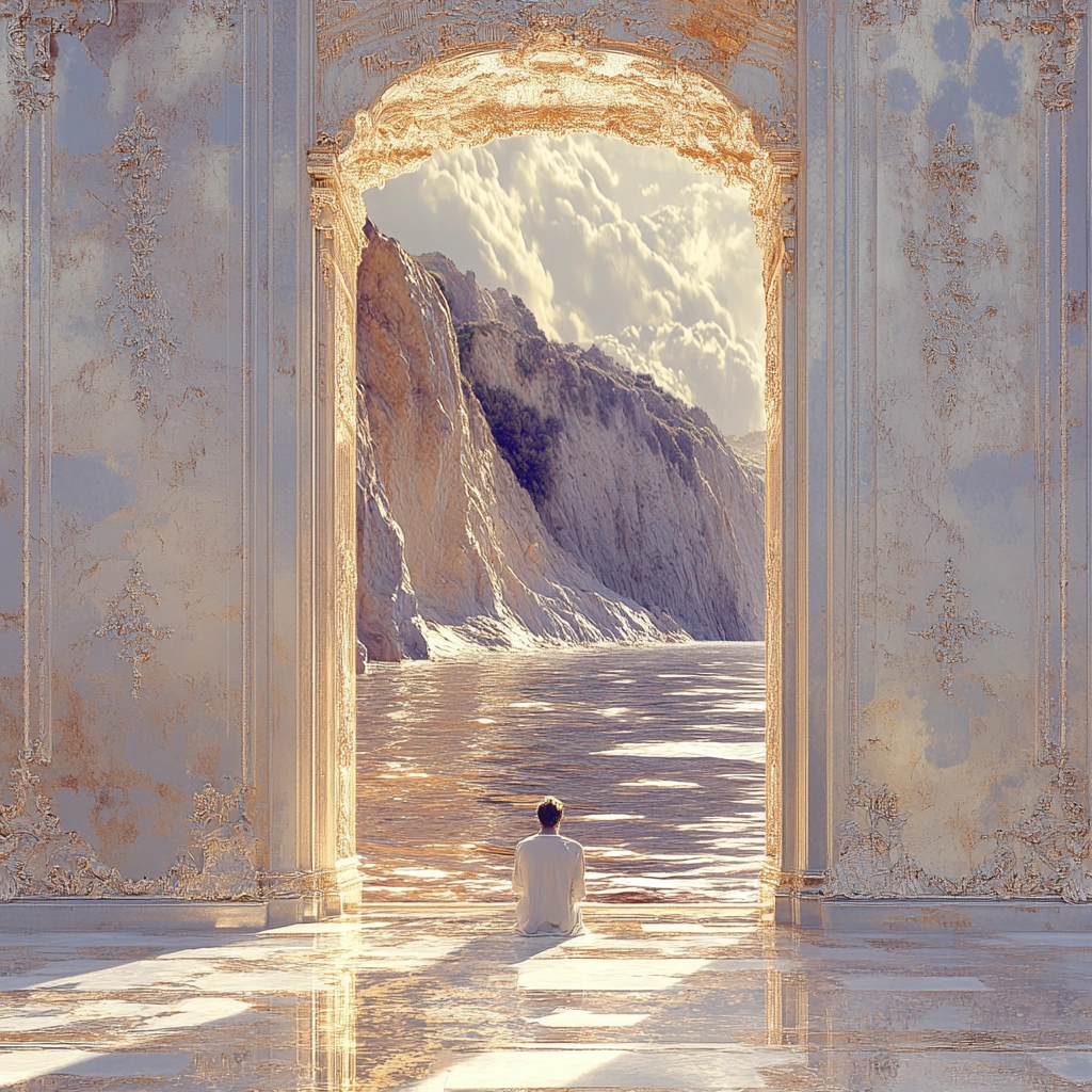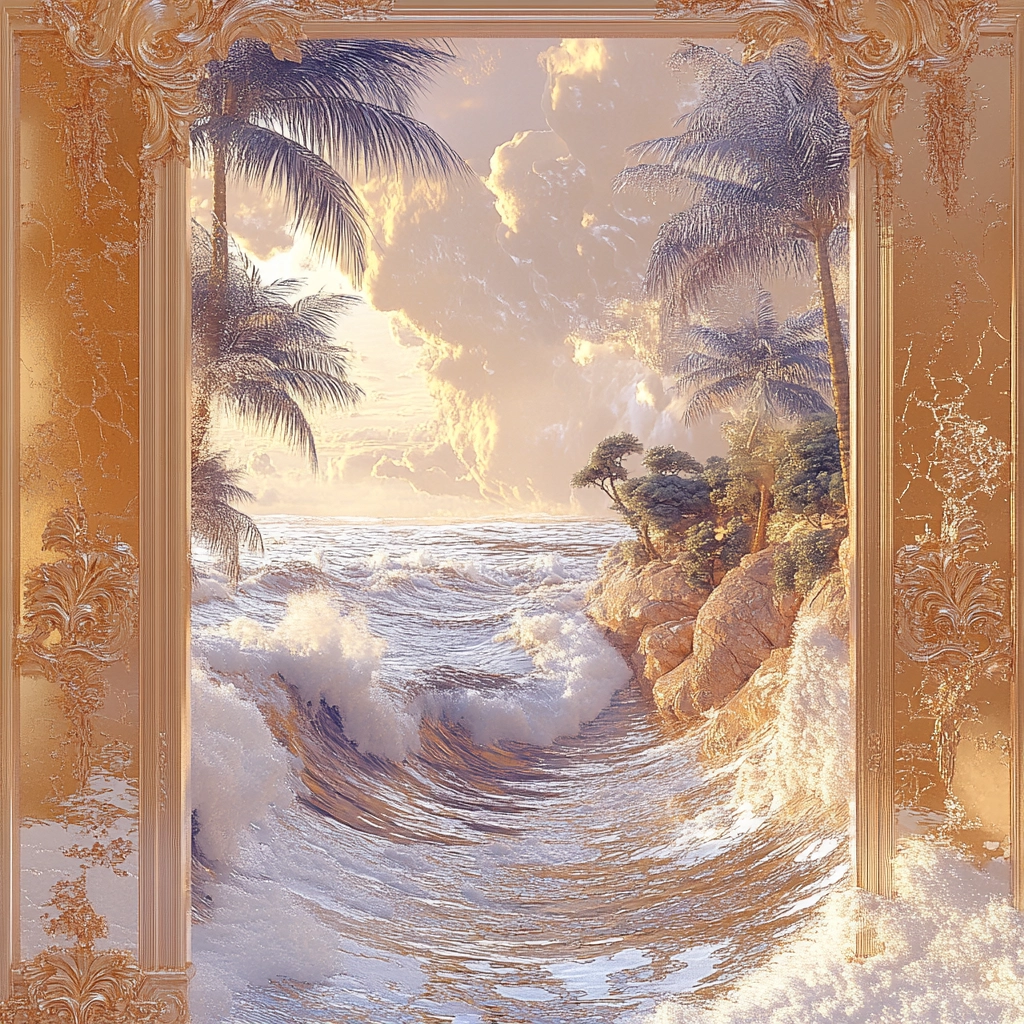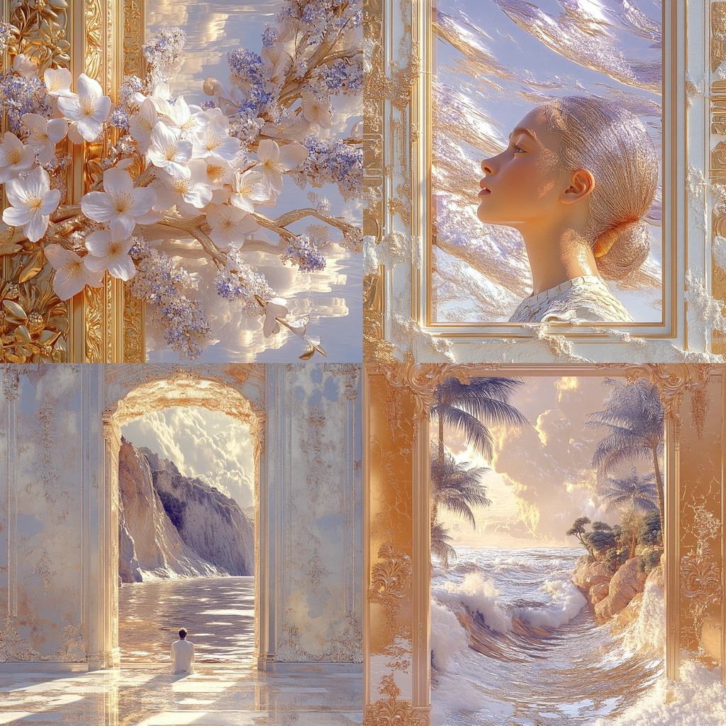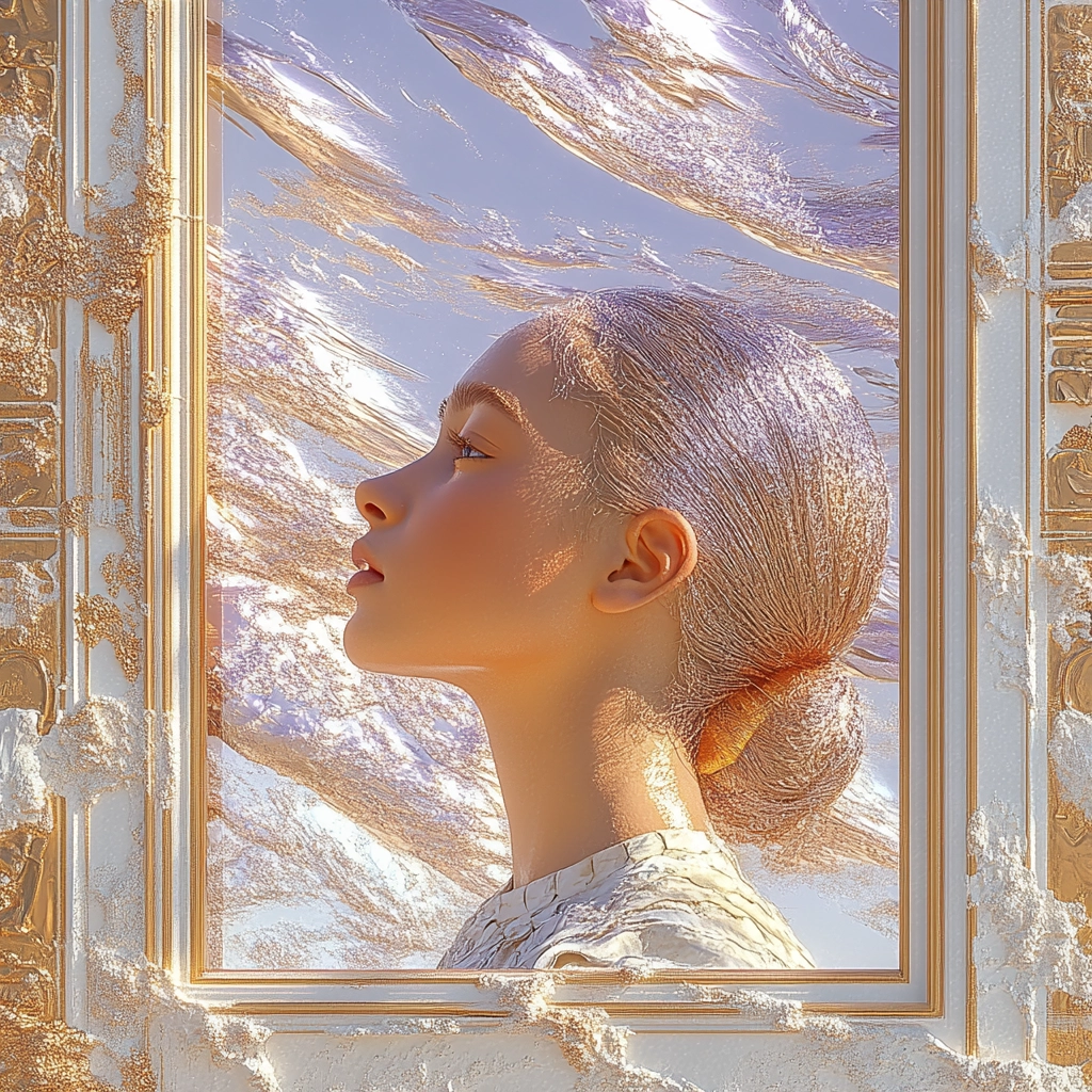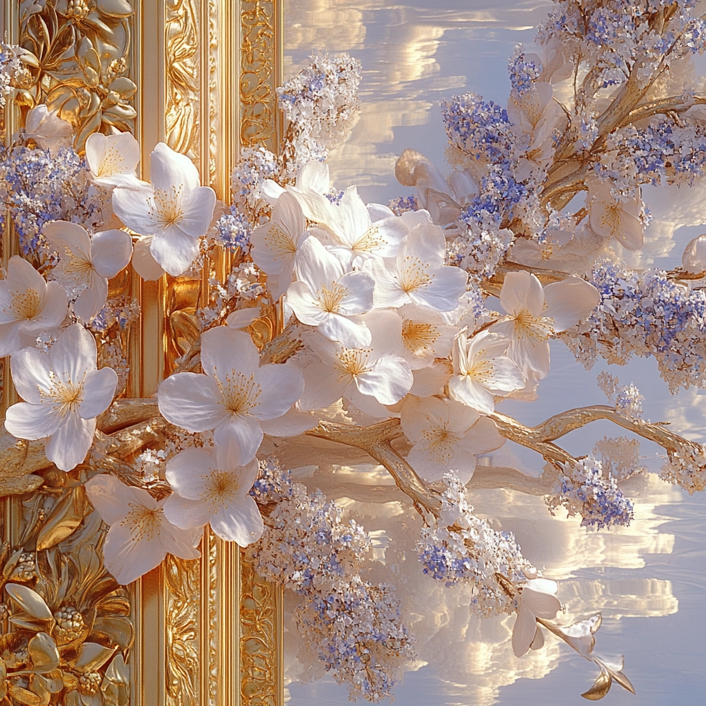 The lighting is soft, providing a warm glow that highlights the golden frames and lilac accents. The use of flowing texture gives a sense of movement and fluidity, creating an immersive spatial experience within the composition.