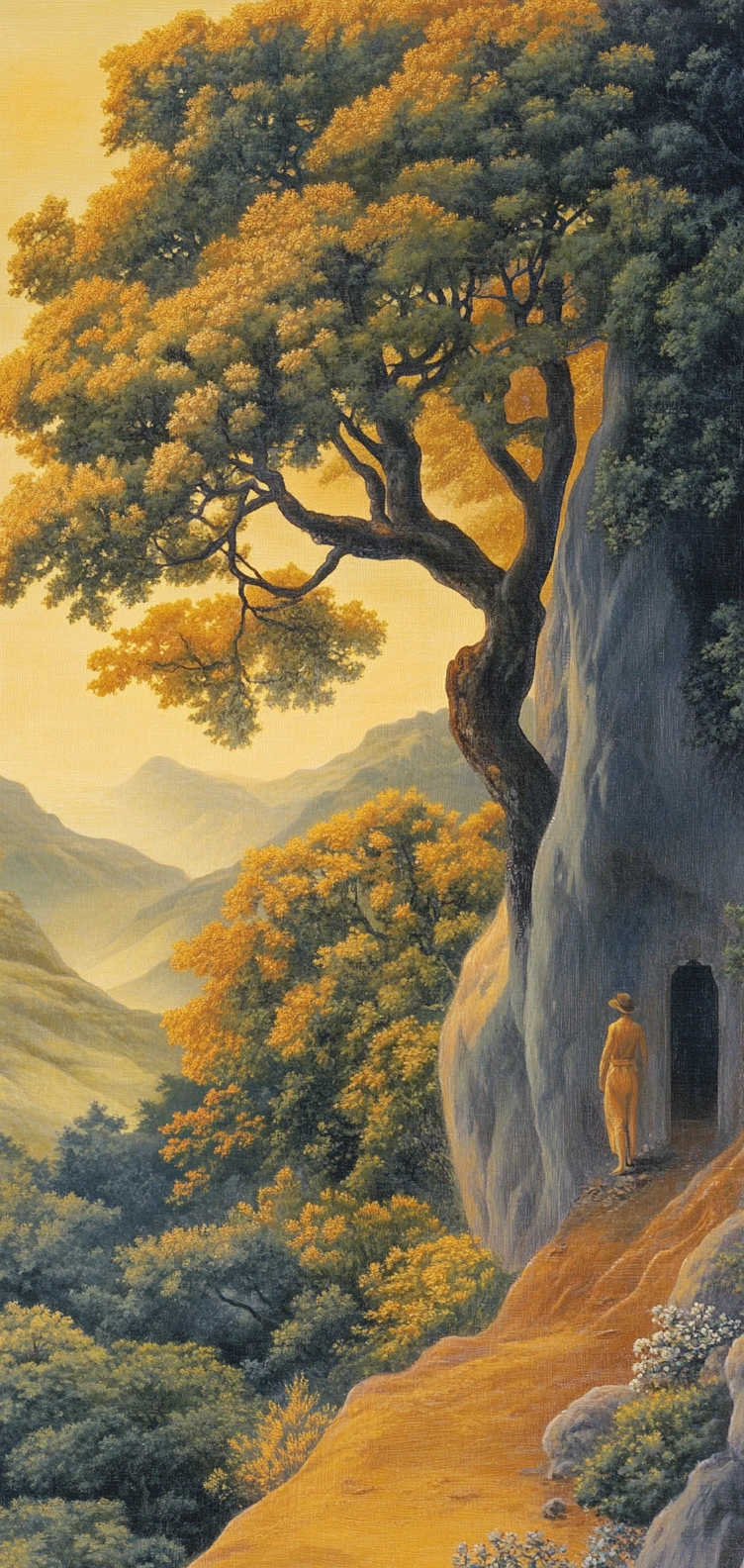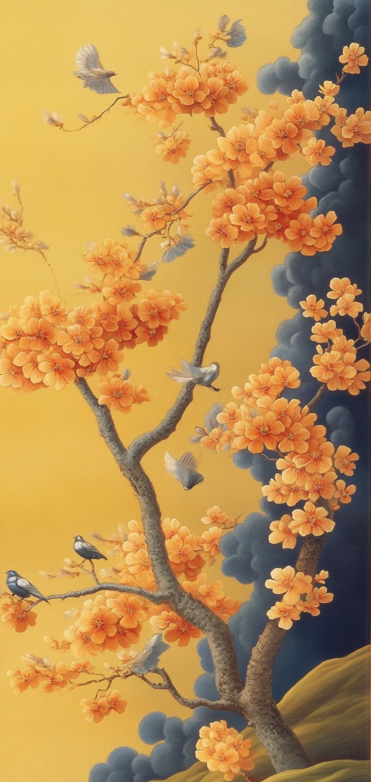 The lighting emphasizes the warm glow of autumn colors, creating depth within the layered composition. Soft textures dominate, blending shadows and highlights which enhance the intricate details and spatial sense.